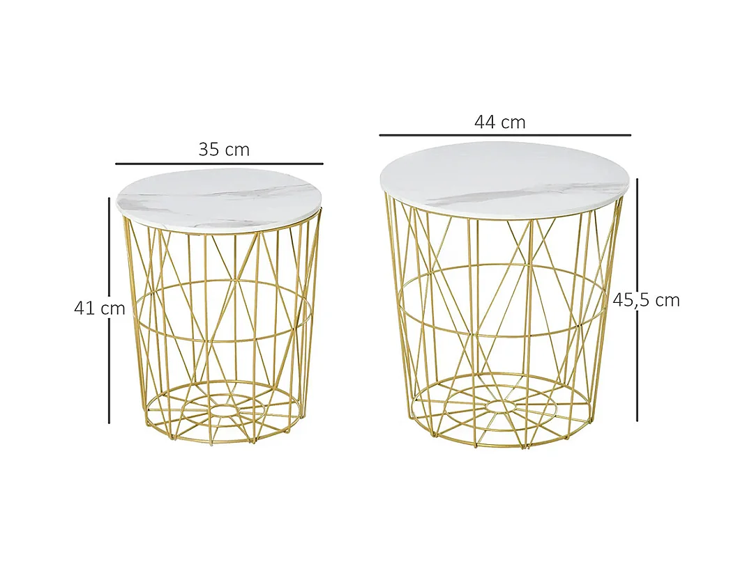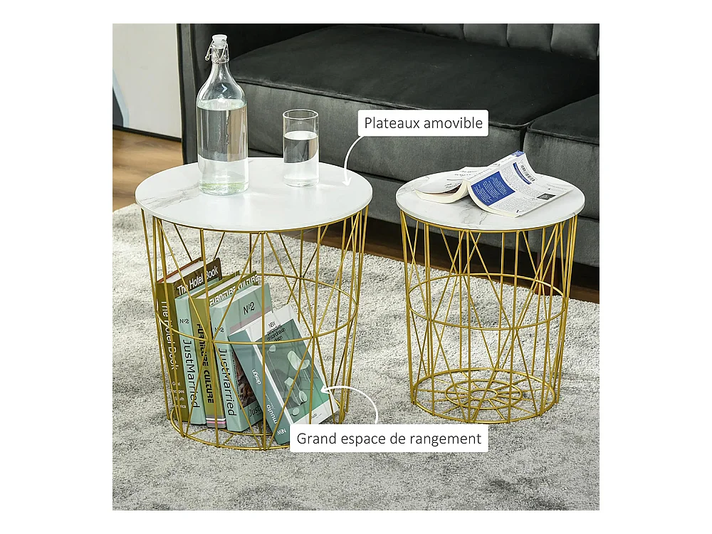 Lot de 2 tables basses tables d'appoint gigognes encastrables structure en acier et plateau en bois aspect marbre or