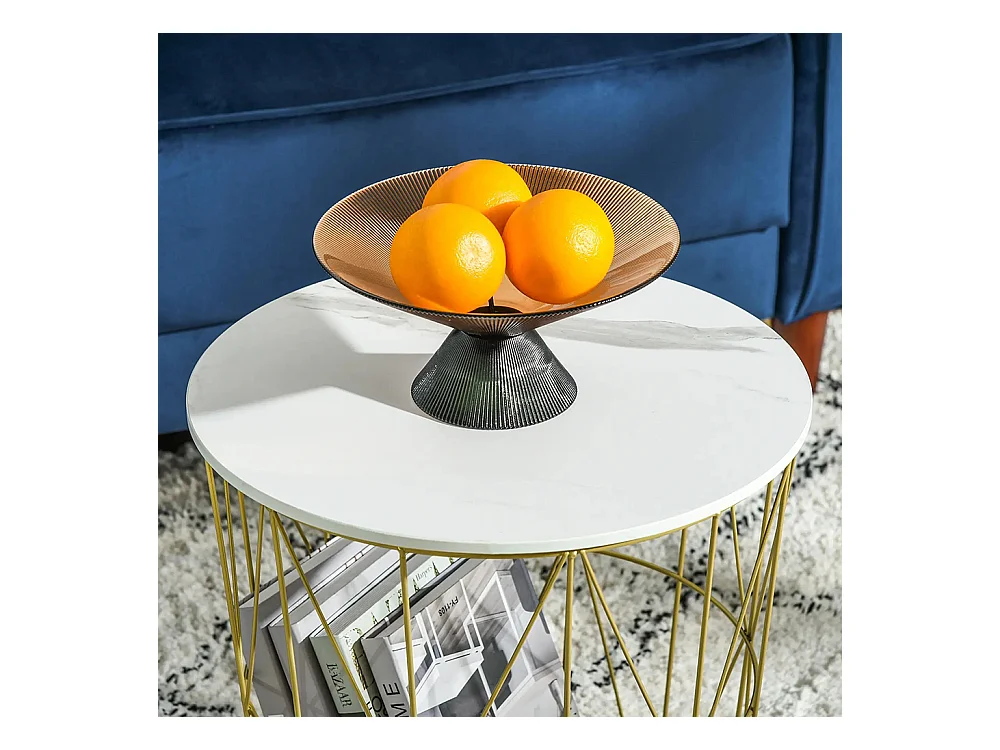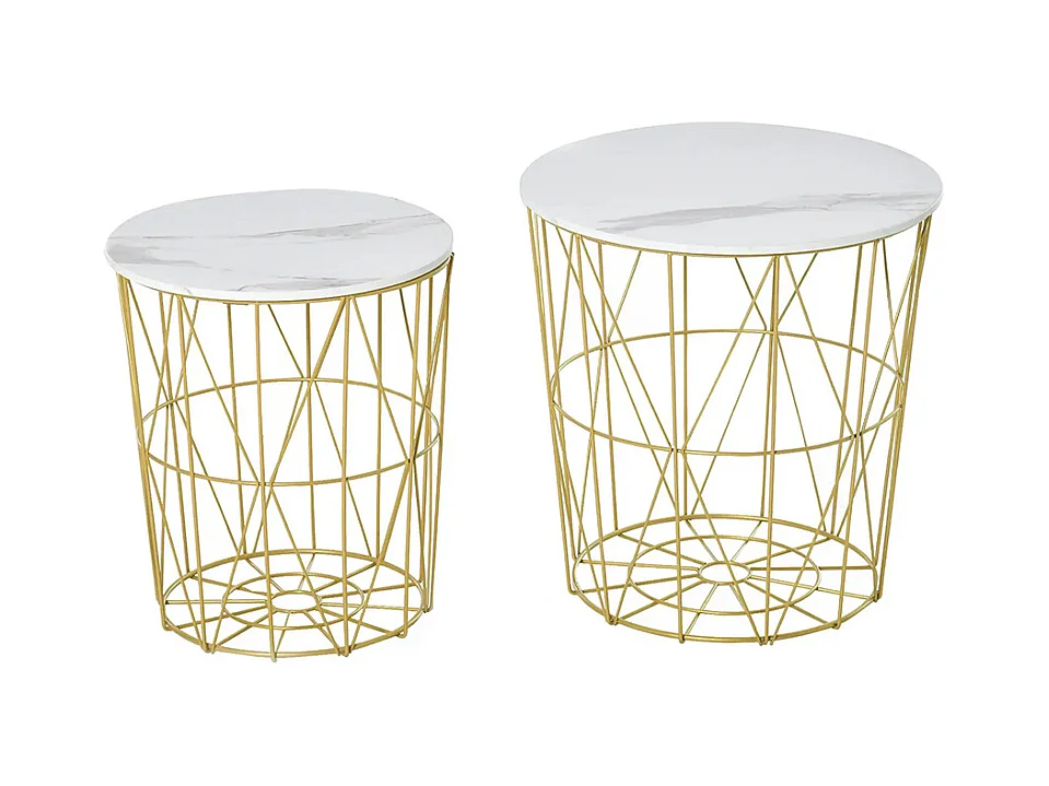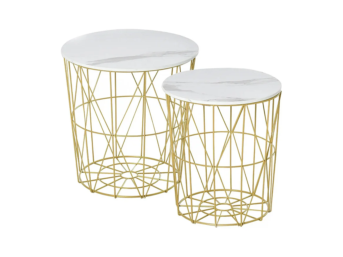 Lot de 2 Tables Basses gigognes - Tables d'appoint Rondes encastrables Style néo-rétro Bicolore Structure métal doré Plateau MDF Aspect marbre Blanc