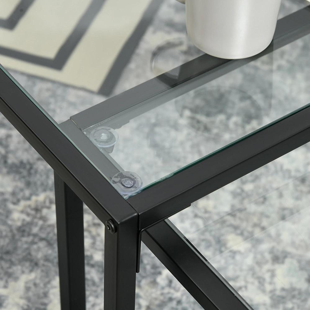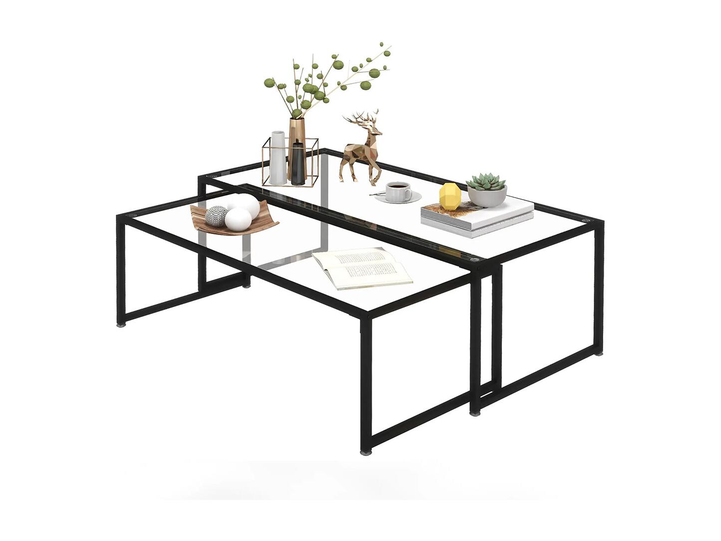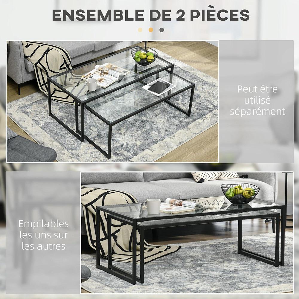 Lot de 2 tables basses gigognes tables de salon rectangulaires design en acier noir et plateaux en verre trempé