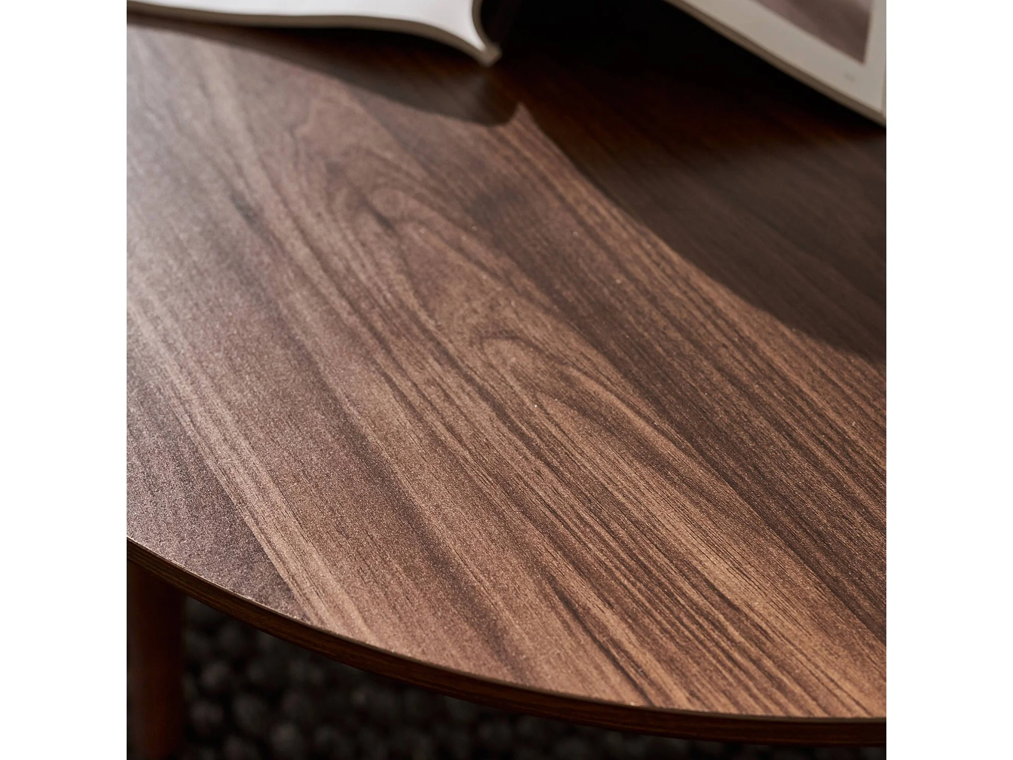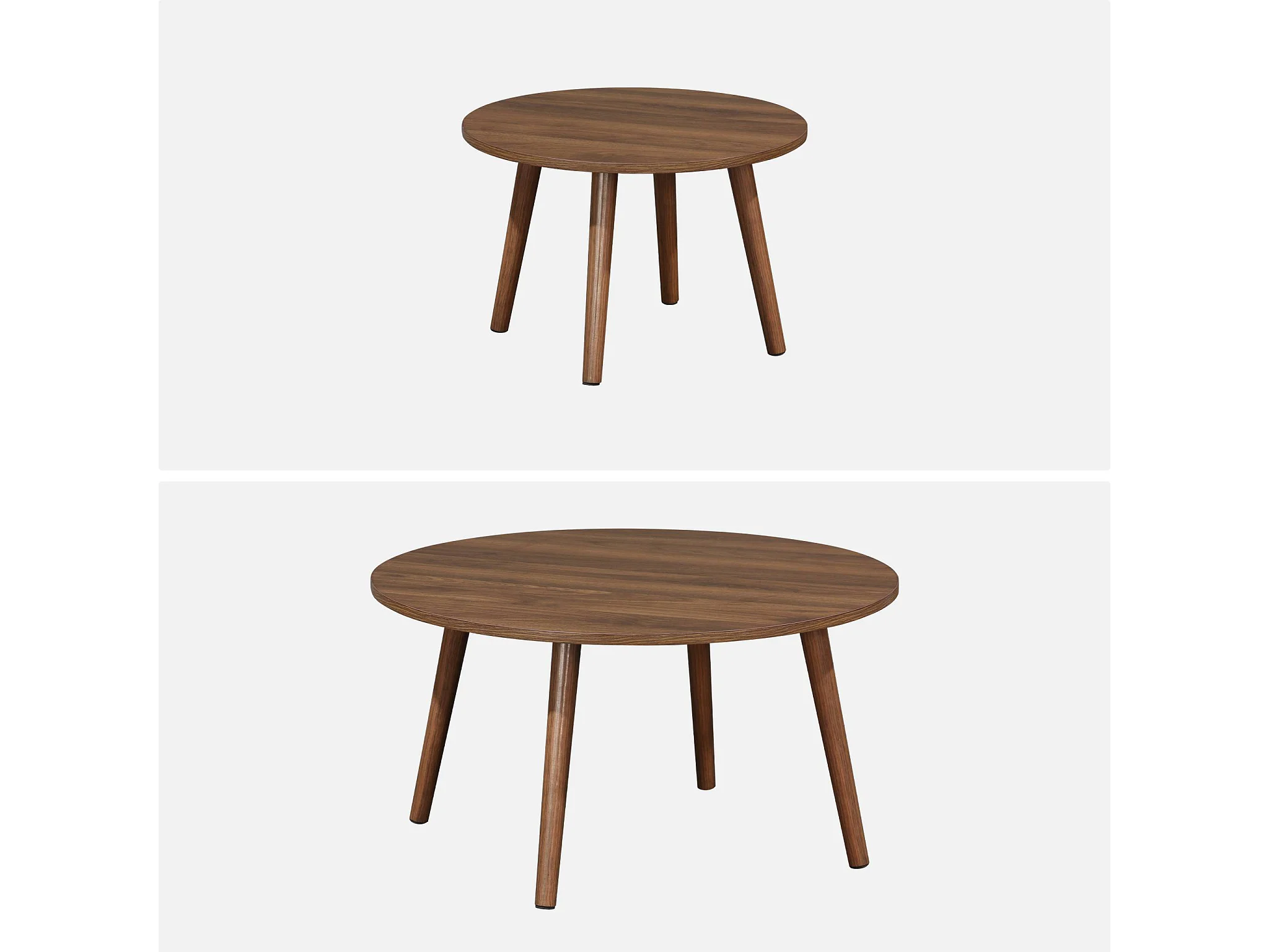 Set de 2 tables basses rondes plateau effet bois noyer et pieds en bois de sapin. Ø40cm et Ø60cm