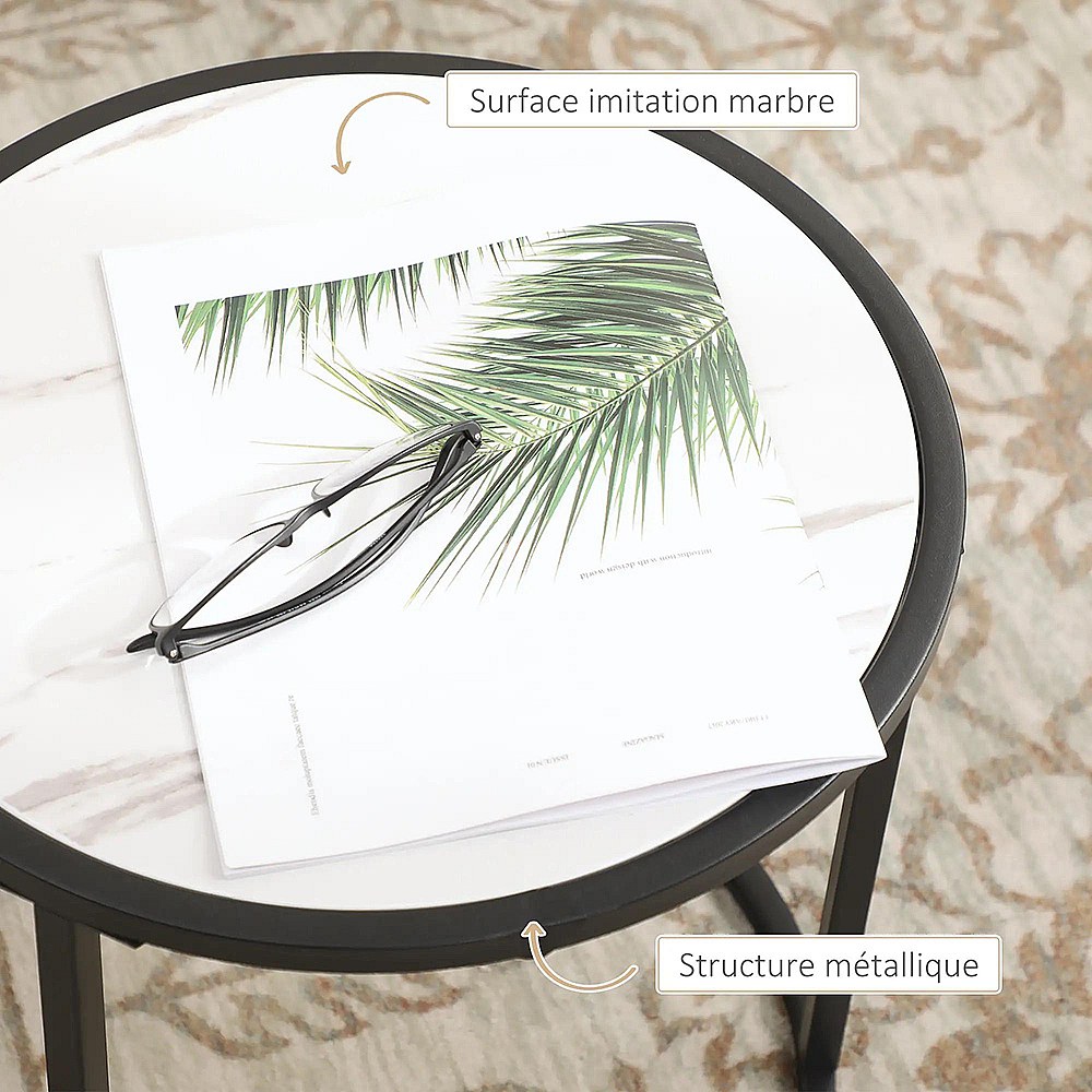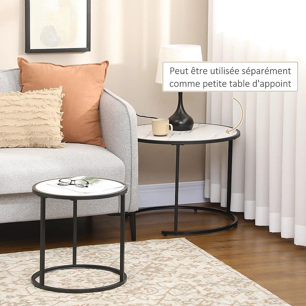 Lot de 2 tables basses gigognes rondes placage marbre blanc, cadre en métal noir