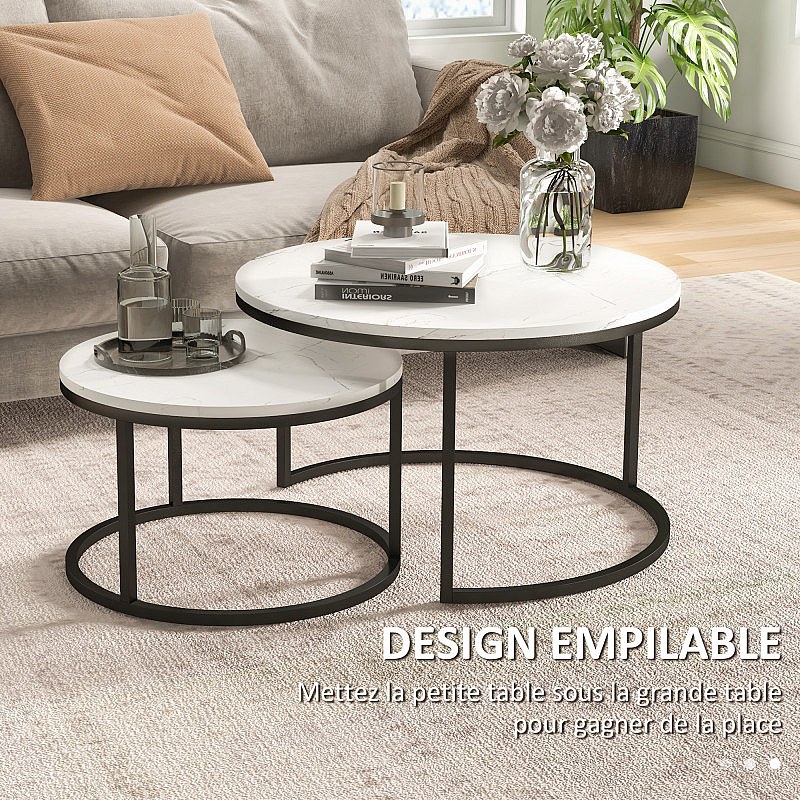 Lot de 2 table basse gigogne - effet marbre - structure en métal - Blanc & Doré