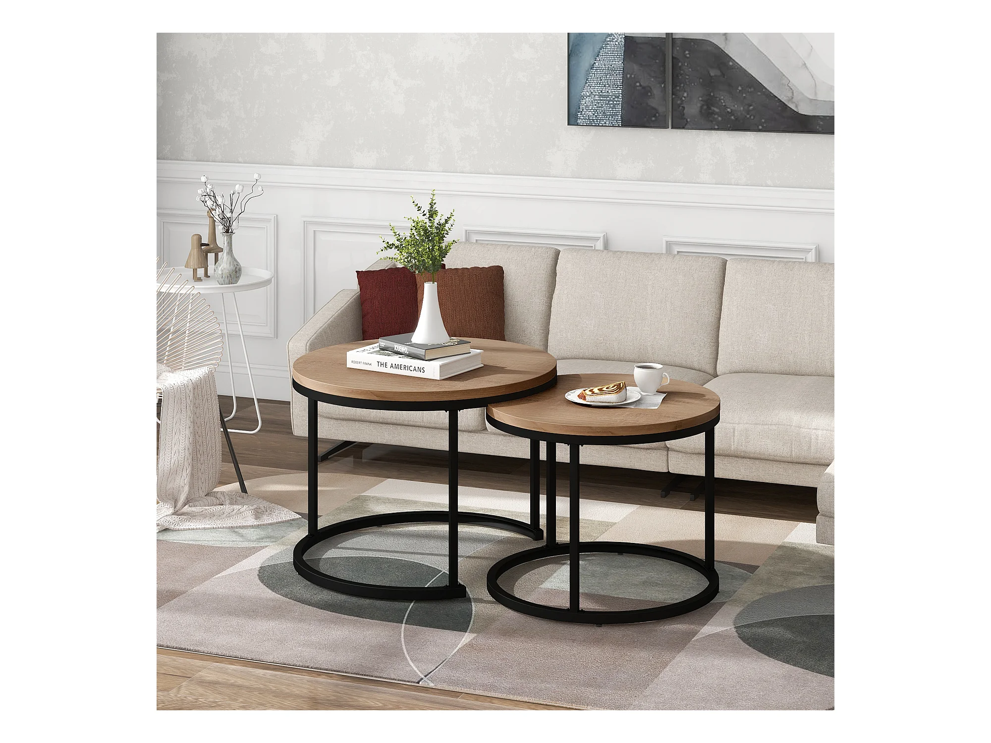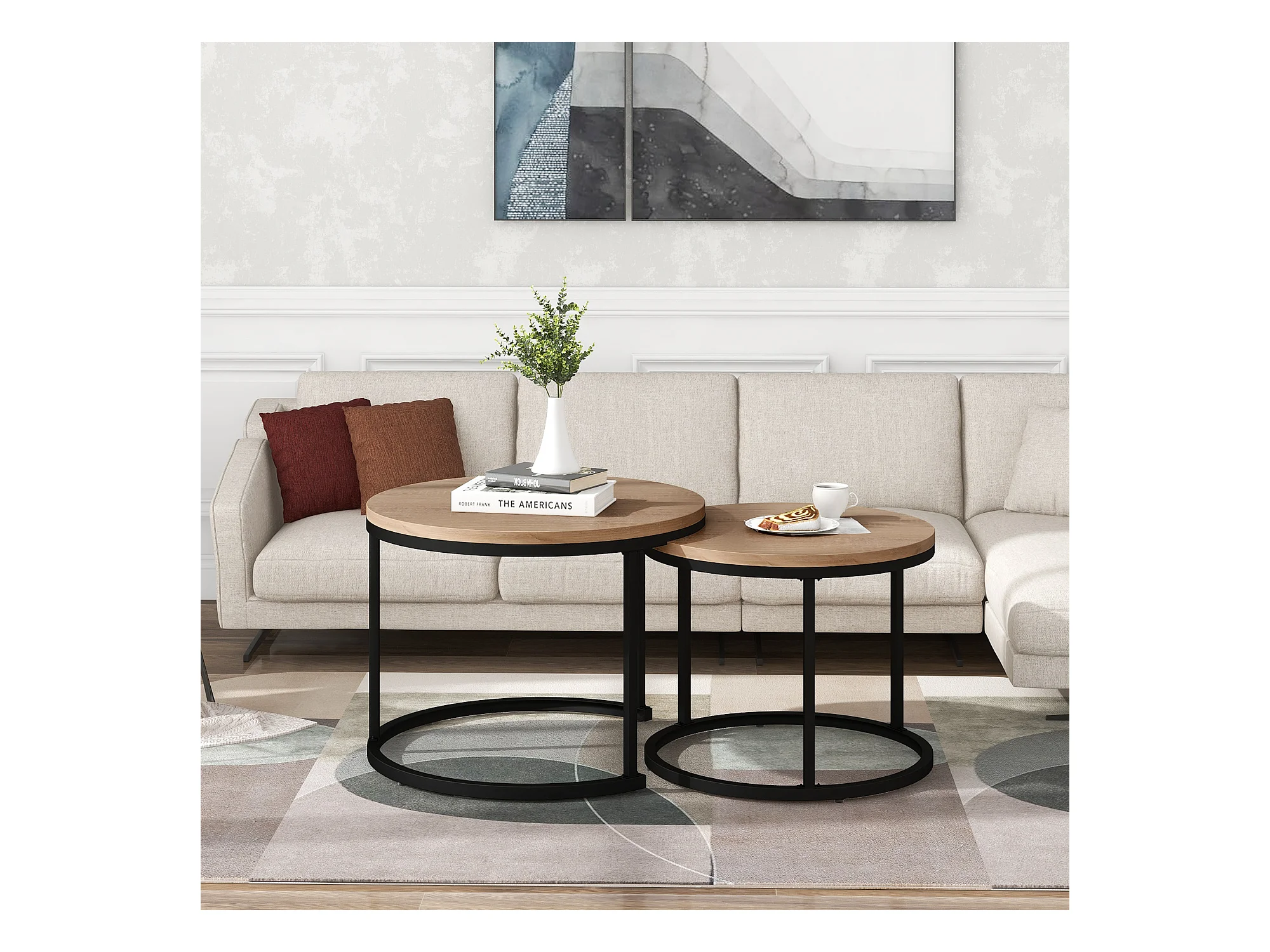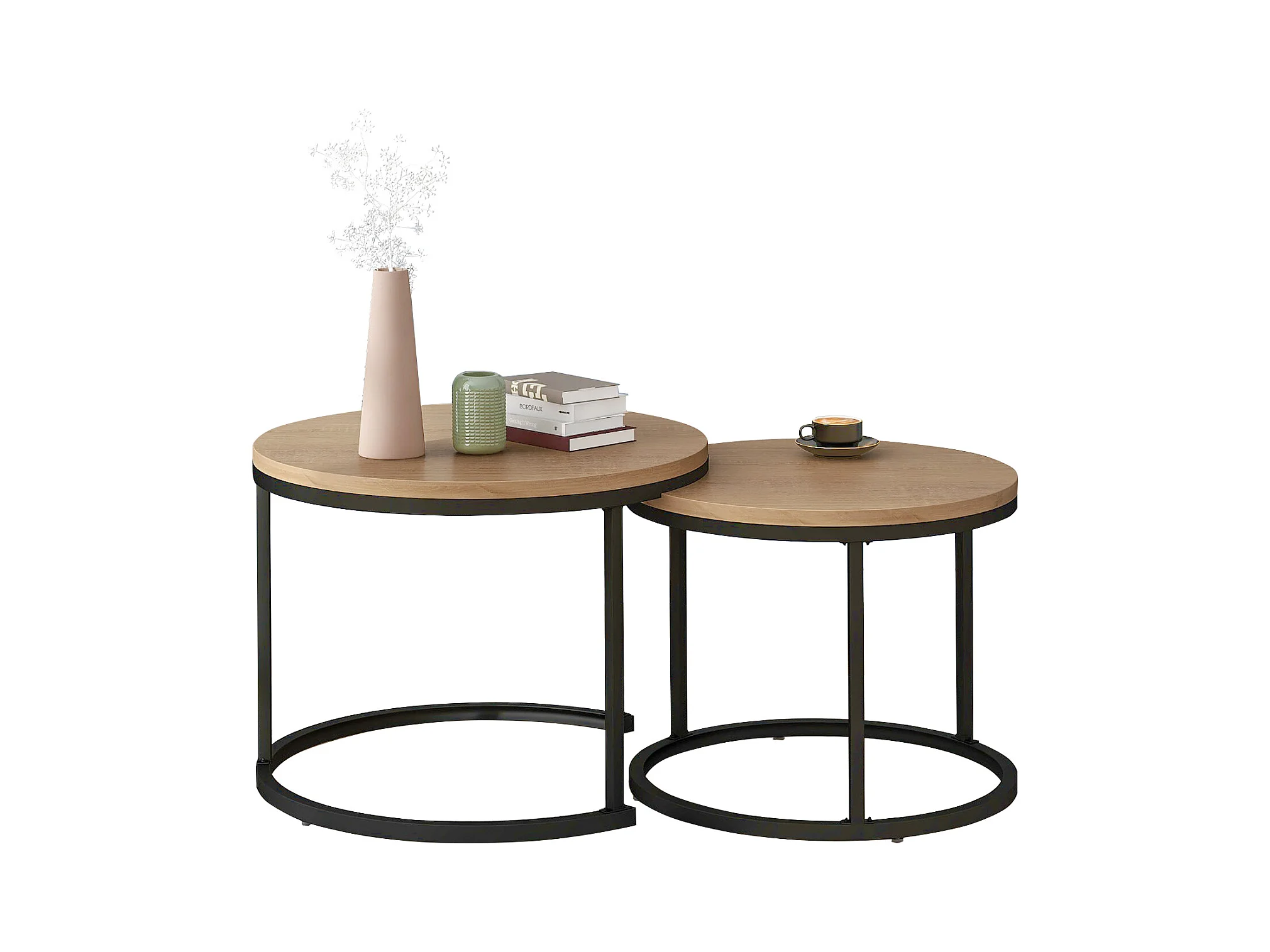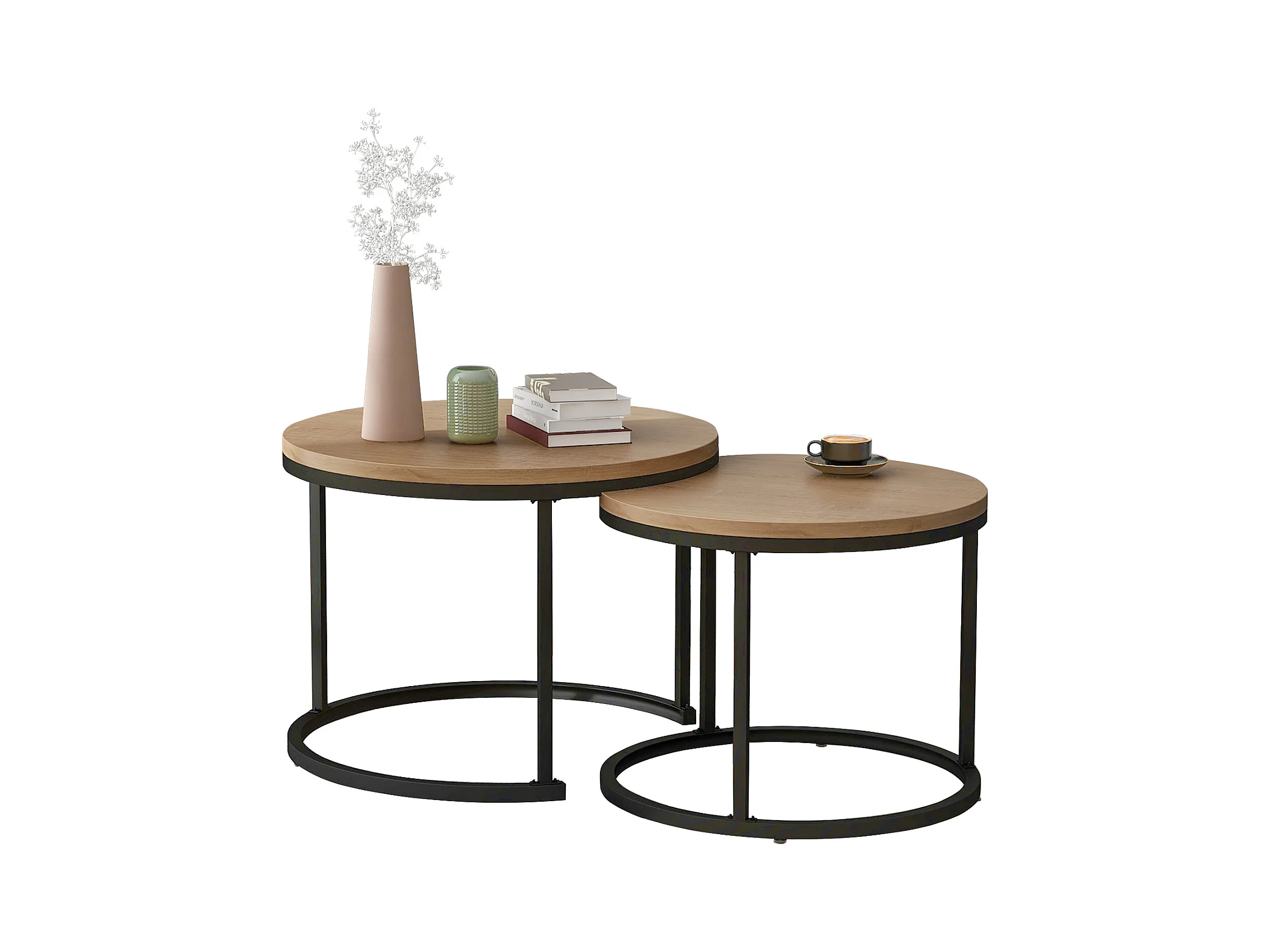 Lot de 2 tables basses gigognes rondes woodgrain naturel clair, cadre en métal noir