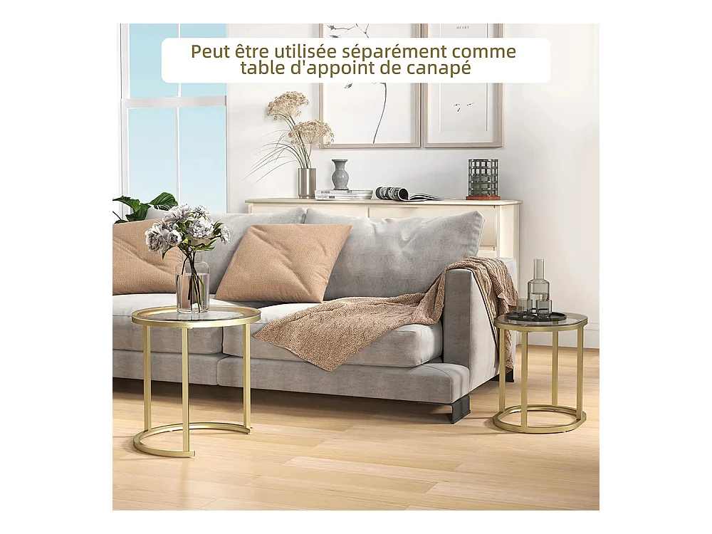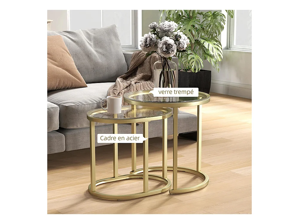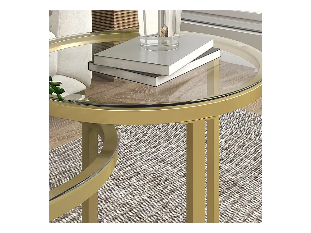 Lot de 2 tables basses tables d'appoint gigognes encastrables structure en acier et plateau verre trempé transparent or