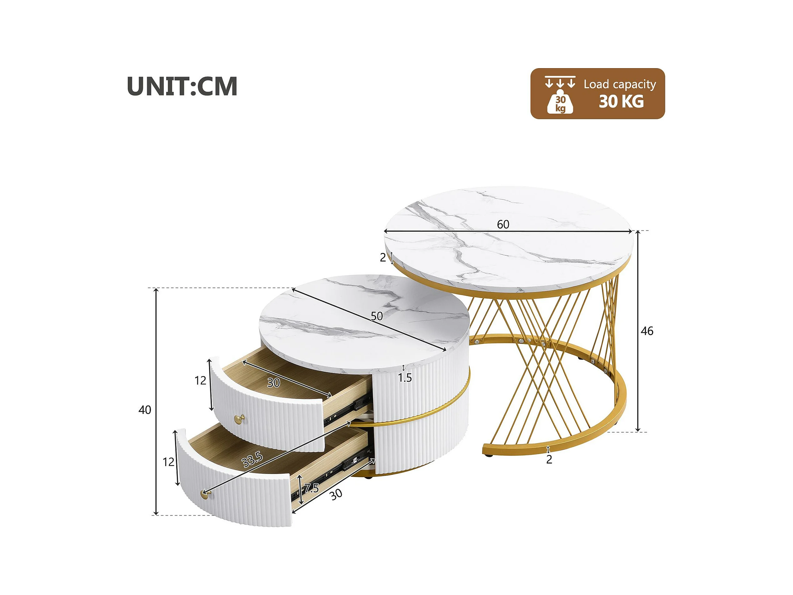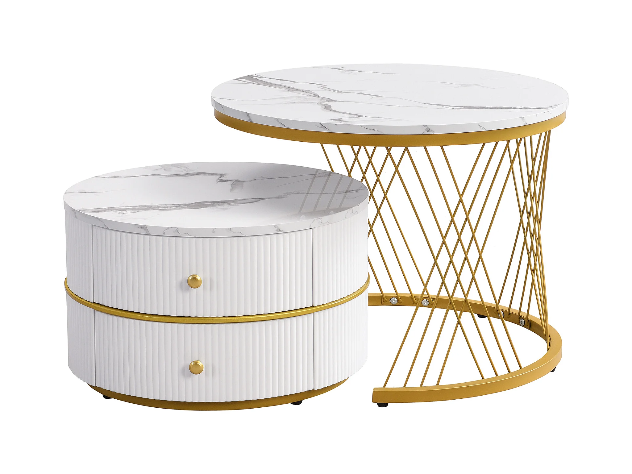 Lot de 2 tables gigognes - 2 tiroirs - plateau à motif de marbre - Blanc & Doré