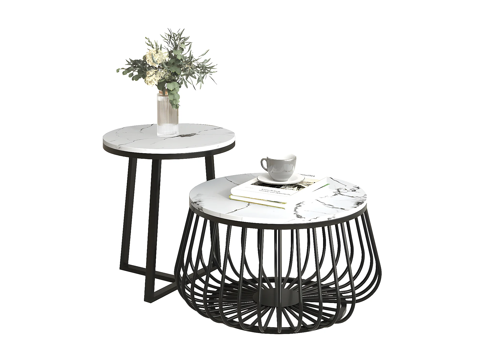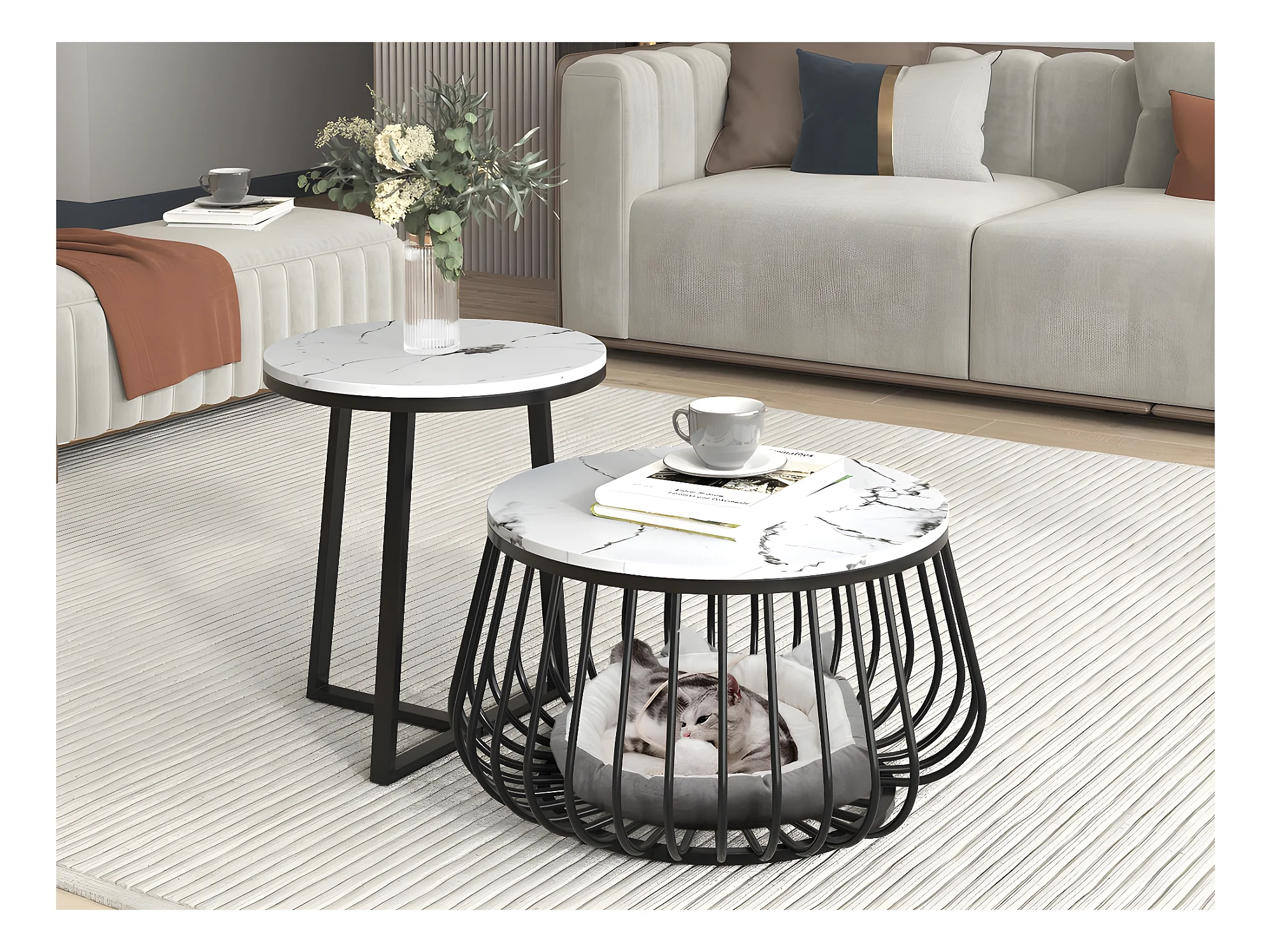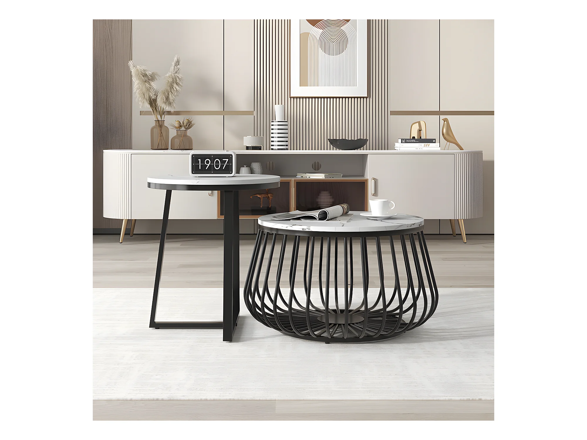 Lot de 2 Tables gigognes - plateau en MDF à motif de marbre - Blanc