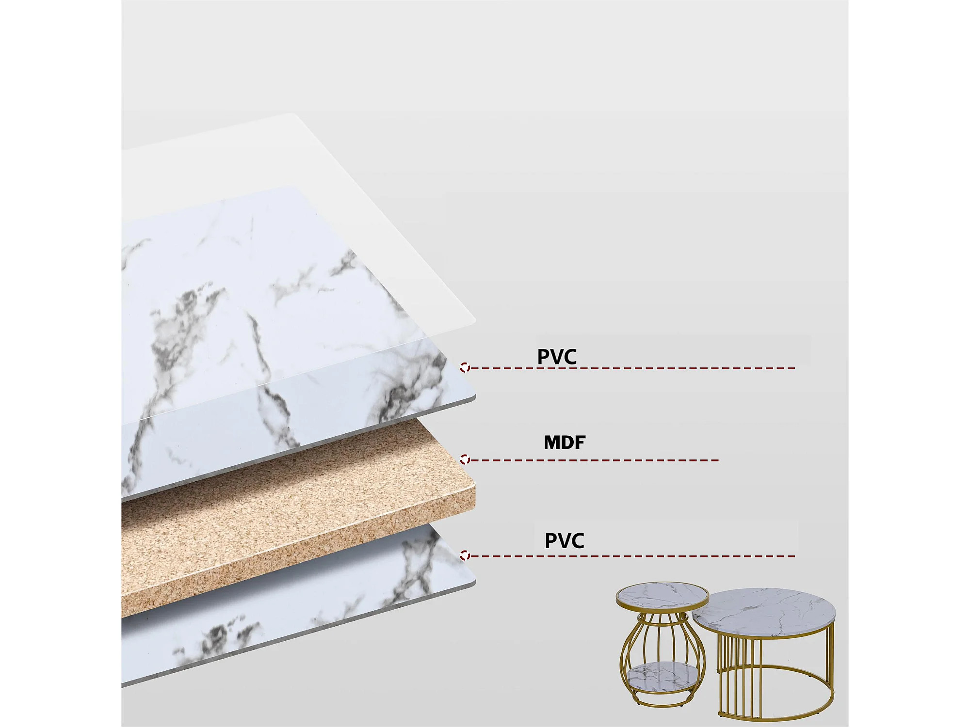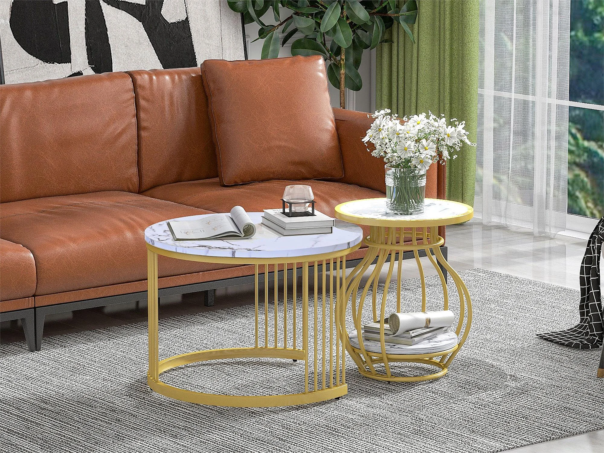 Lot de 2 tables gigognes rondes - placage à motif de marbre - structure en métal - Blanc & Doré