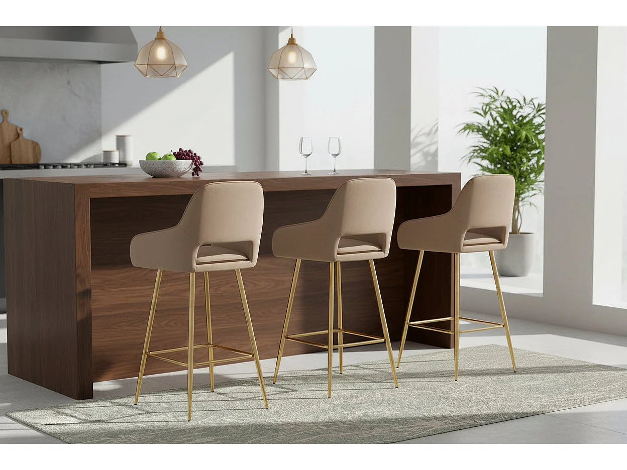 Lot 2 Tabourets de Bar Athena Velours Taupe Pieds Gold 47x41x104cm