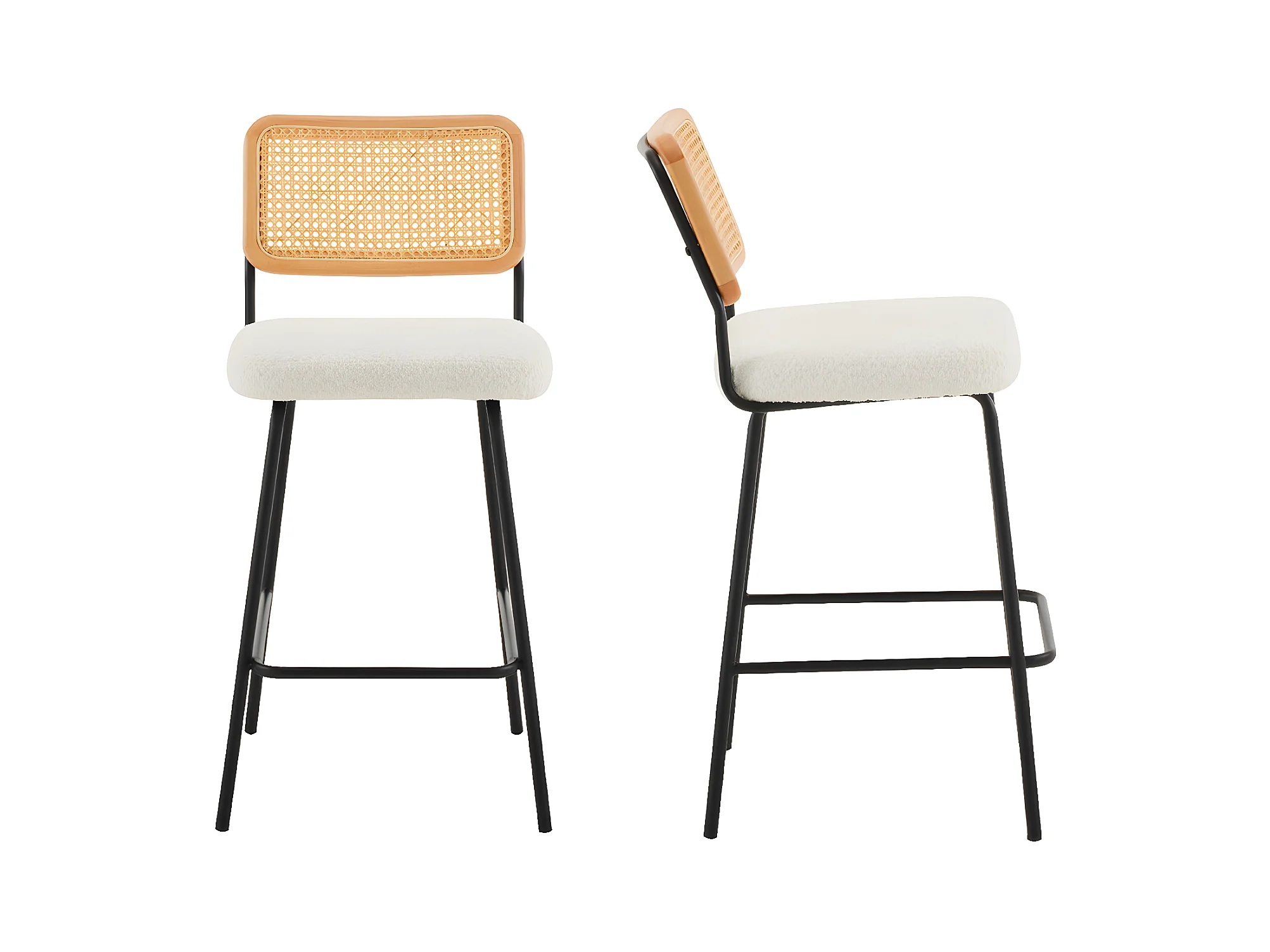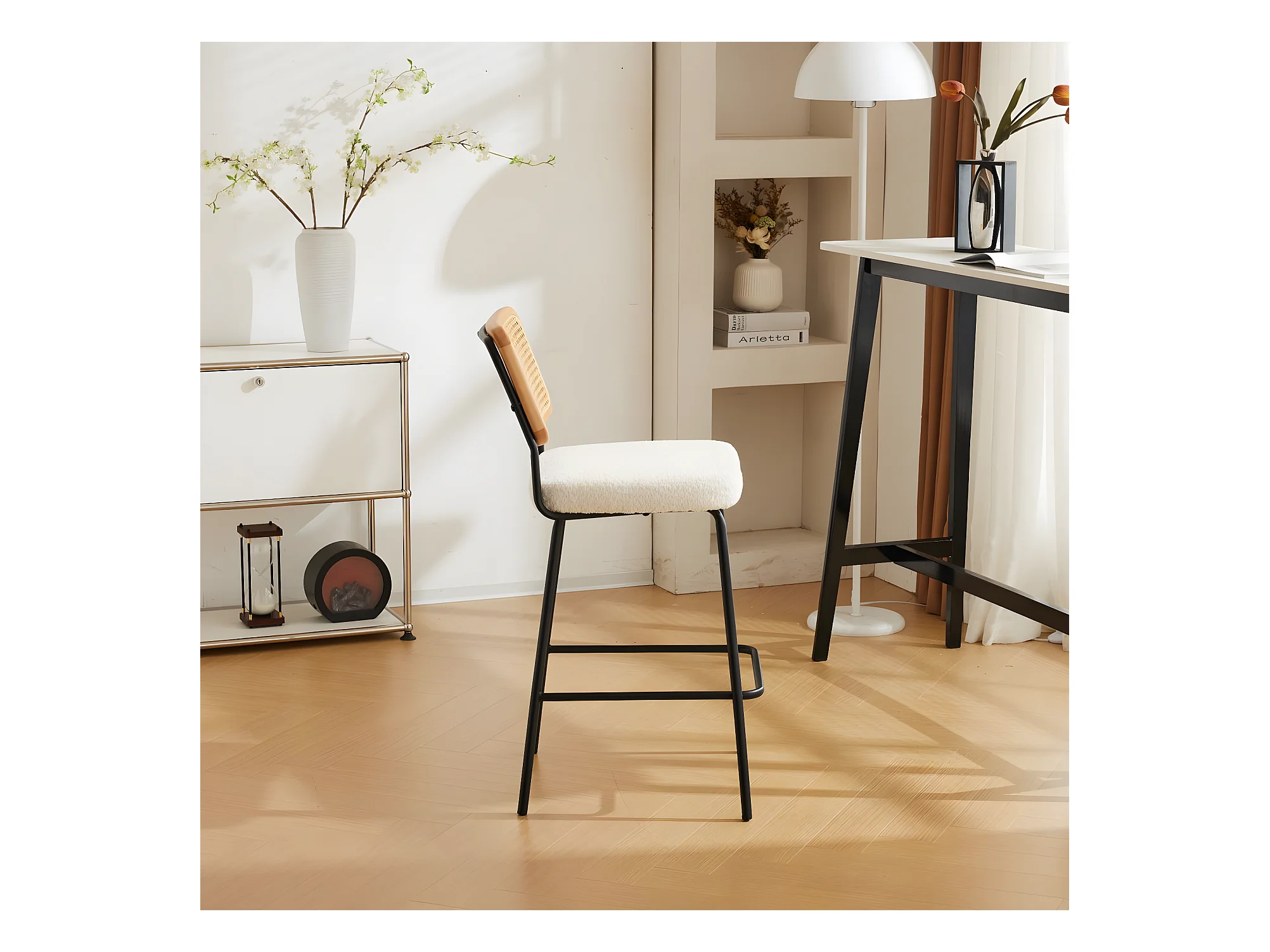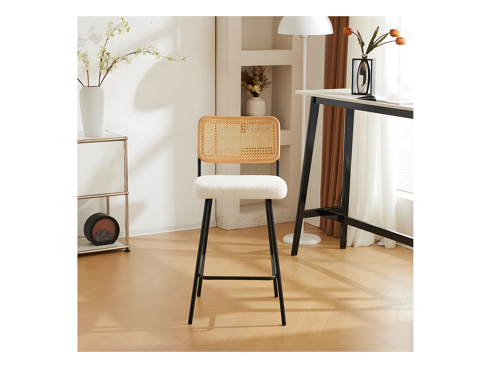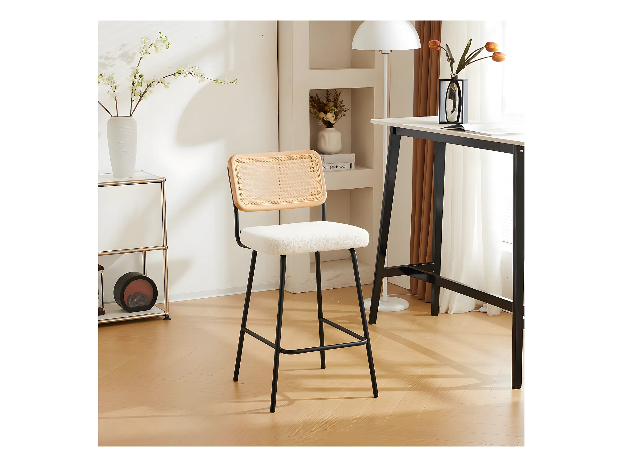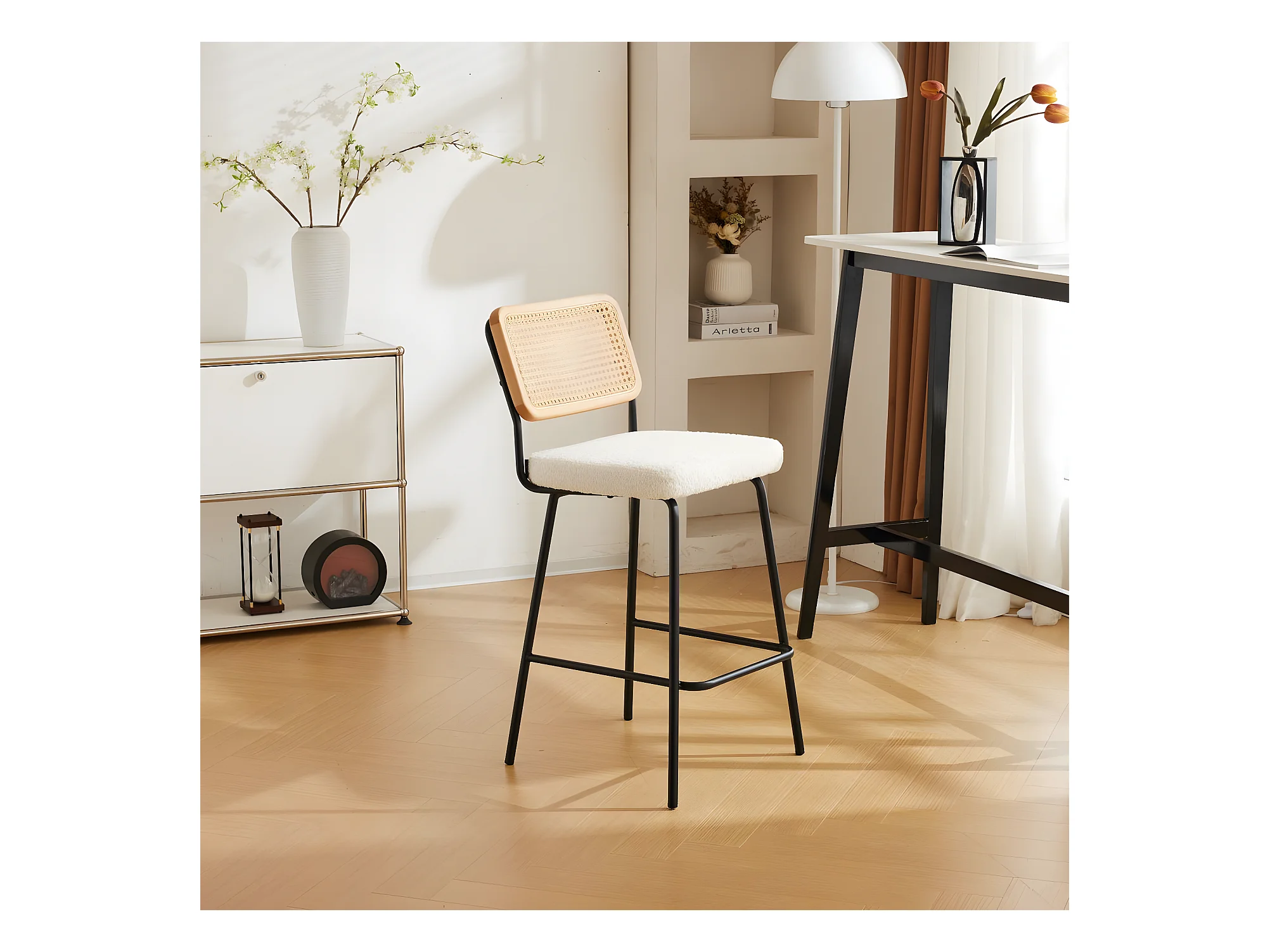 Lot de 2 chaises de bar en cannage et tissu bouclé beige, piètement noir - Muse