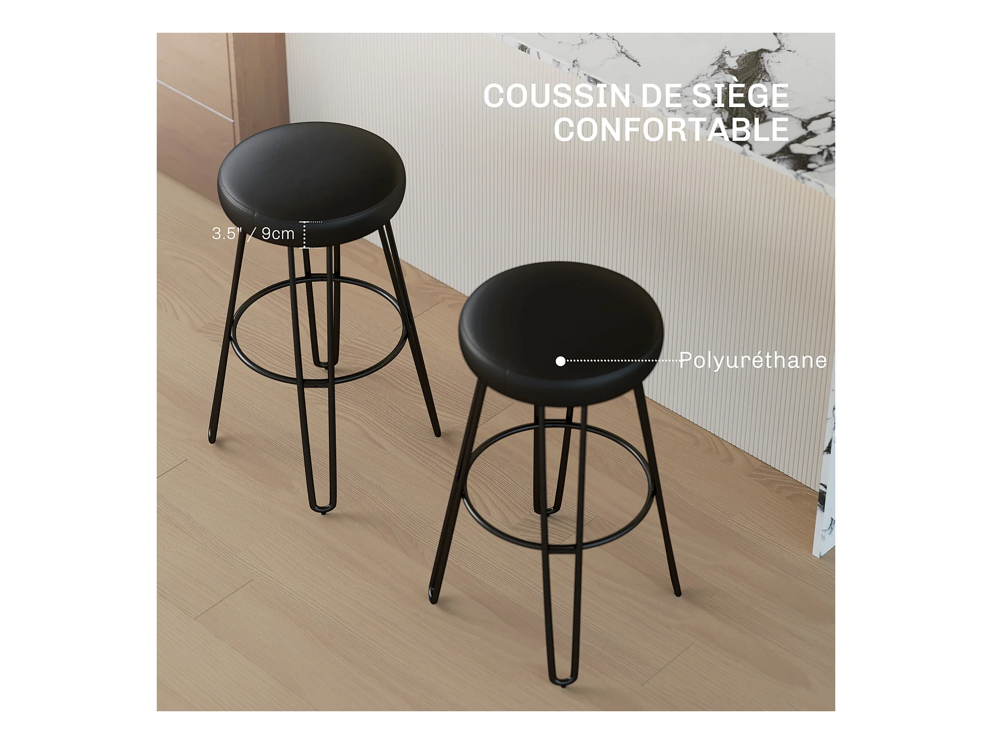 Lot de 2 tabourets de bar style industriel - repose-pieds - piètement épingle acier assise ronde noir