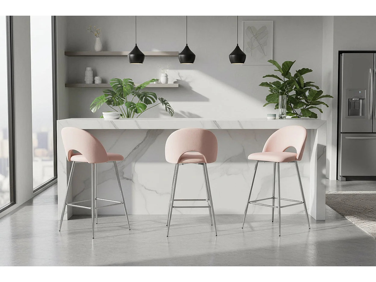 Lot 2 Tabourets de Bar Teddy Velours Rose Pieds Chrome 47x36x98cm