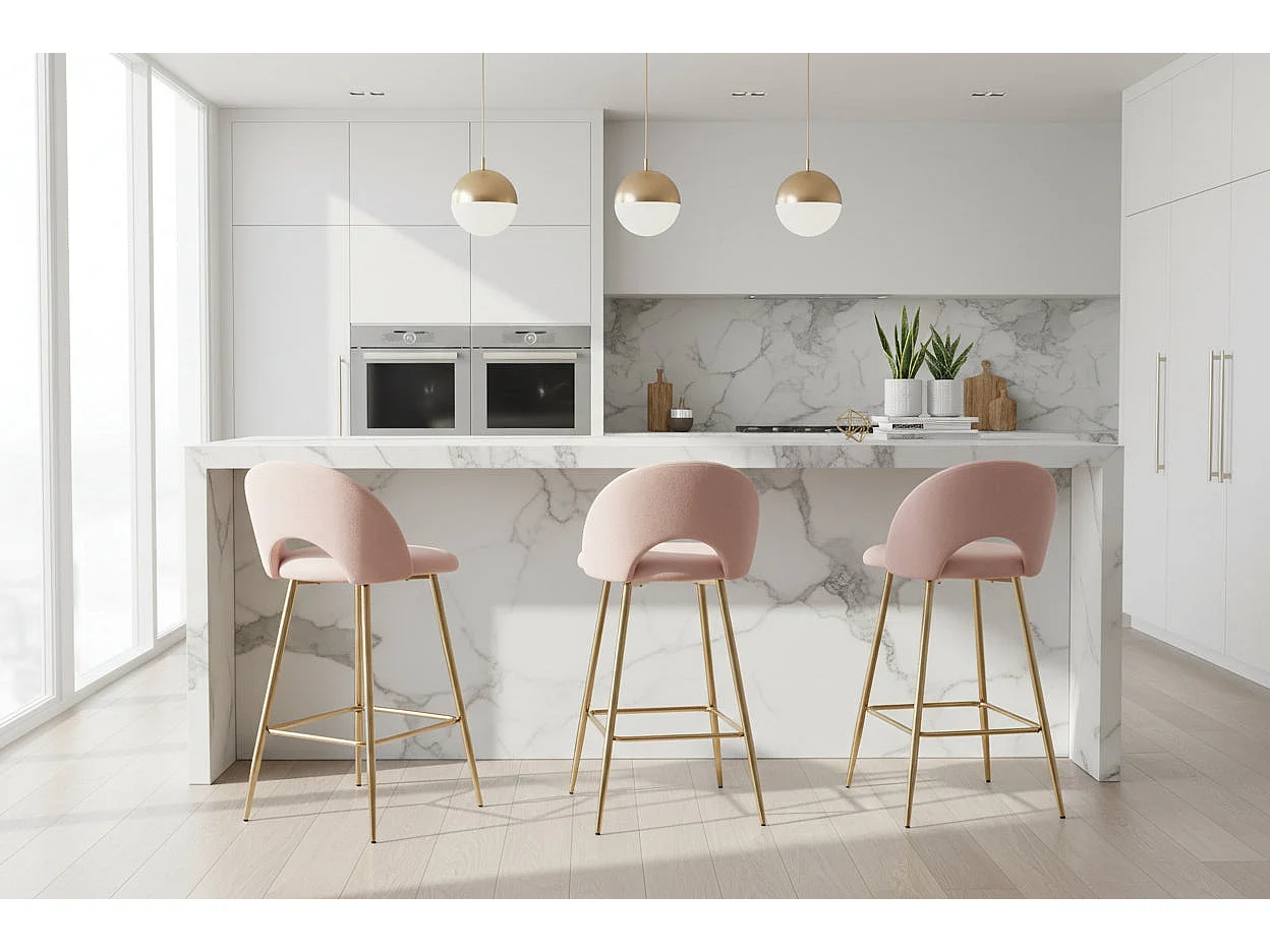 Lot 2 Tabourets de Bar Teddy Velours Rose Pieds Gold 47x36x98cm