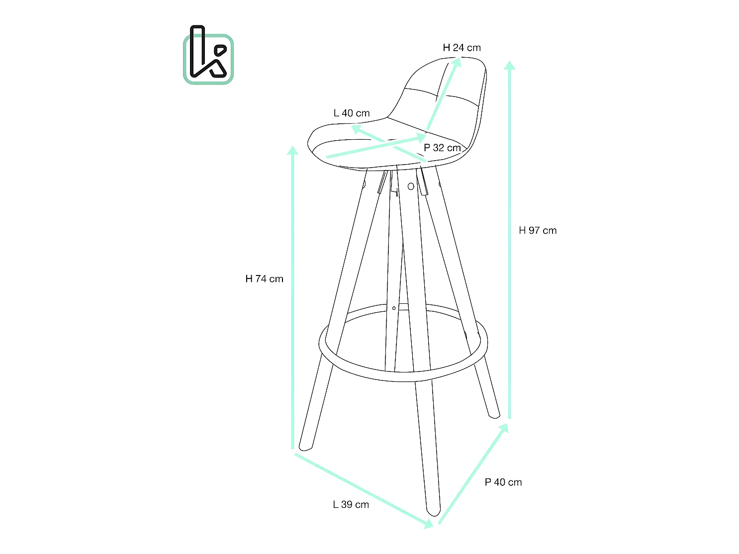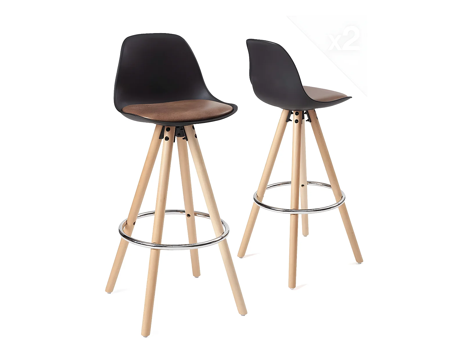 Lot 2 tabourets de bar scandinaves 75cm, coussin, pieds bois, repose pied chromé SANA (noir marron)