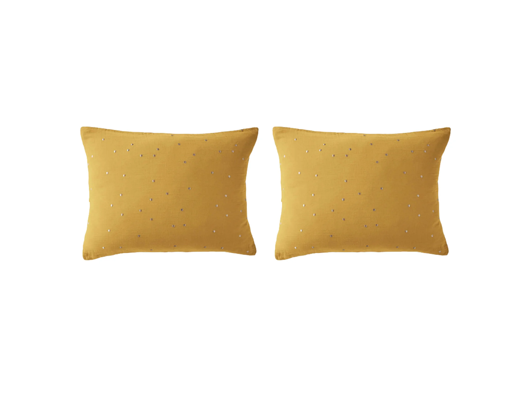 Lot de 2 taies d'oreillers à pois brodés double gaze de coton jaune safran 50x70