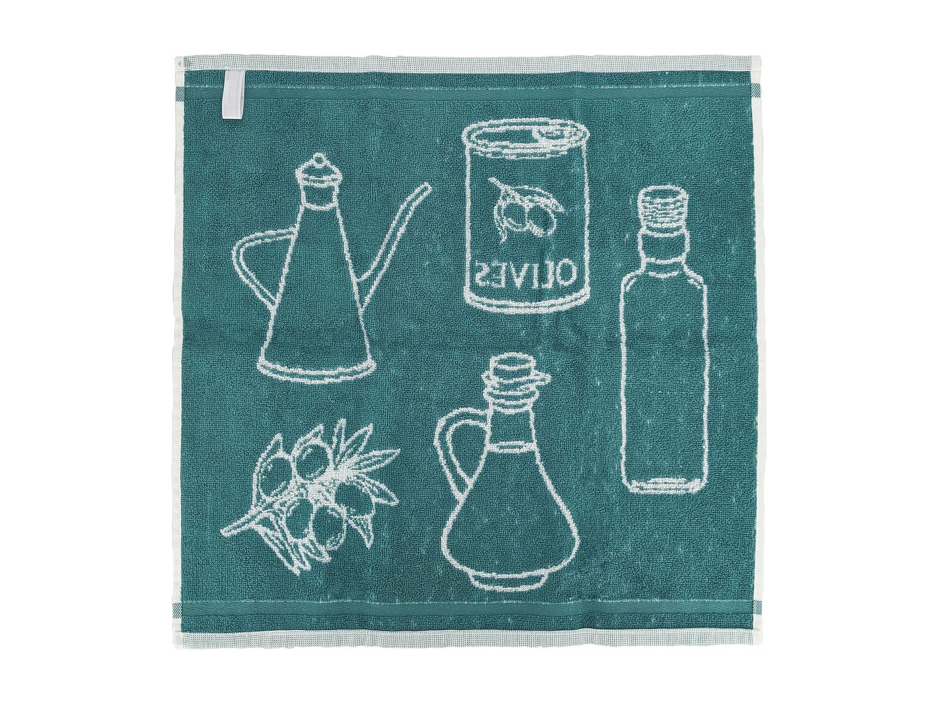 Lot de 2 torchons de cuisine pur coton 50x50 cm EVOO motif olives vert