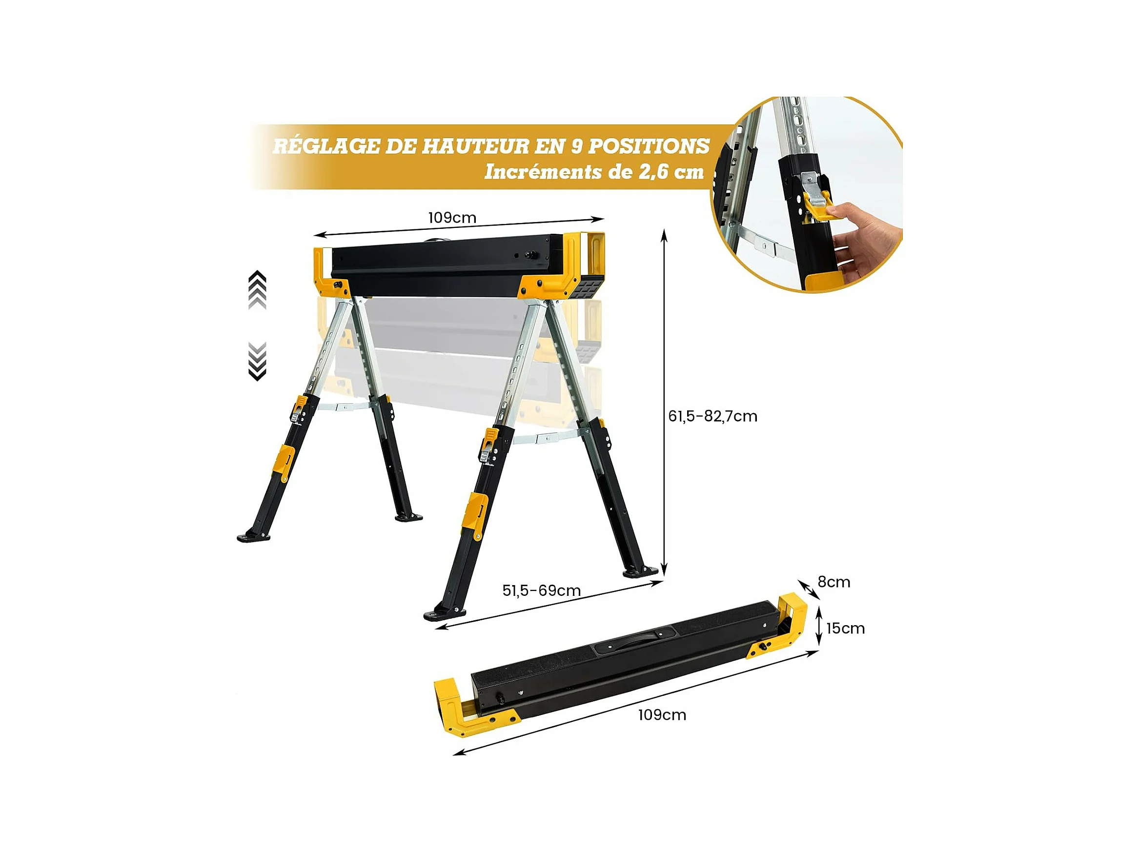 Lot de 2 Tréteaux Métalliques Robuste, avec Pieds Antidérapants Ajustables Reglable 61,5 à 82,7 cm, Grand Support jusqu’à 1180kg Usage en Paire (Jaune)