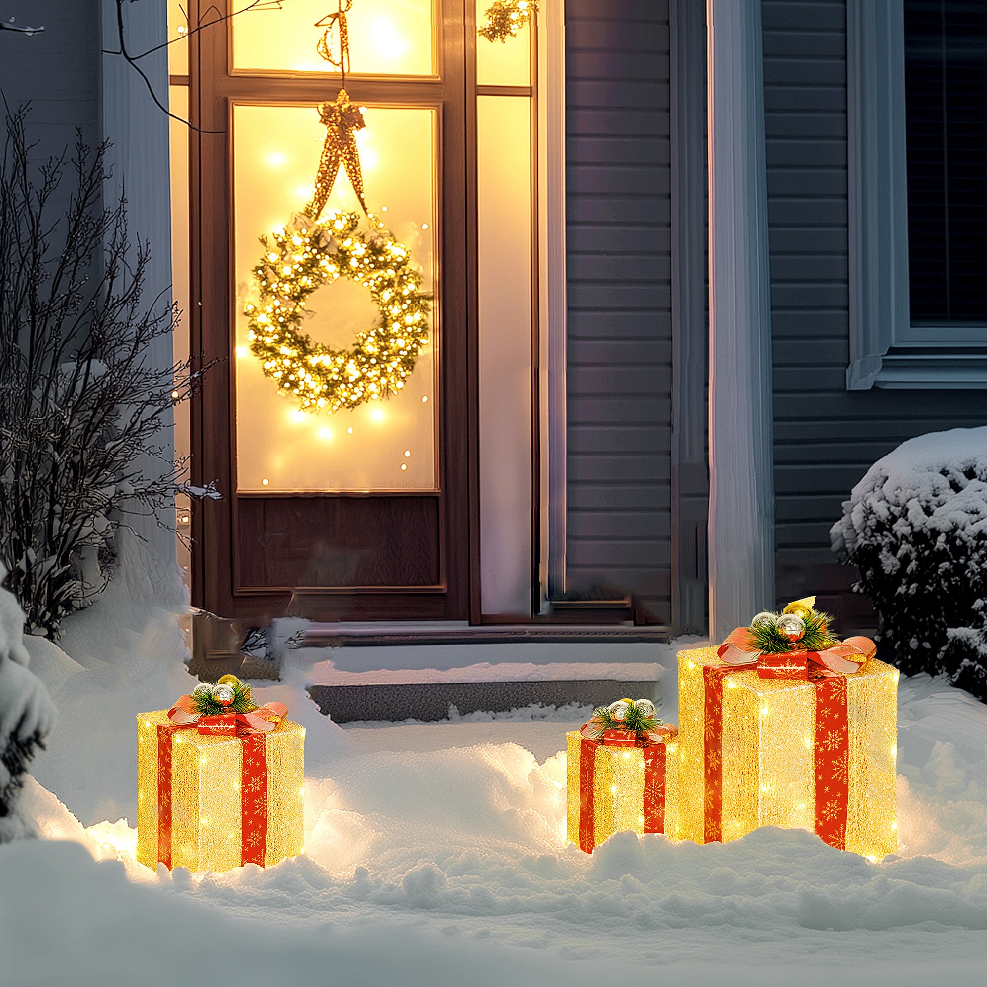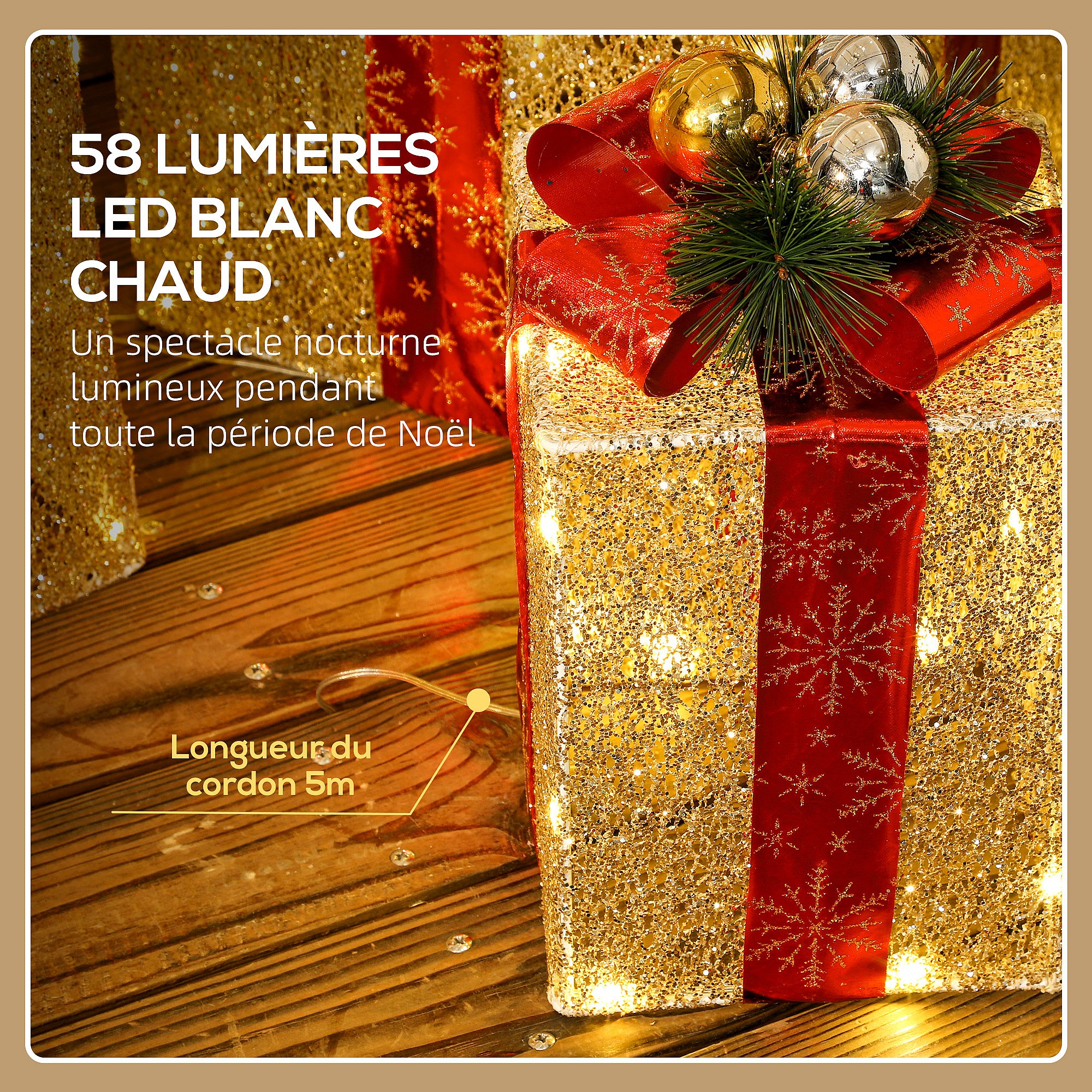 Lot de 3 boîtes cadeaux Noël lumineux extérieur 58 LED blanc chaud 3 noeuds rouge