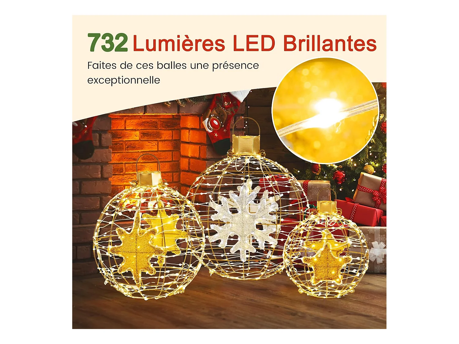 Lot de 3 Boules Lumineuses, Décoration Noël Extérieur Intérieur, 732 Lumières LED, 20 Attaches Zippées, 6 Piquets de Sol, Boules Noël Suspendu, Décorations Fêtes