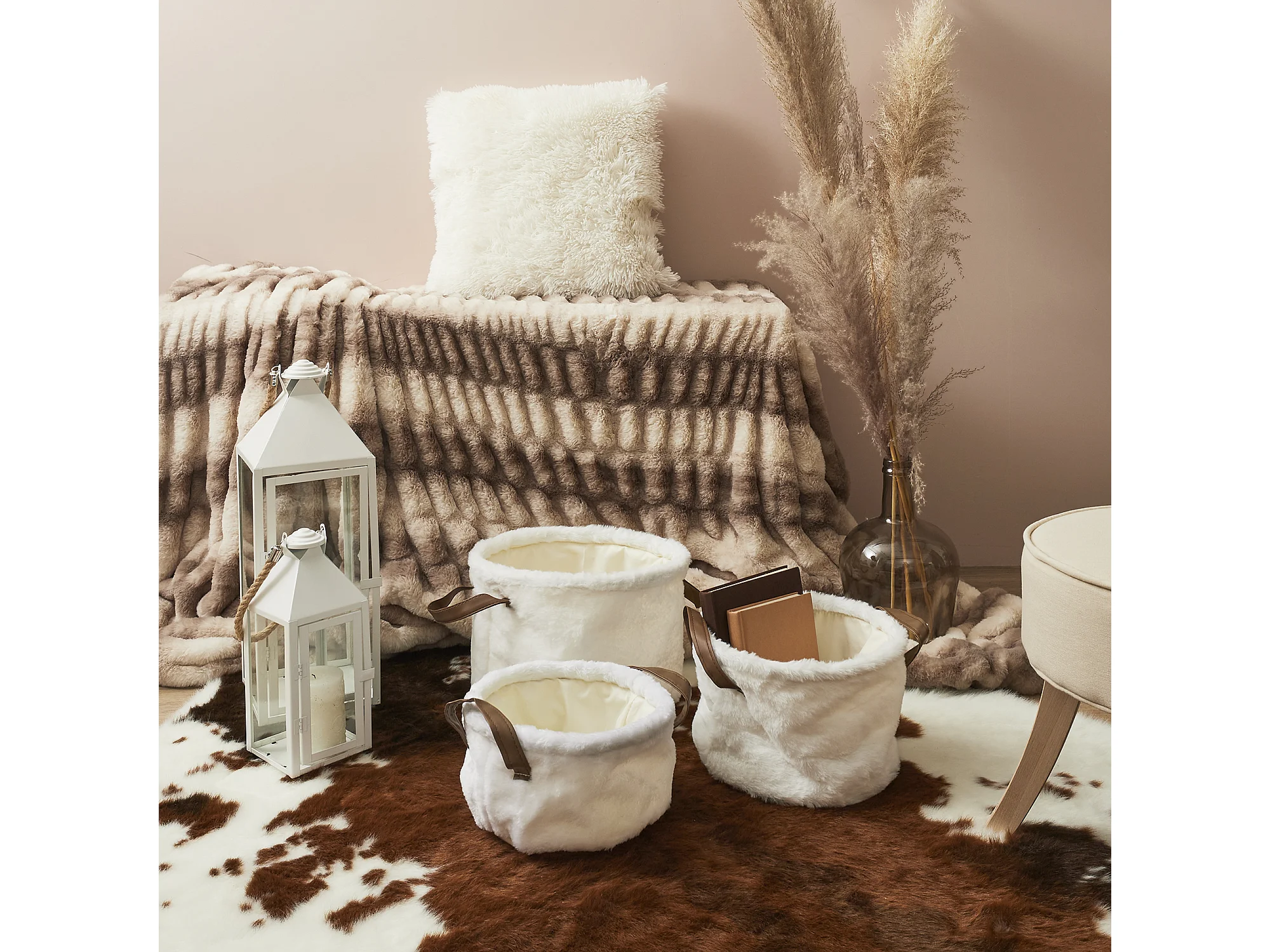 3 paniers gigognes effet fourrure blanc avec poignée