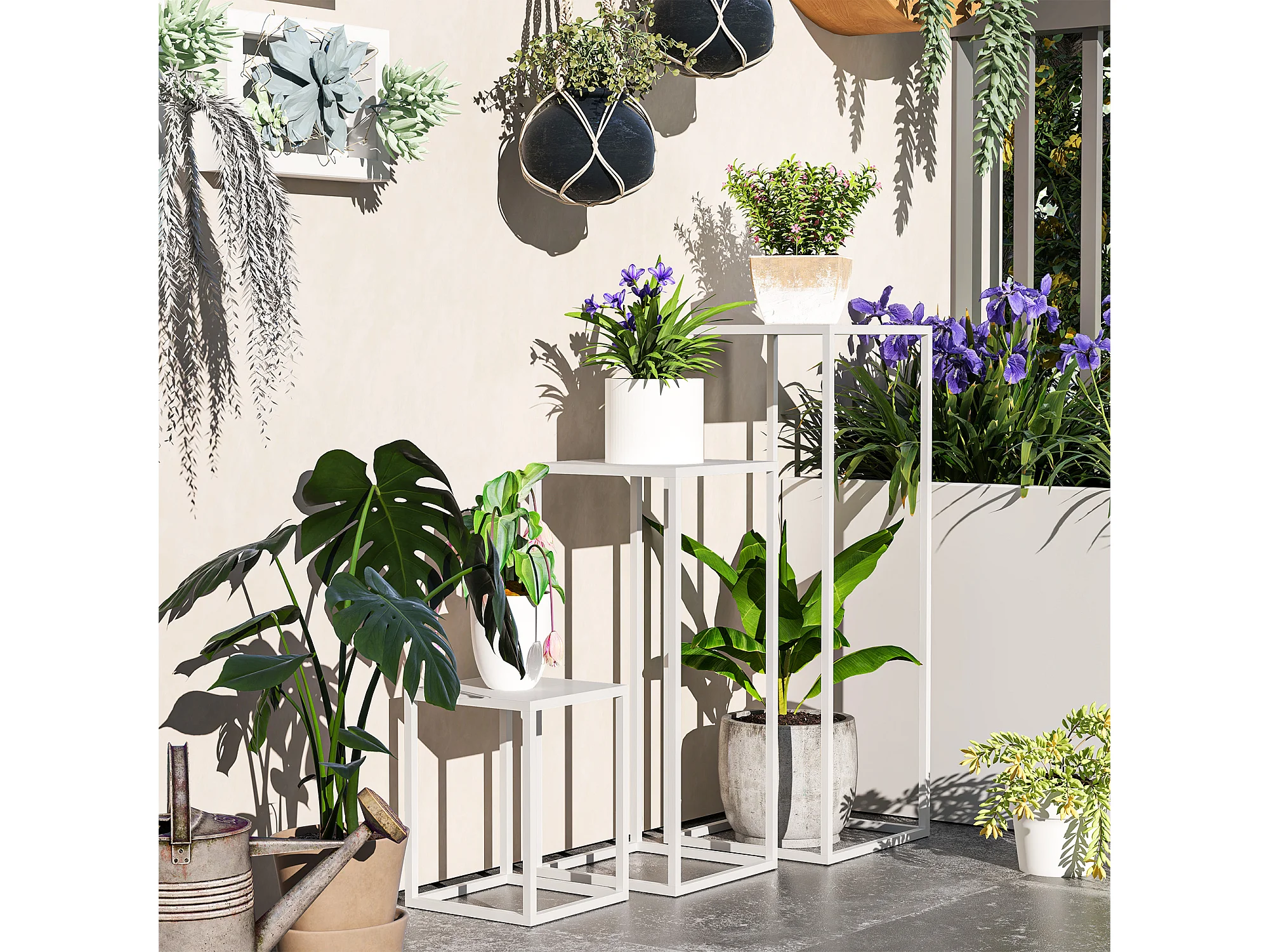 Lot de 3 supports pour plantes fleurs empilables - usage intérieur extérieur - métal époxy blanc