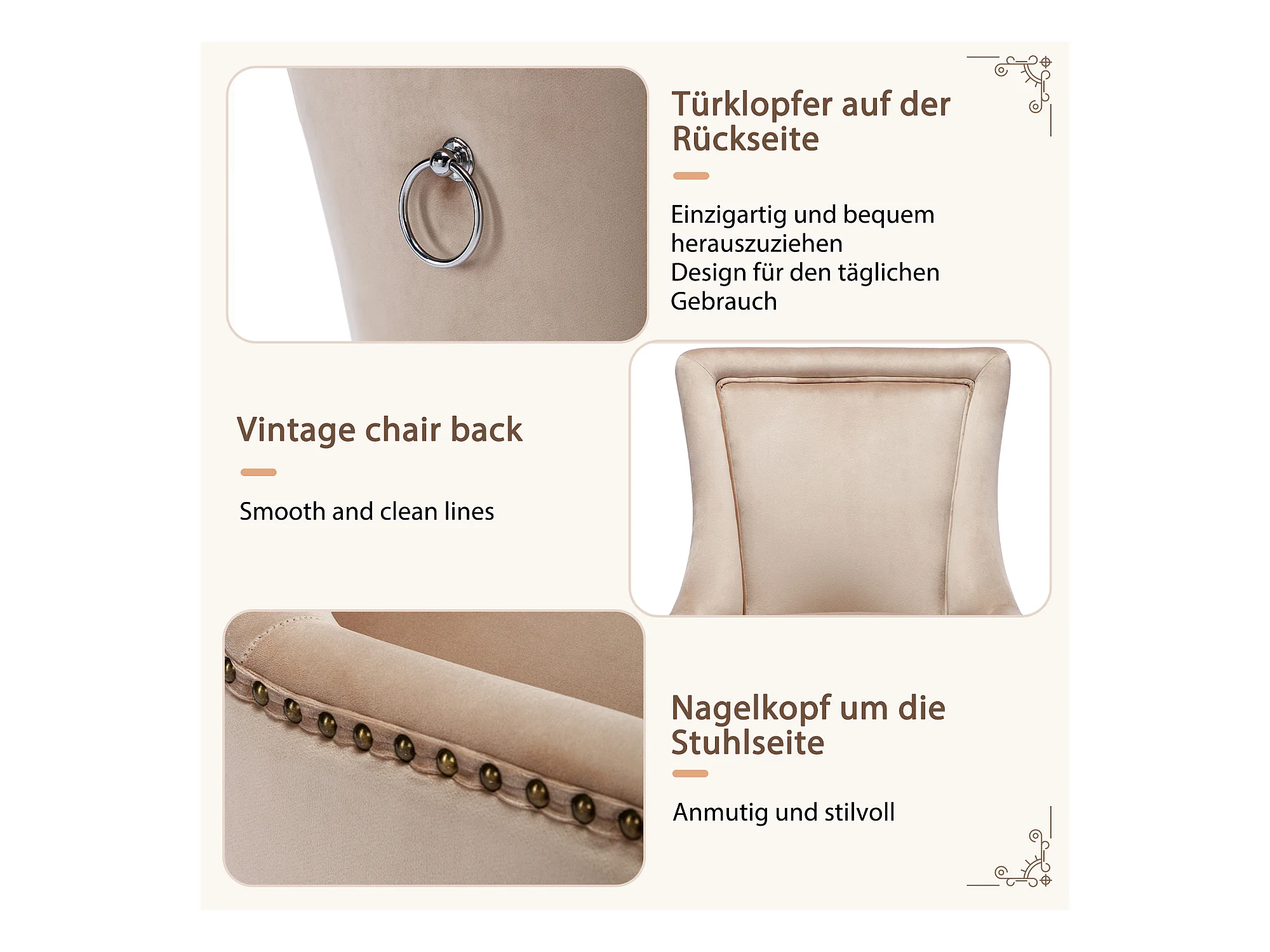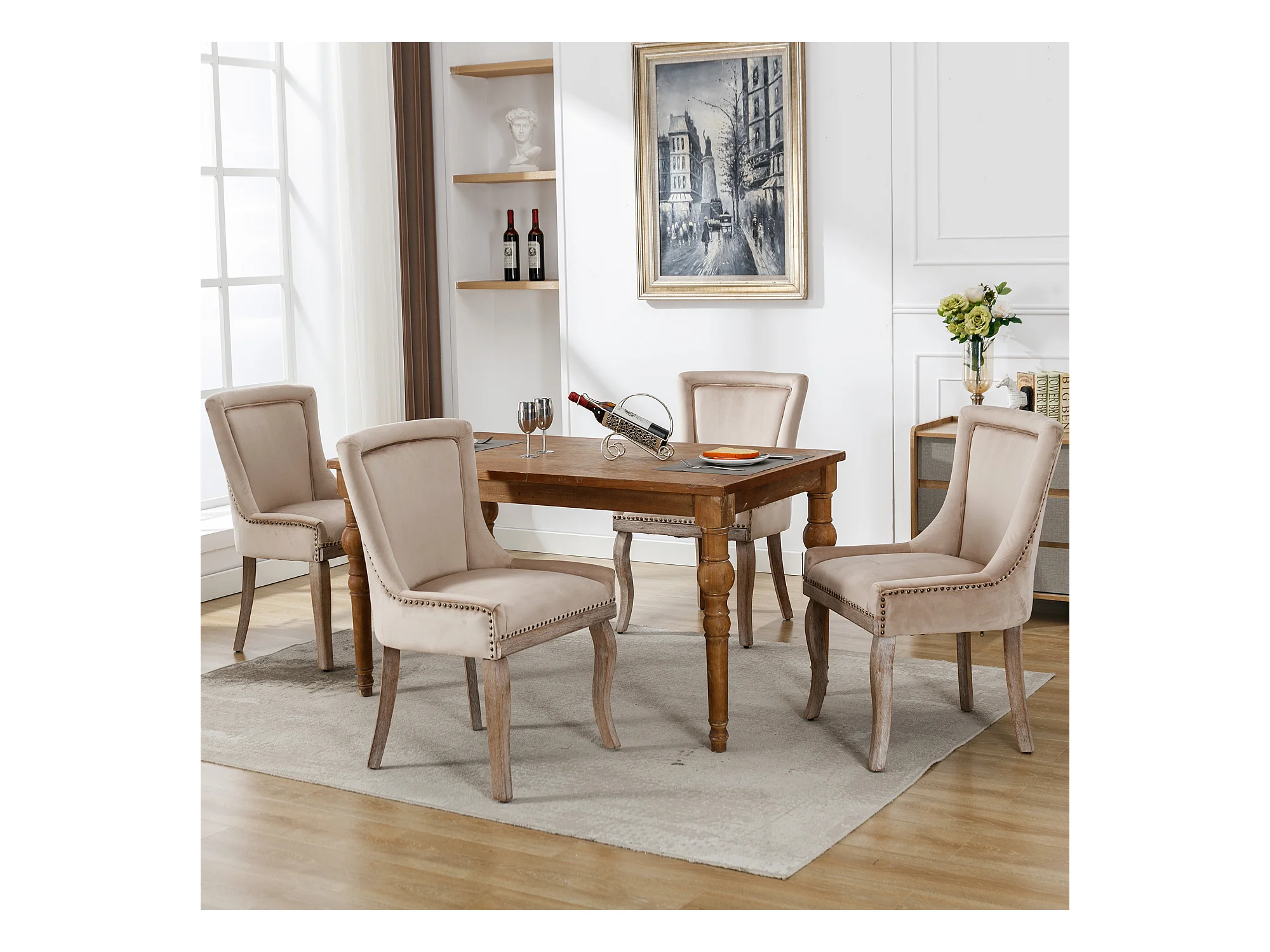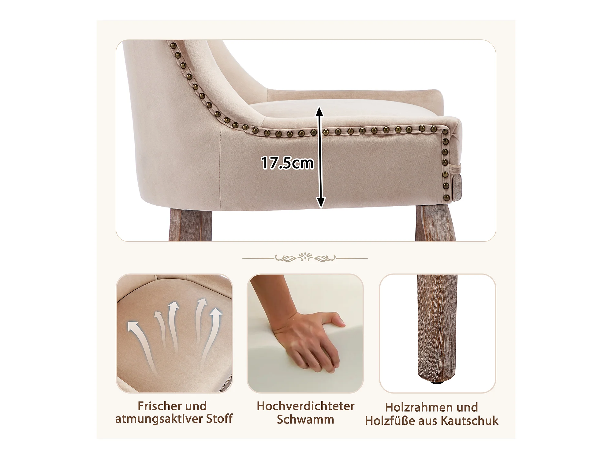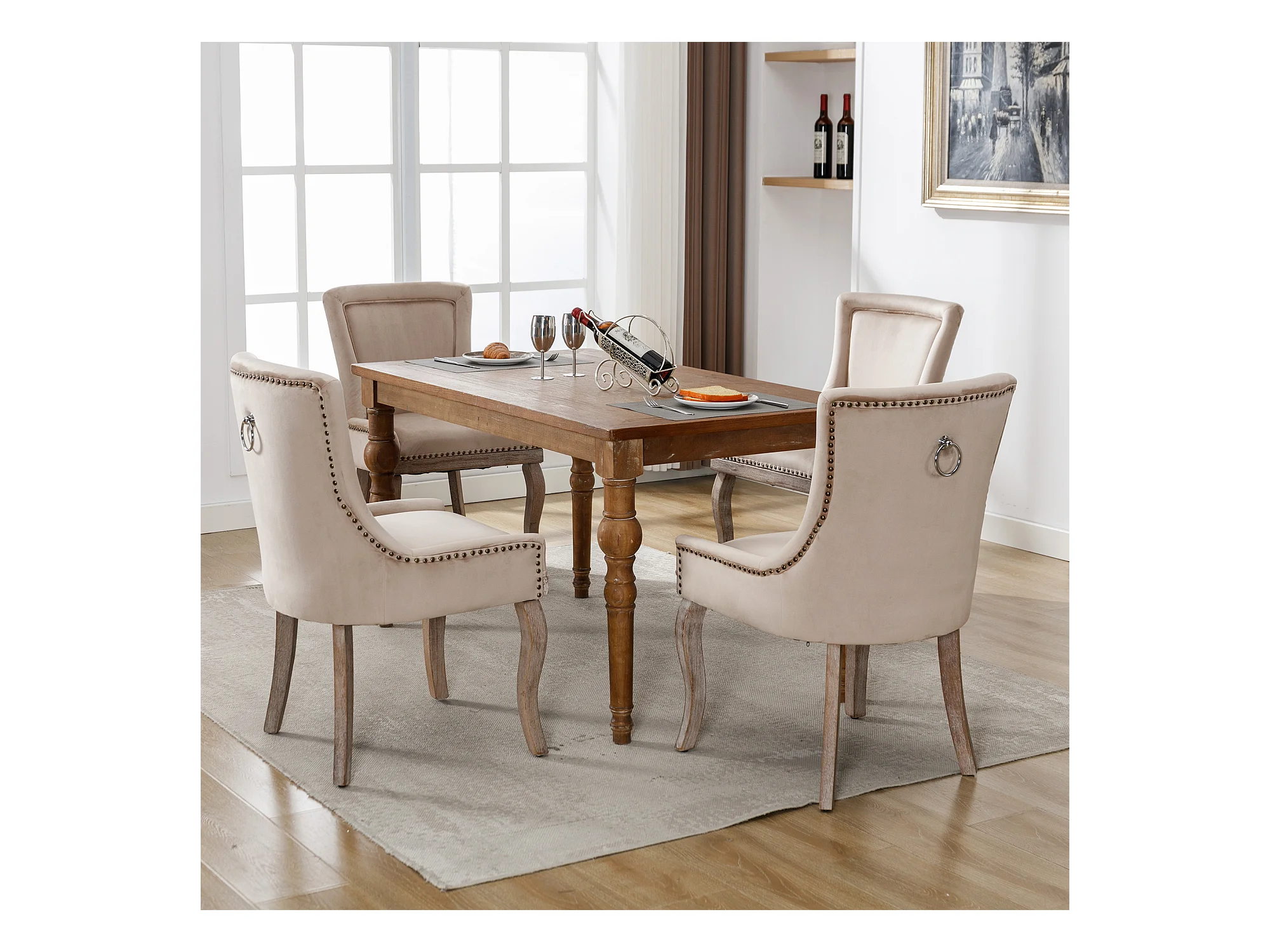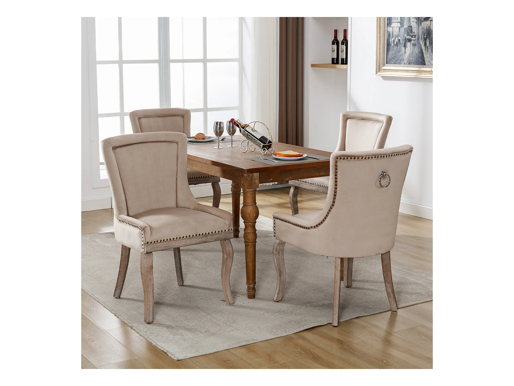 Lot de 4 Chaise de salle à manger Rembourrée avec garniture cloutée et pieds en bois - Beige