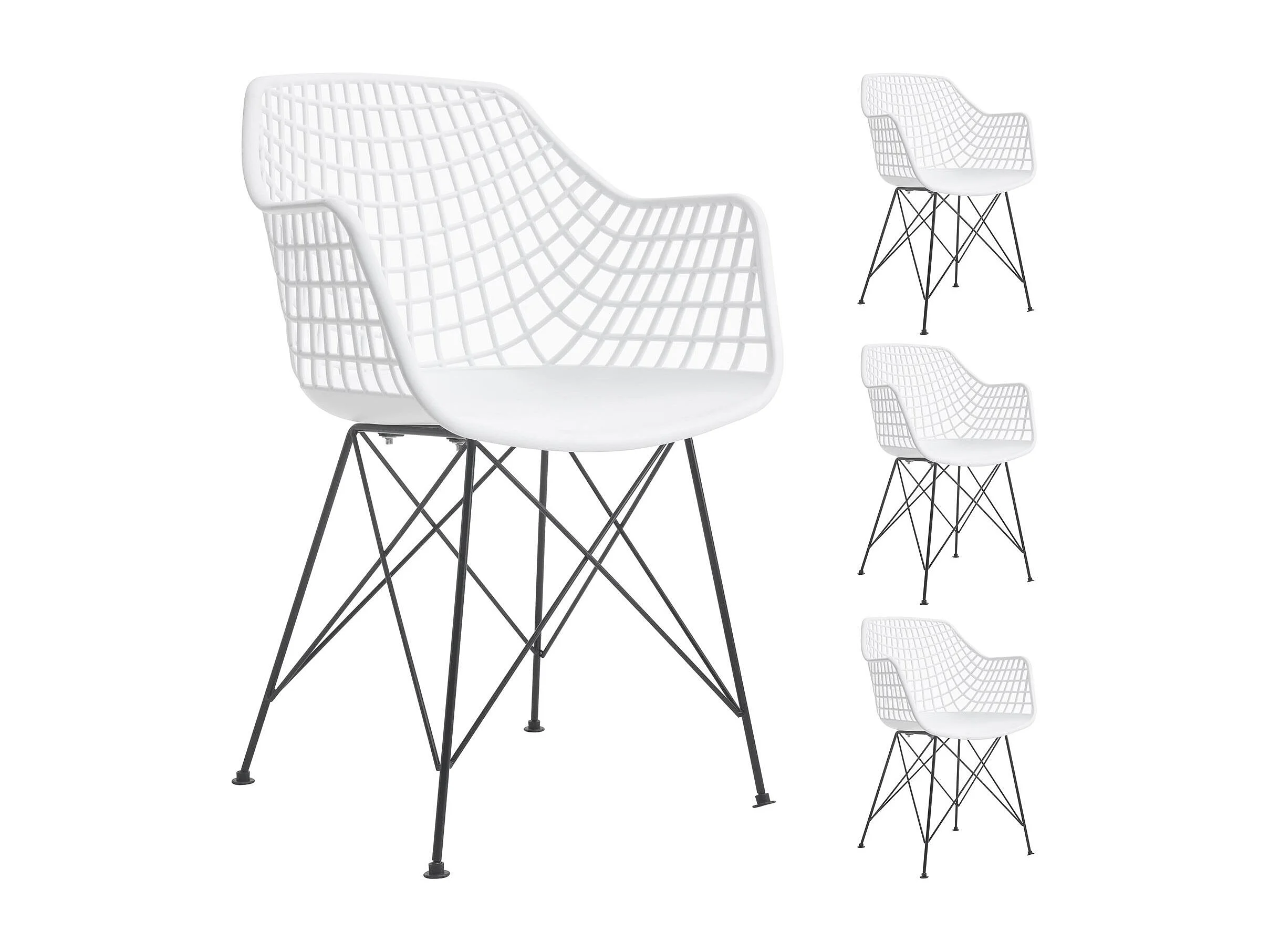 Lot de 4 chaises ALICANTE pour salle à manger ou cuisine design retro avec accoudoirs coque plastique blanc et 4 pieds croisé noir