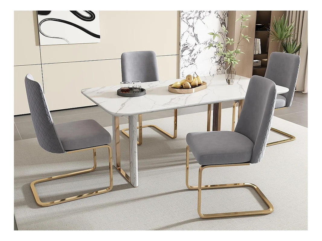 Lot de 4 Chaises cantilever en velours - dossier à motif de losange - piètement en métal doré - Gris