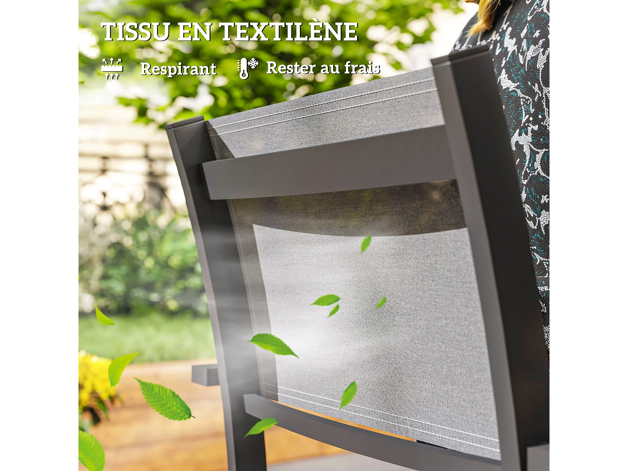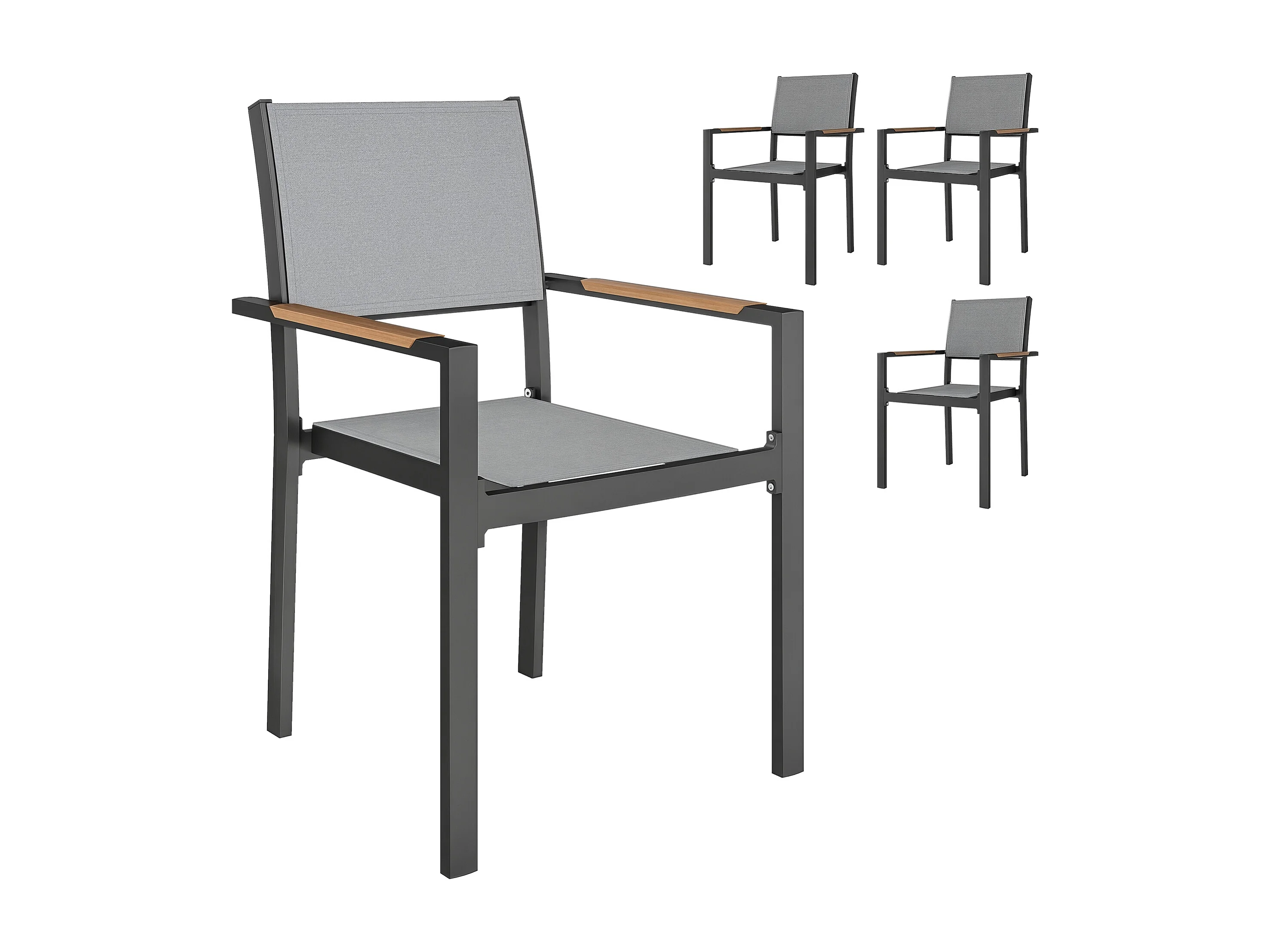 Lot de 4 chaises de jardin assise dossier textilène structure alu accoudoirs revêtement PVC effet bois