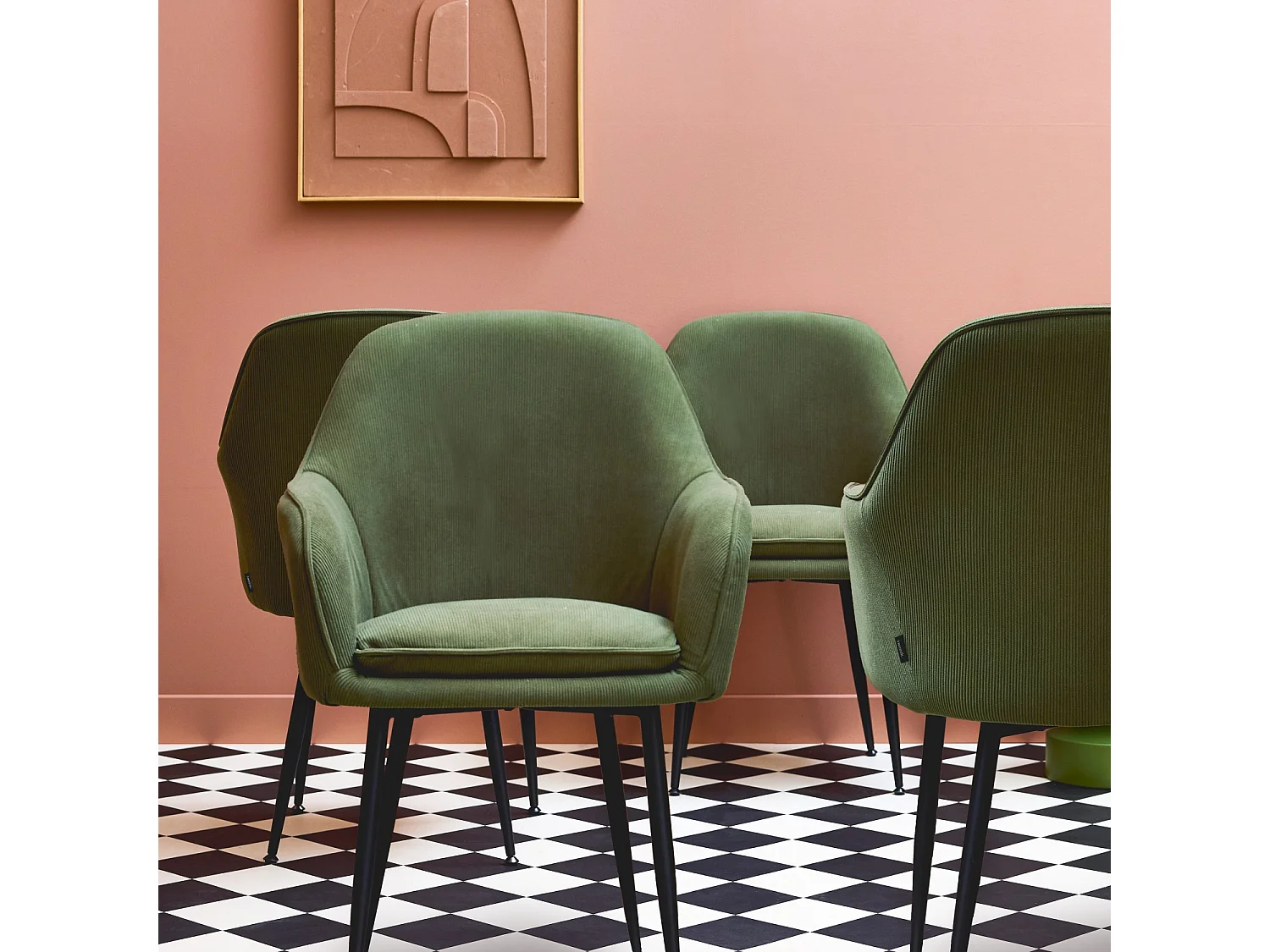 Lot de 4 fauteuils en velours côtelé kaki foncé et pieds en métal noir mat. L 57 x P 59 x H 84.5cm