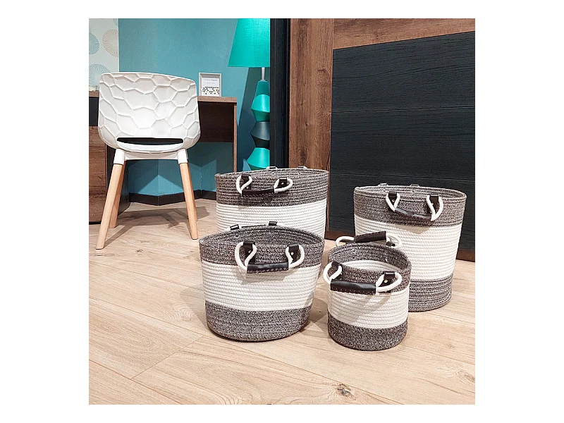Set de 3 paniers rond en corde de coton tressée gris avec anses - LIV