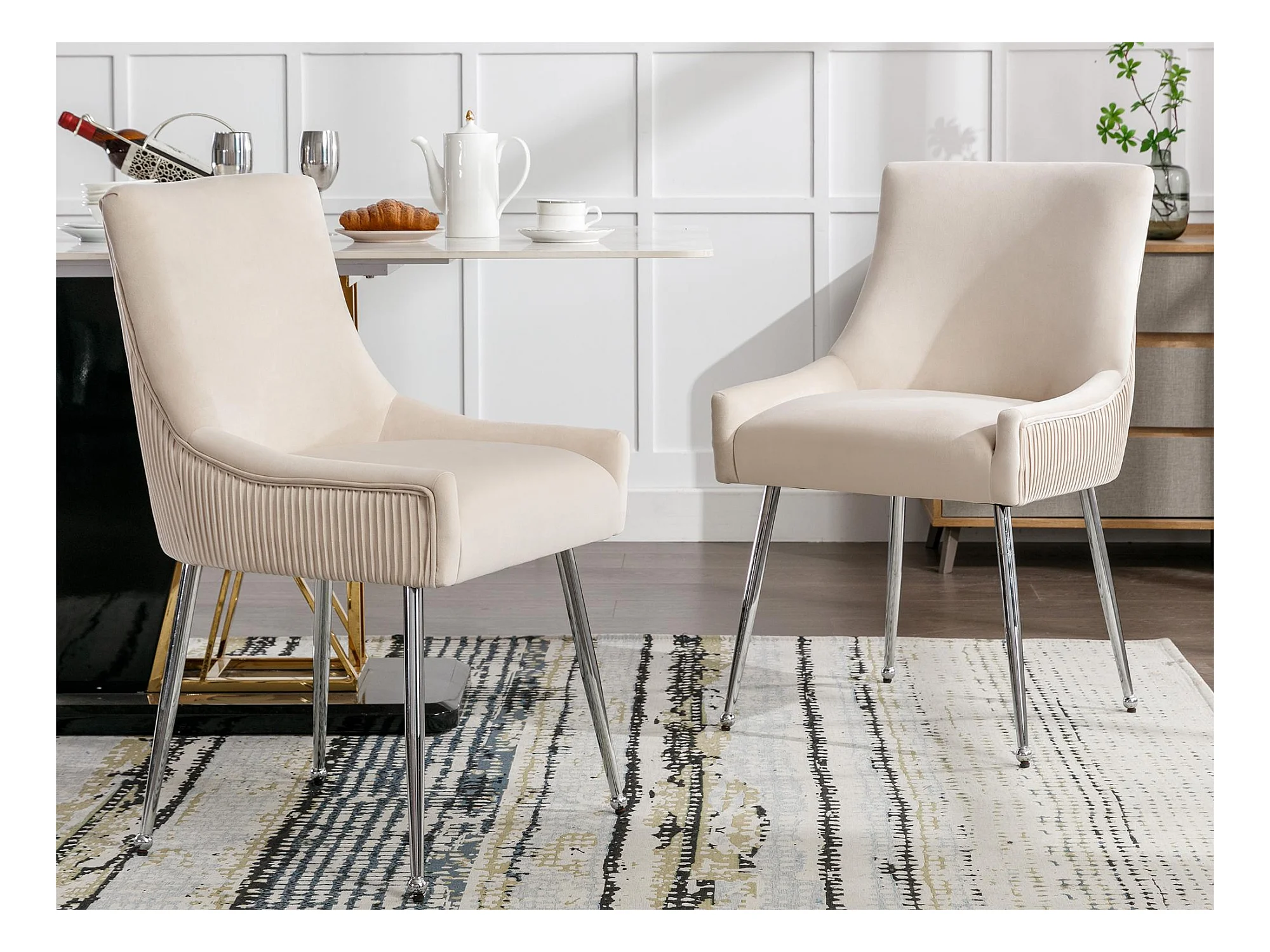 Lot de 6 Chaises rembourrées en velours avec pieds plaqués - Beige & Argenté