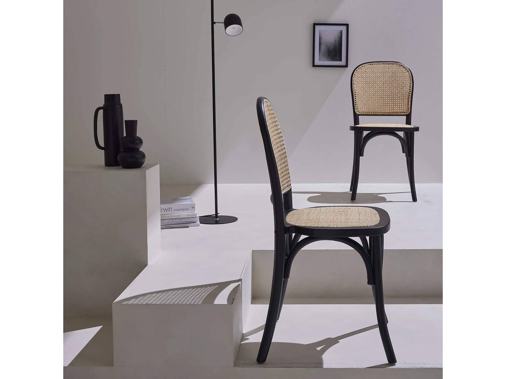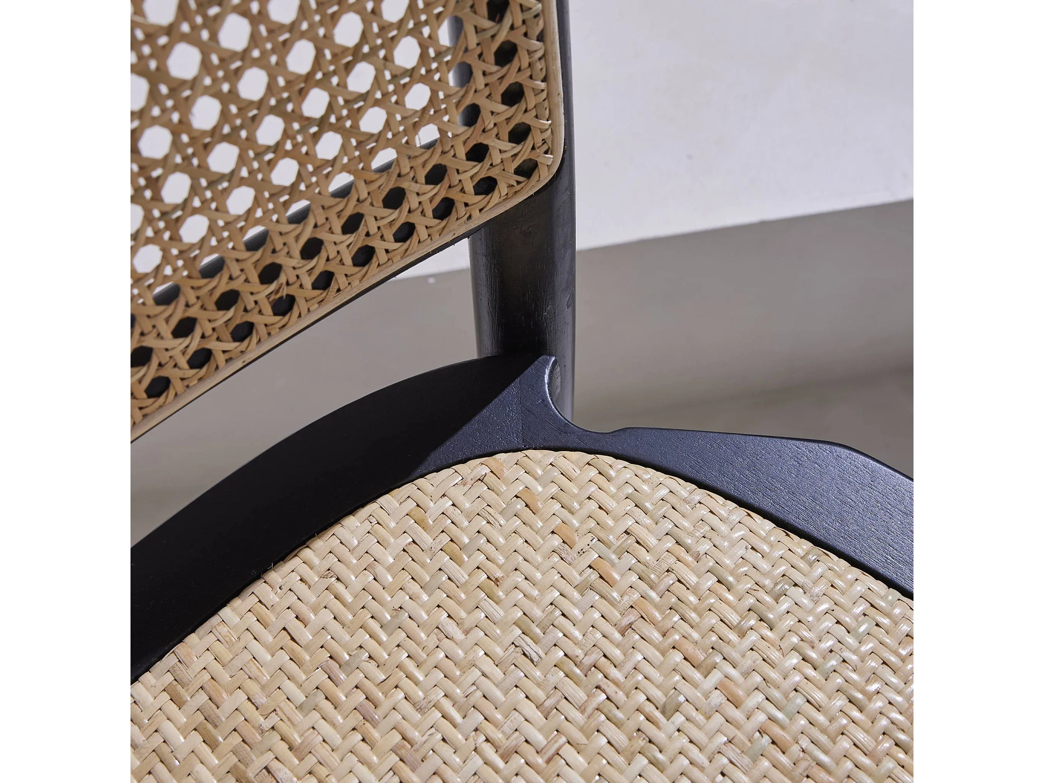Lot de deux chaises vintage noires en bois avec assise et dossier en rotin
