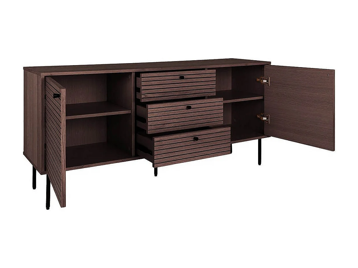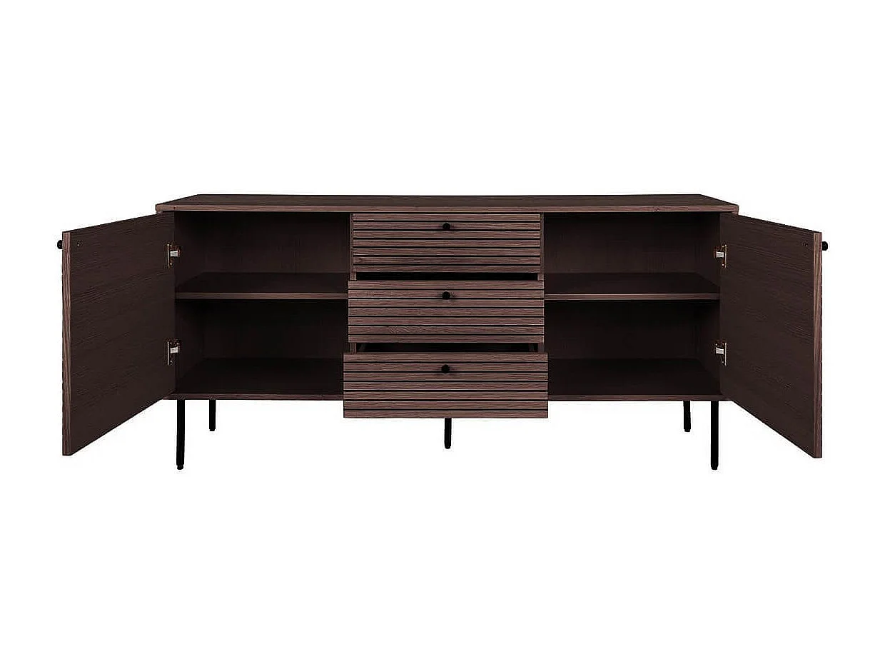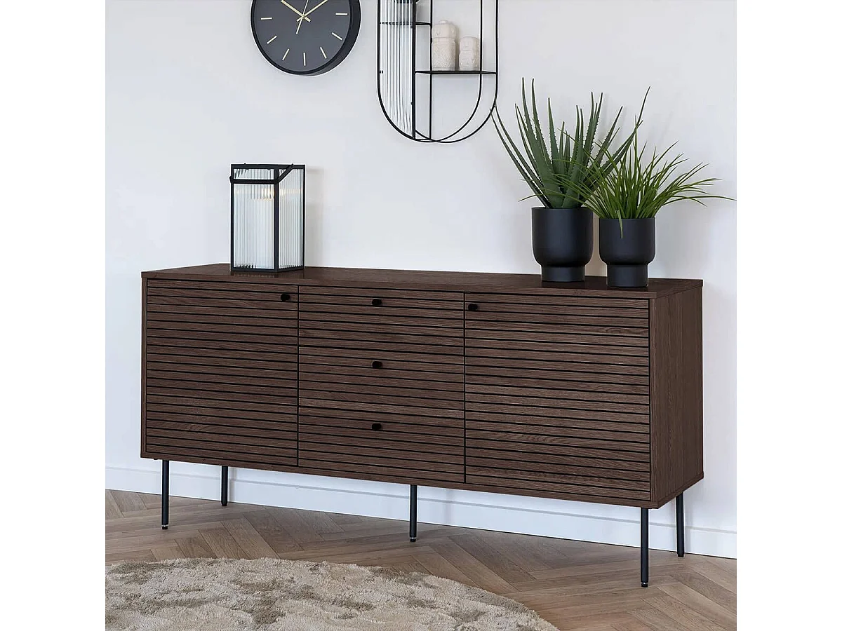 LOWAN - Buffet 3 Tiroirs 2 Portes Effet Tasseaux Teinté Chêne Foncé