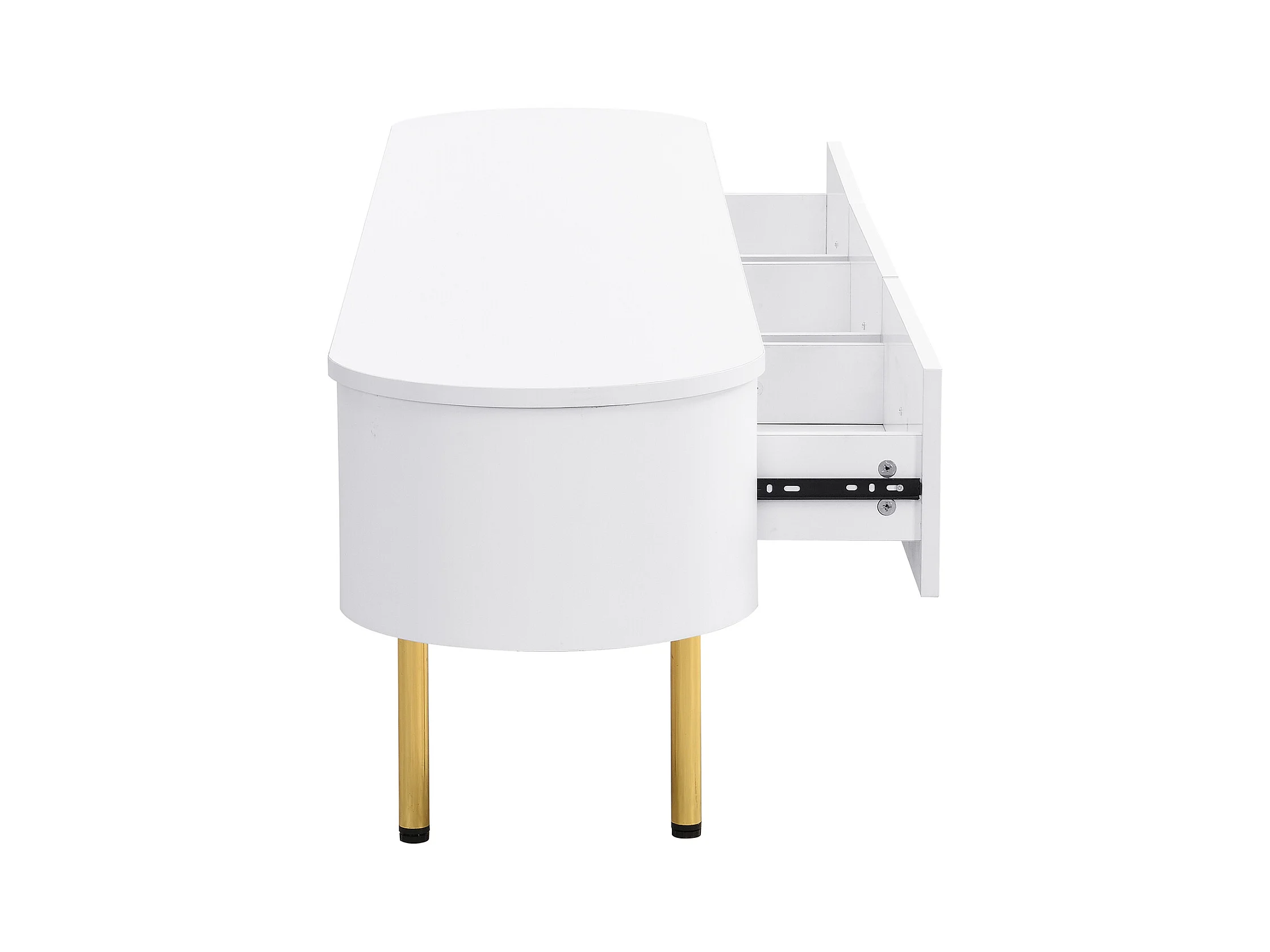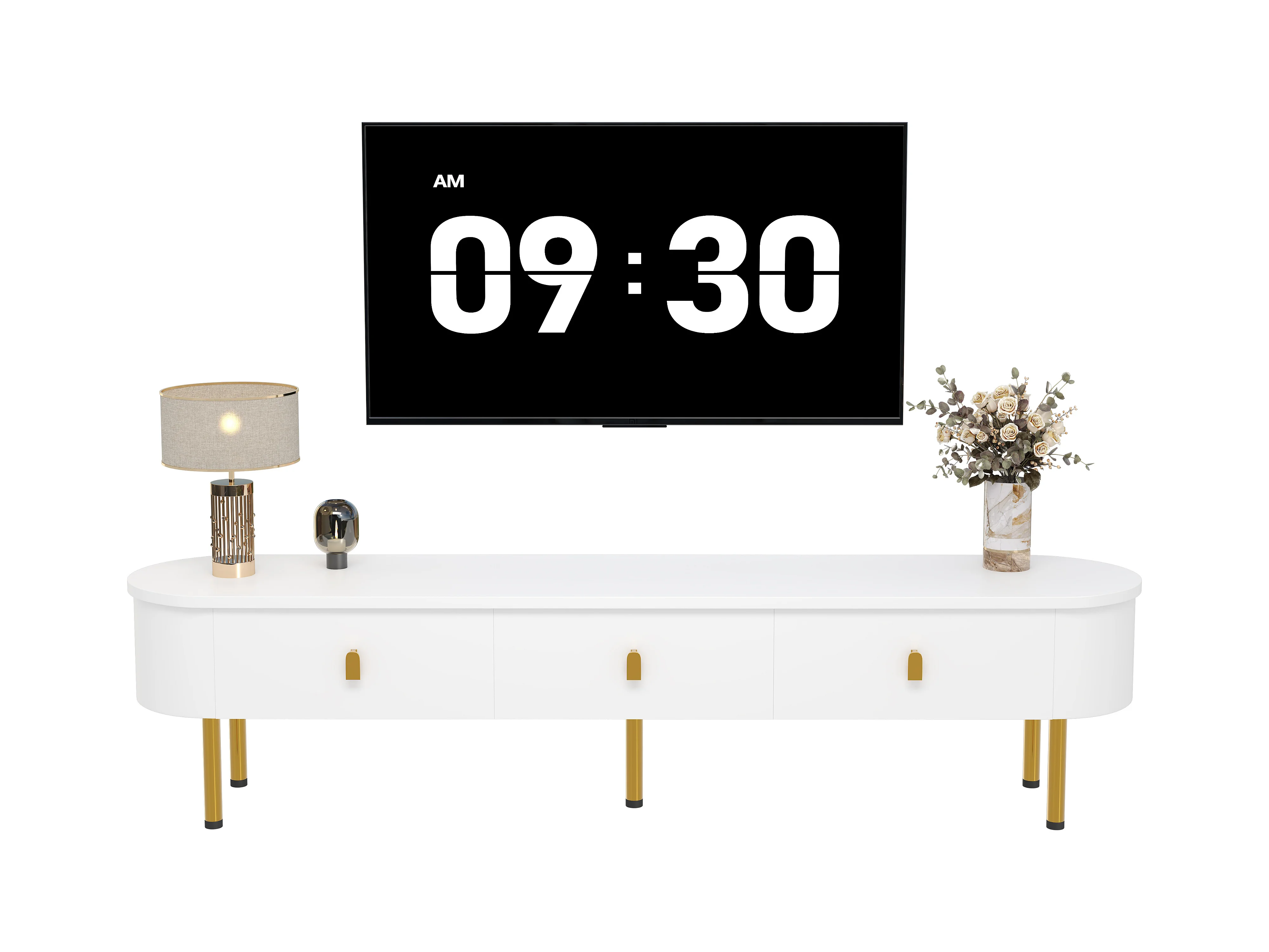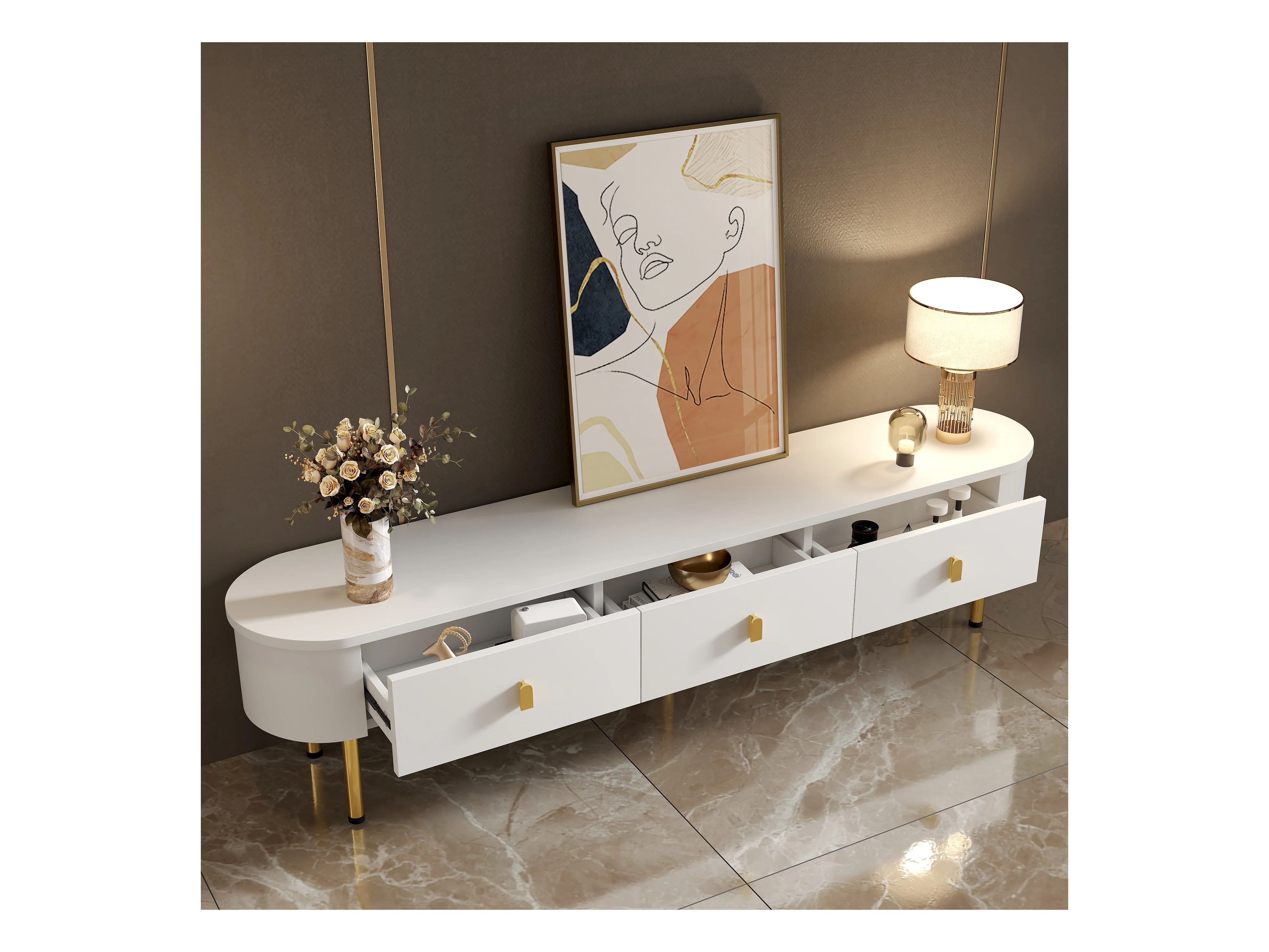 Lowboard, meuble TV avec tiroirs, poignées dorées, pieds et coins incurvés
