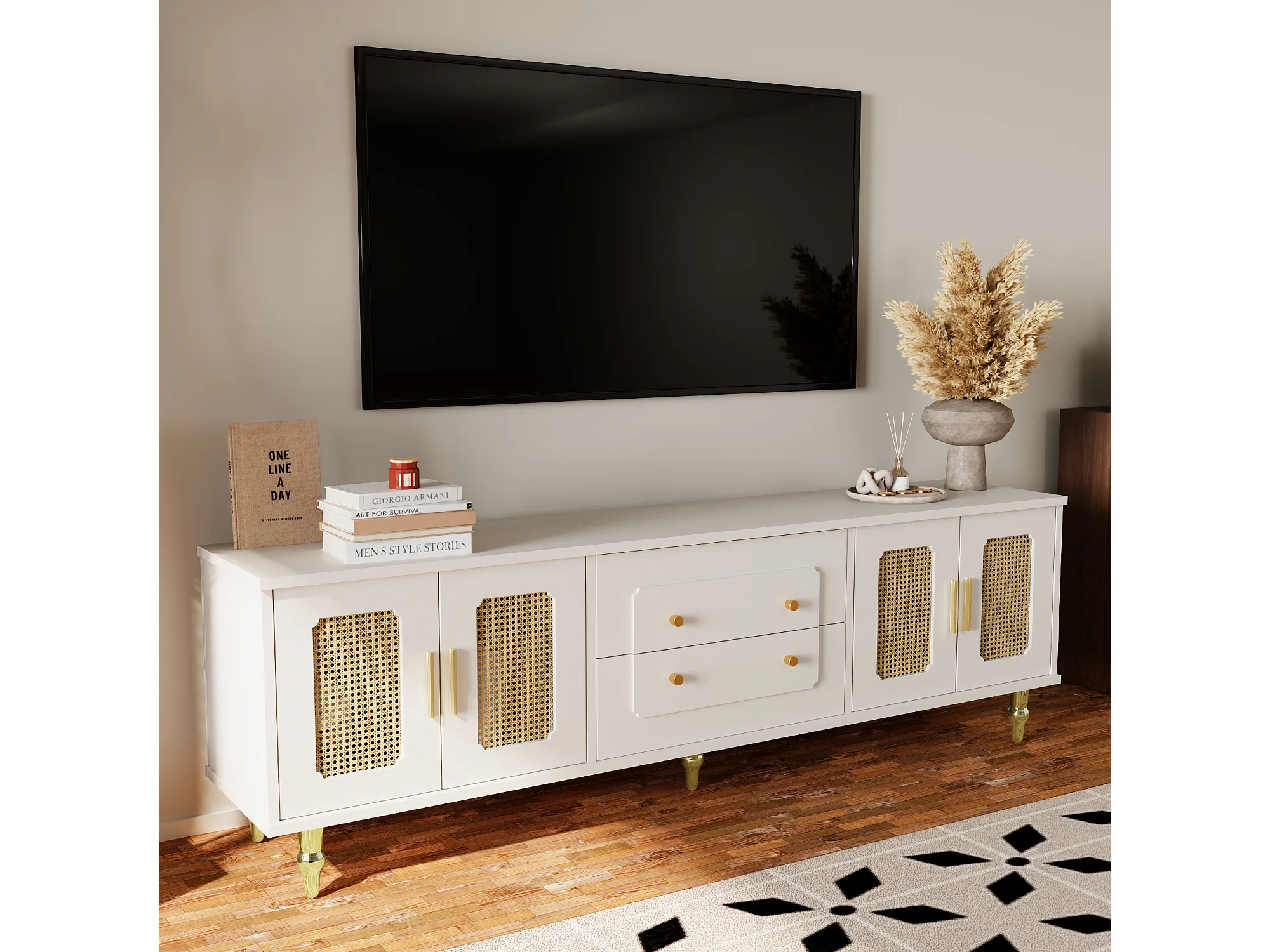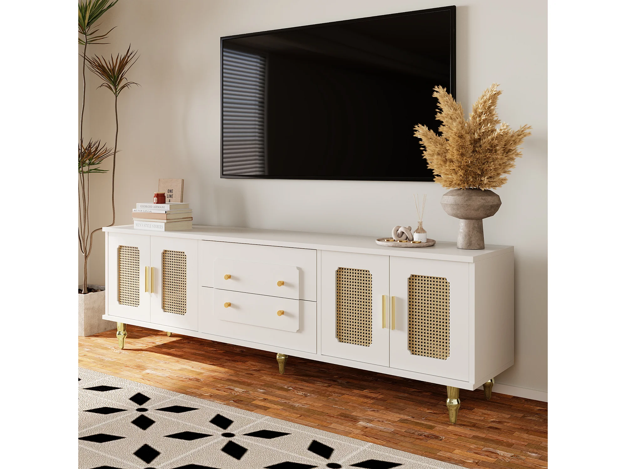Lowboard, Meuble TV Style Rétro, Poignées Dorées, Grand Rangement, Porte en Rotin, Pieds Métal