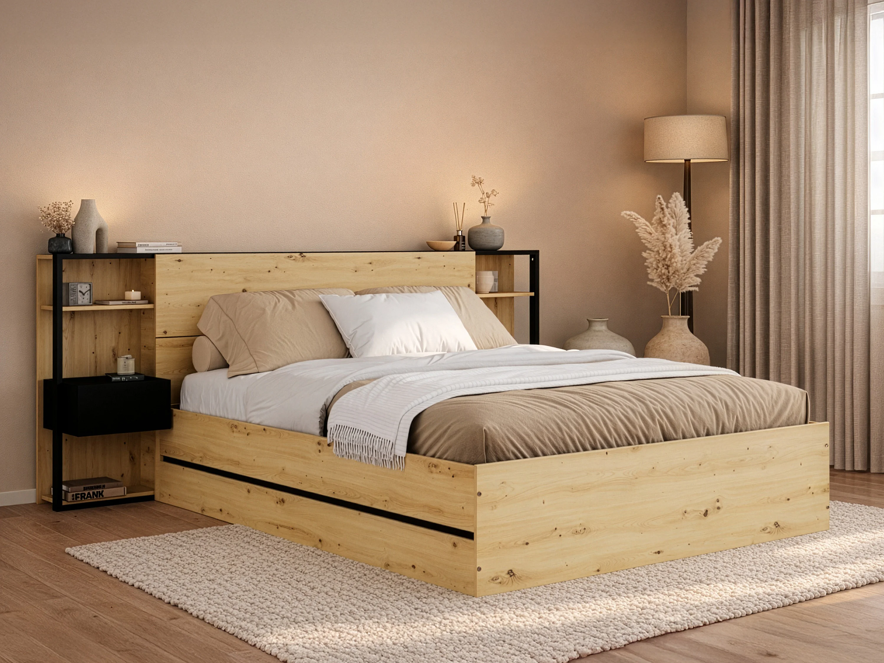 Lit coffre 160 x 200 cm avec chevets - Coloris : Naturel et noir - LUDARO