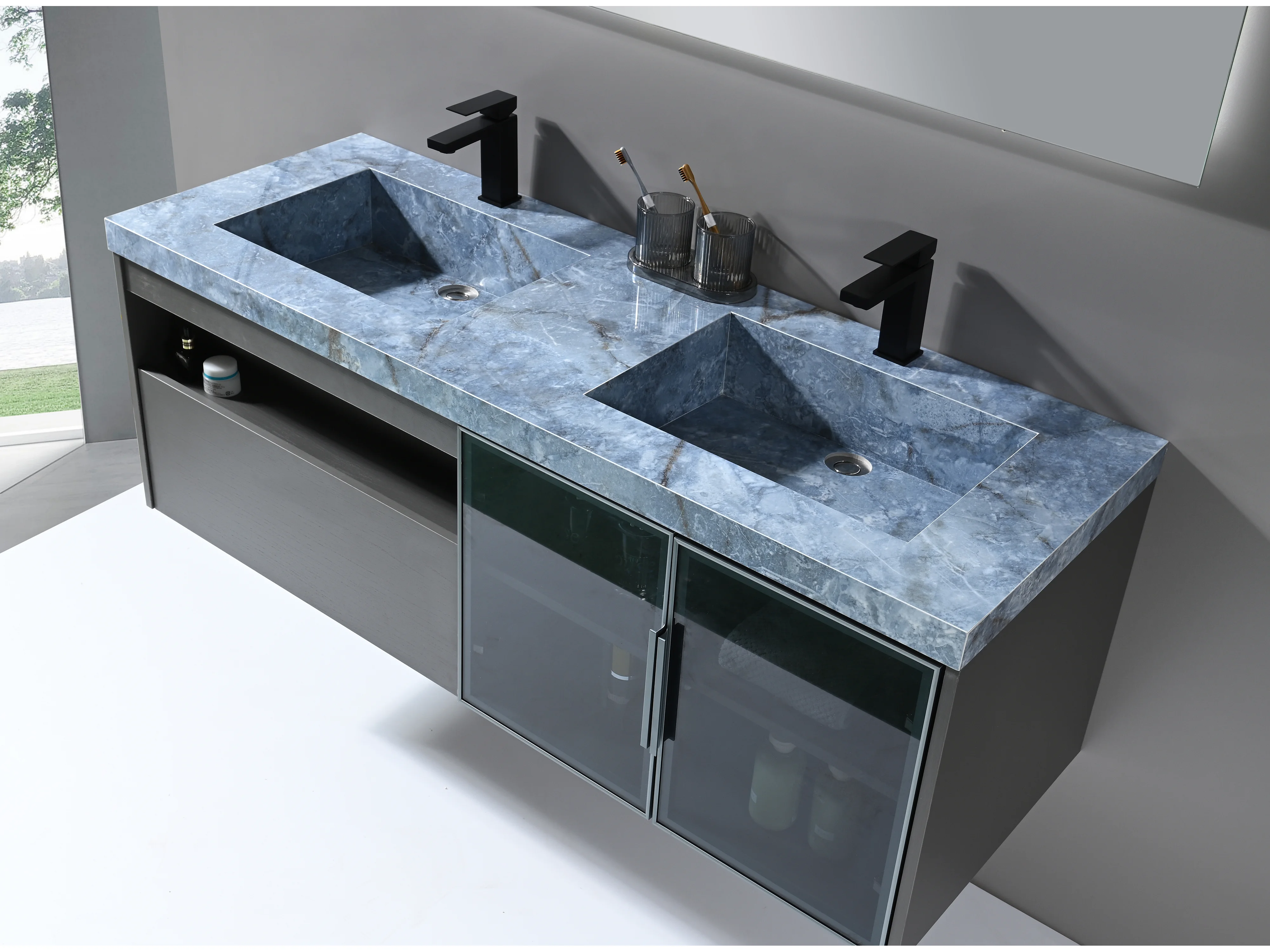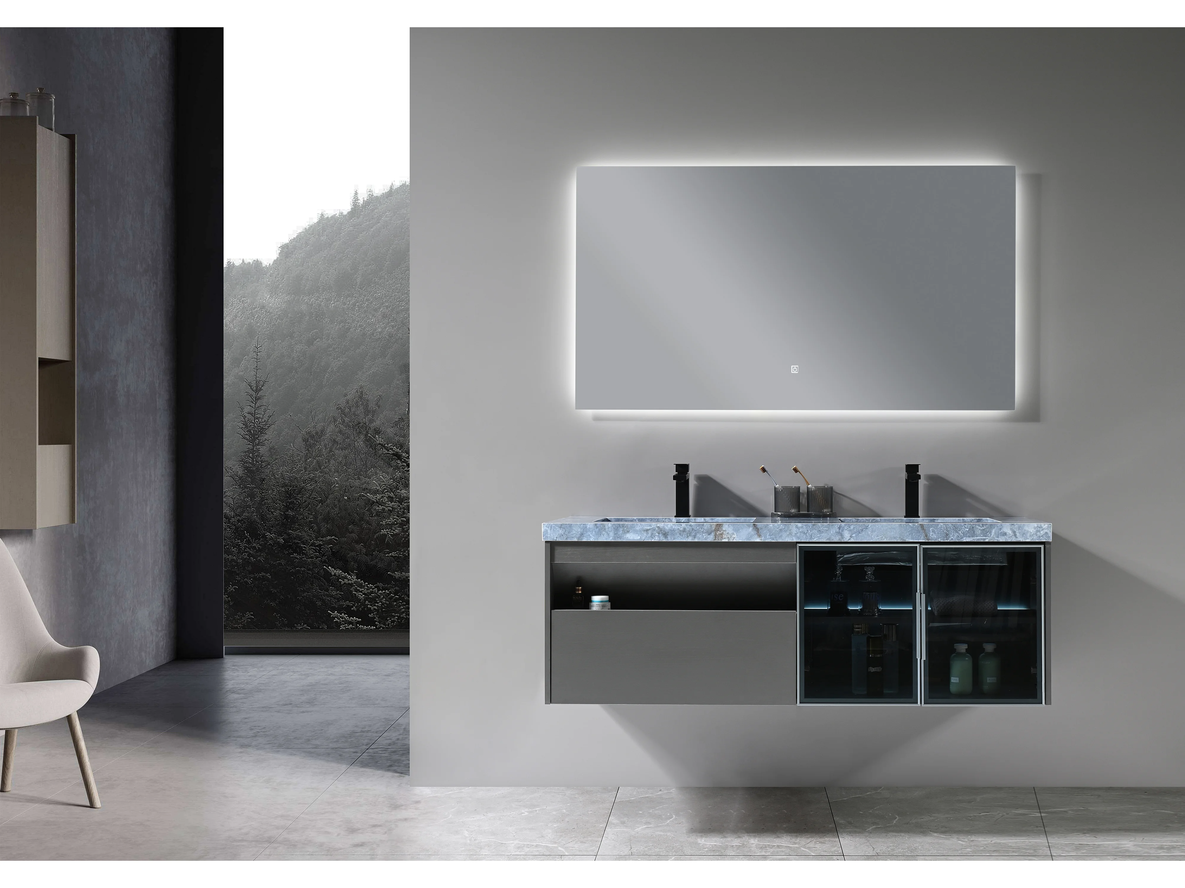 LuxuryBain- Meuble de salle de bain double vasque 140cm gris et effet marbre bleu avec miroir LED LB-8509