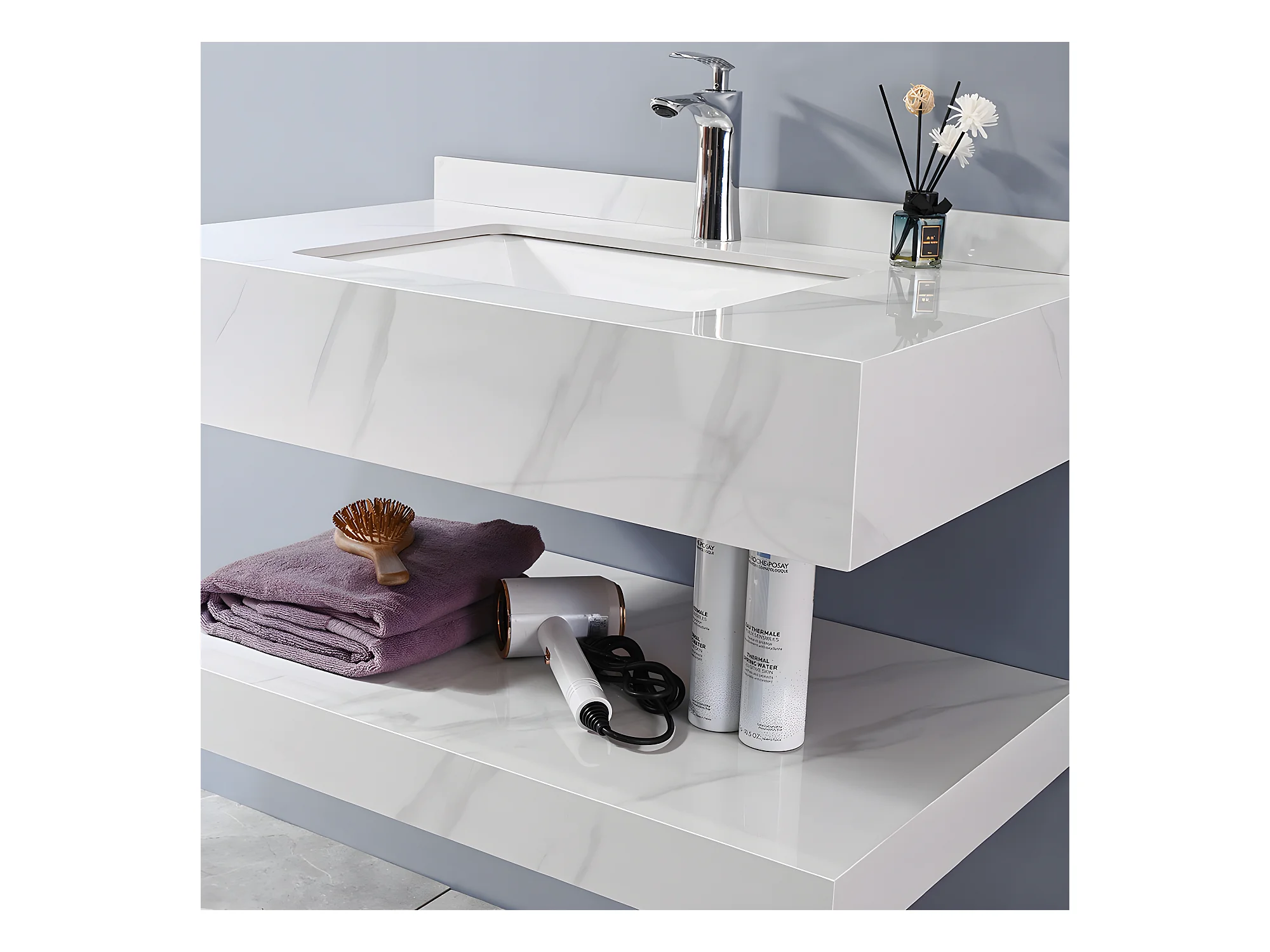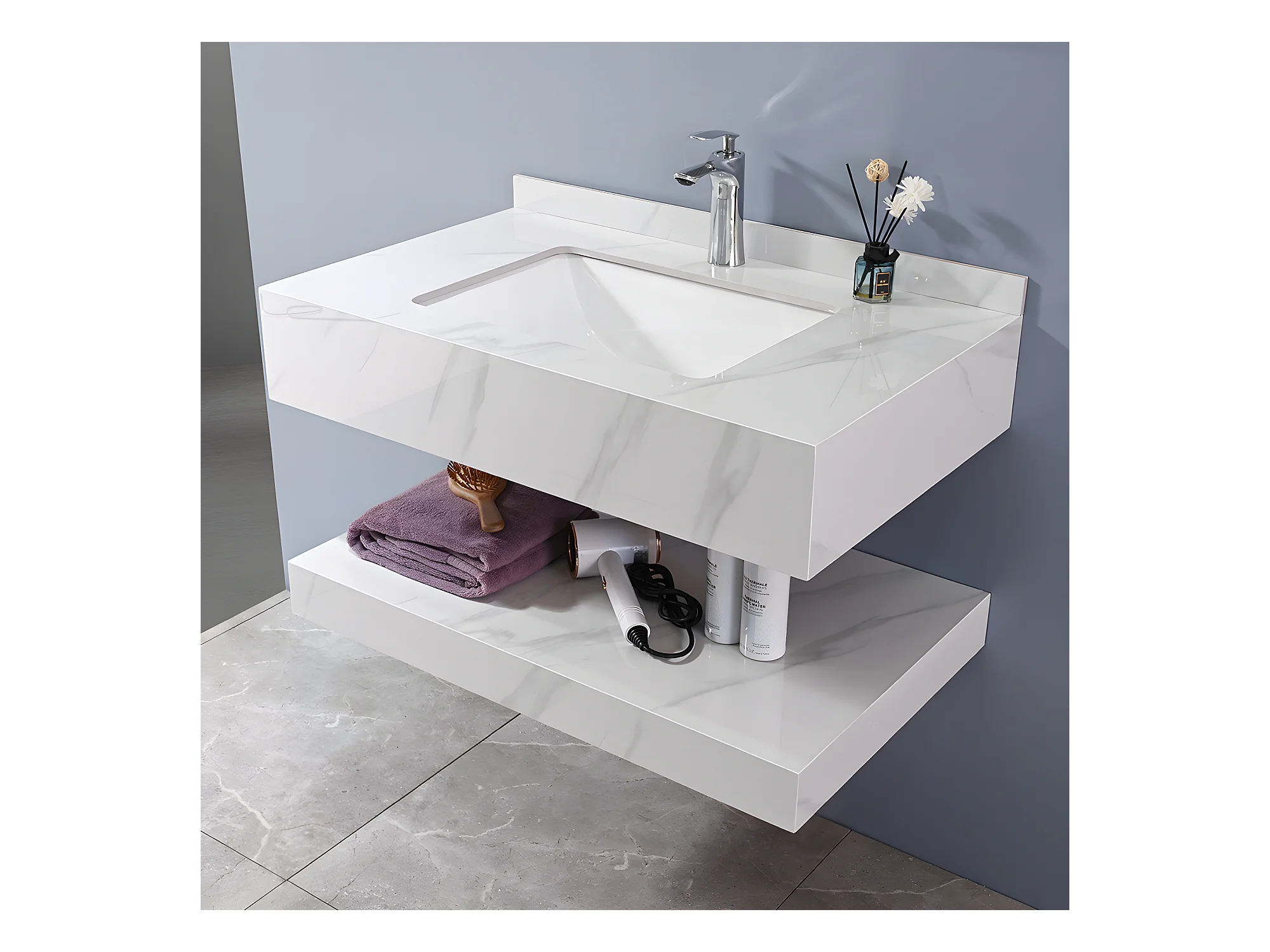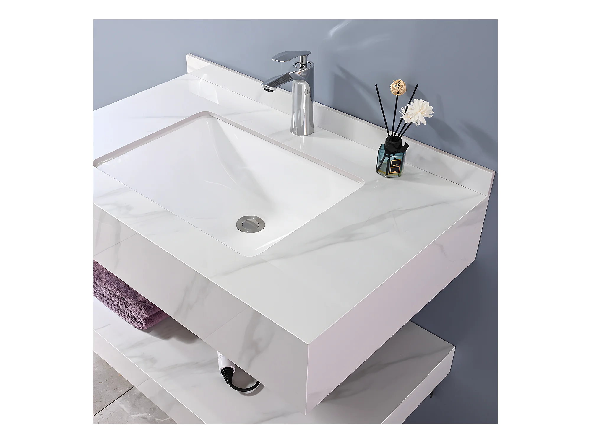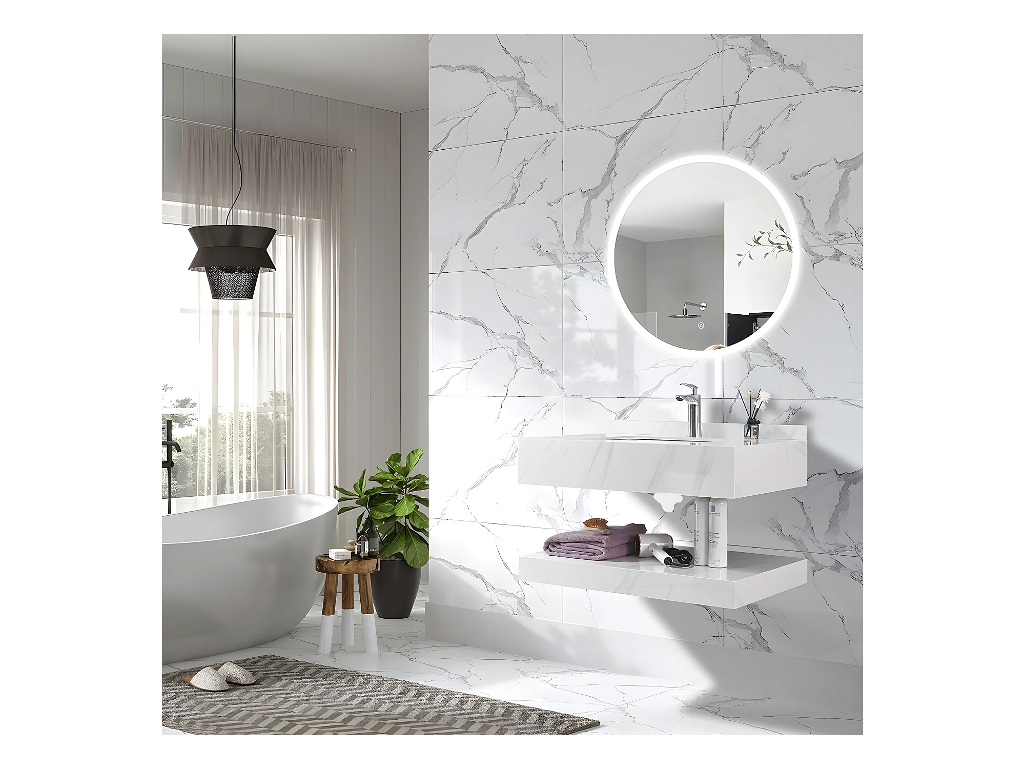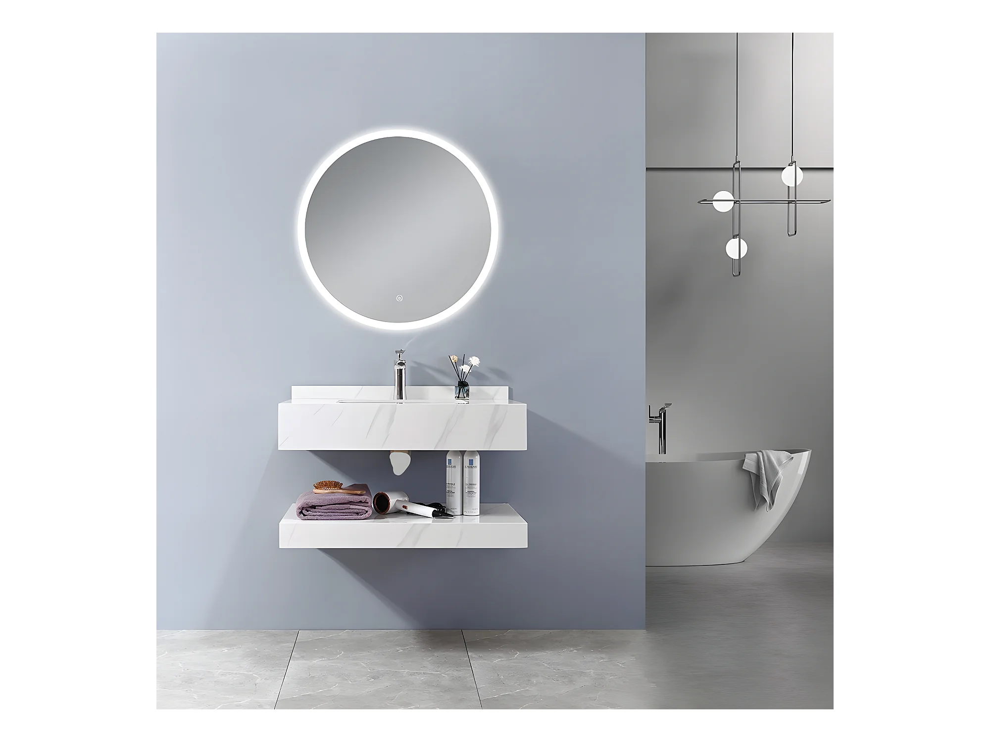 LuxuryBain - Meuble de salle de bain simple vasque 100cm effet marbre blanc avec miroir led