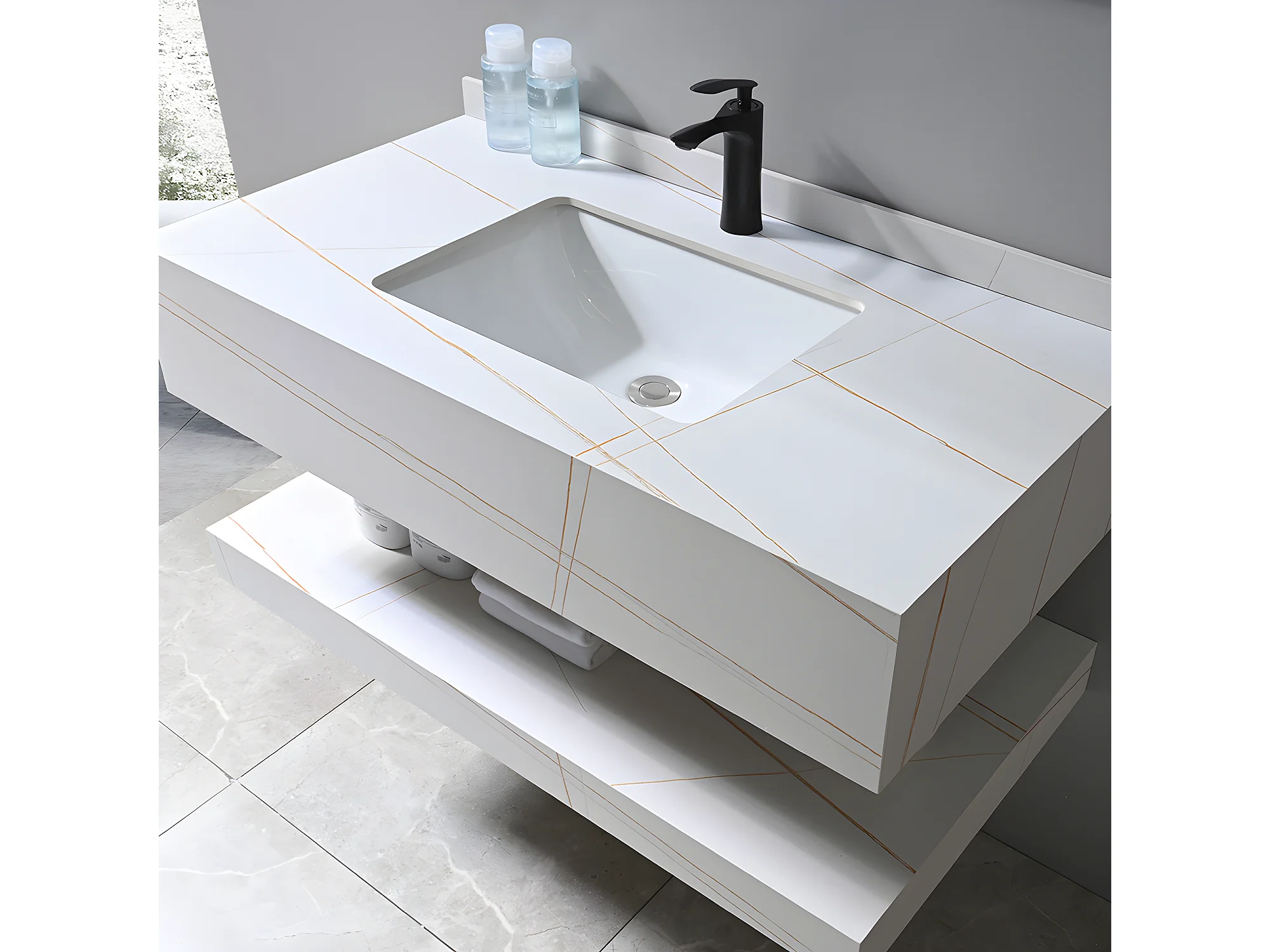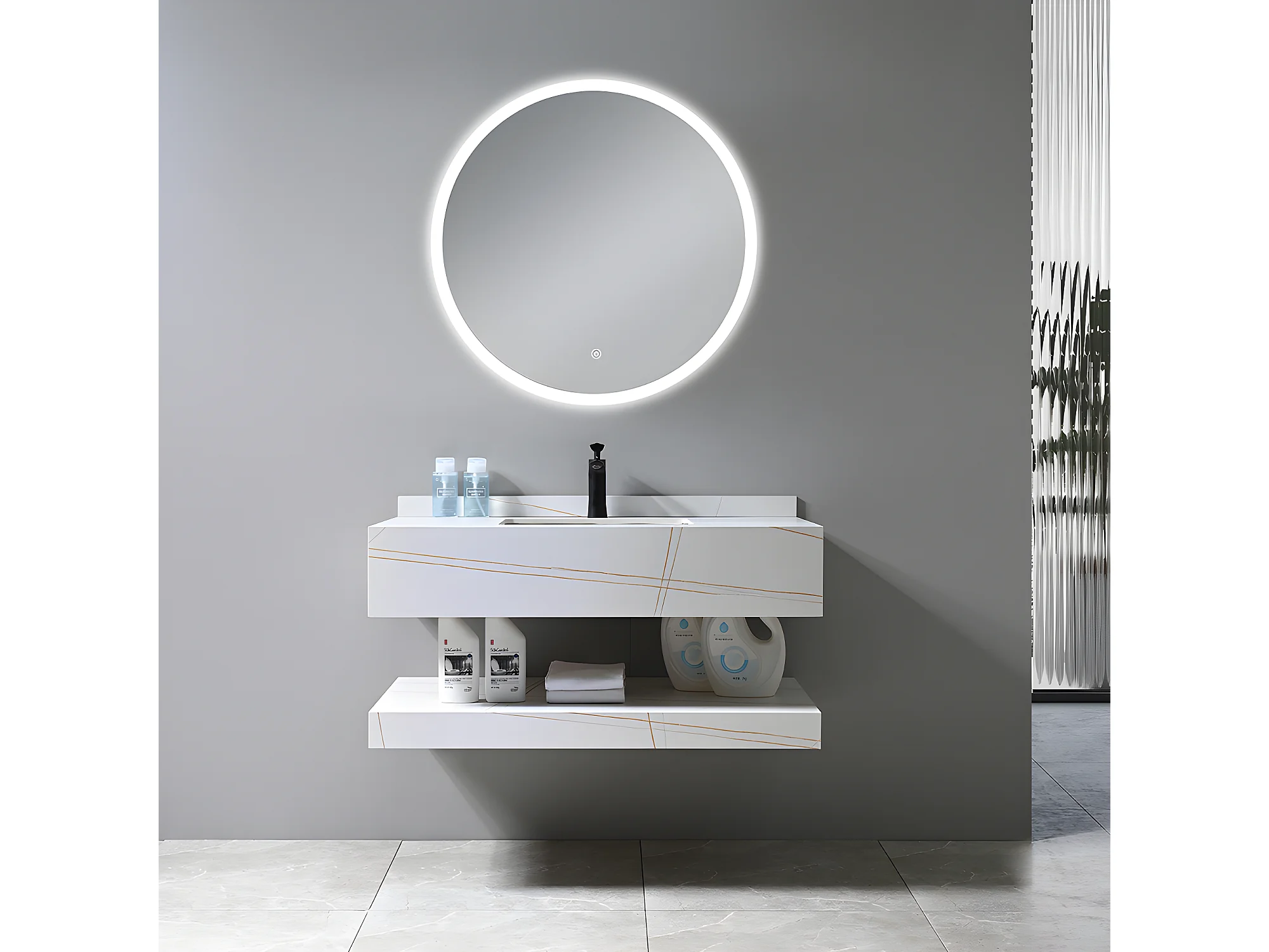 LuxuryBain - Meuble de salle de bain simple vasque 100cm effet marbre blanc et doré avec miroir led