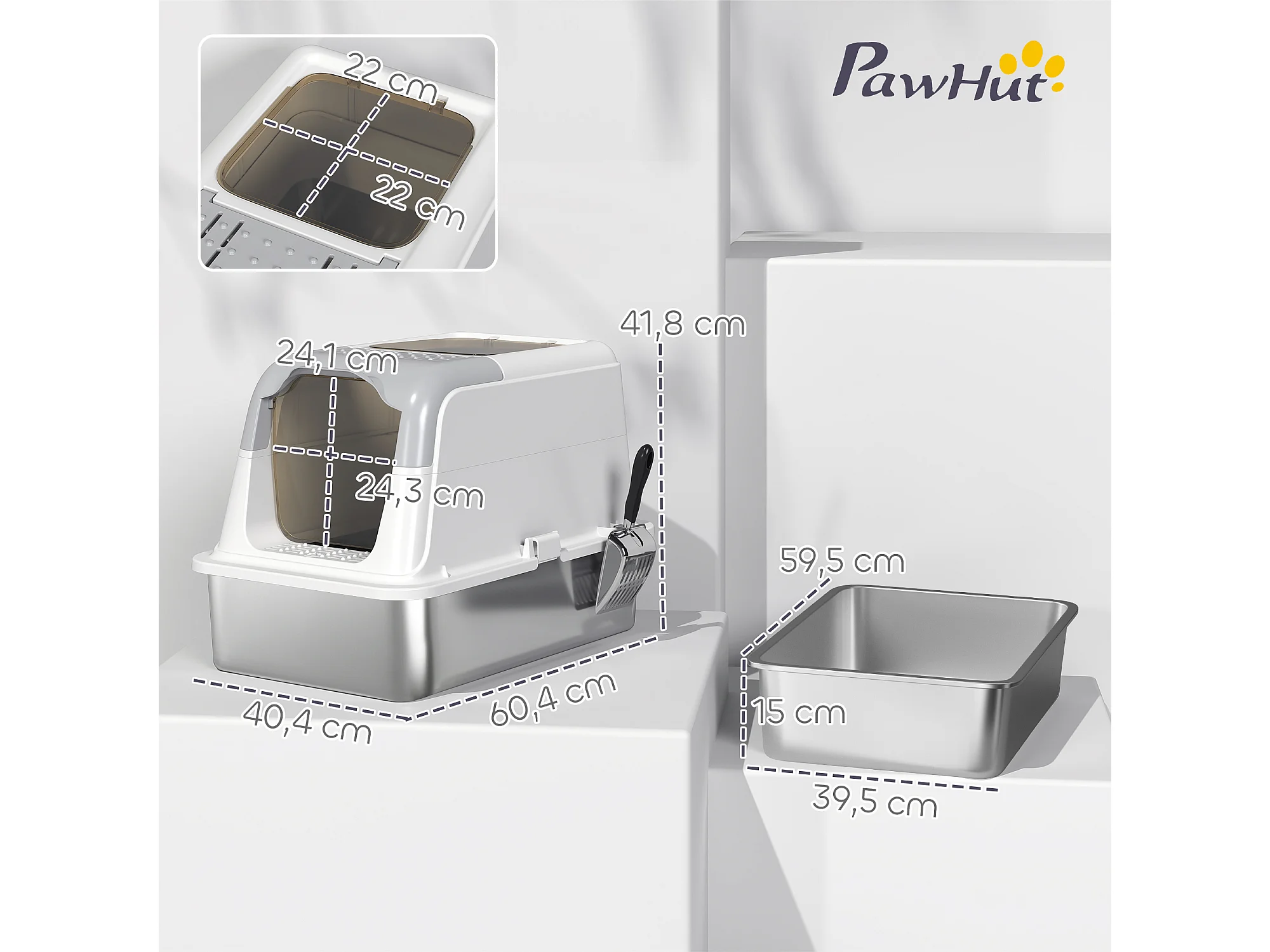 Maison de toilette bac à litière fermé acier inox - pelle, 2 portes, désodorisant - blanc