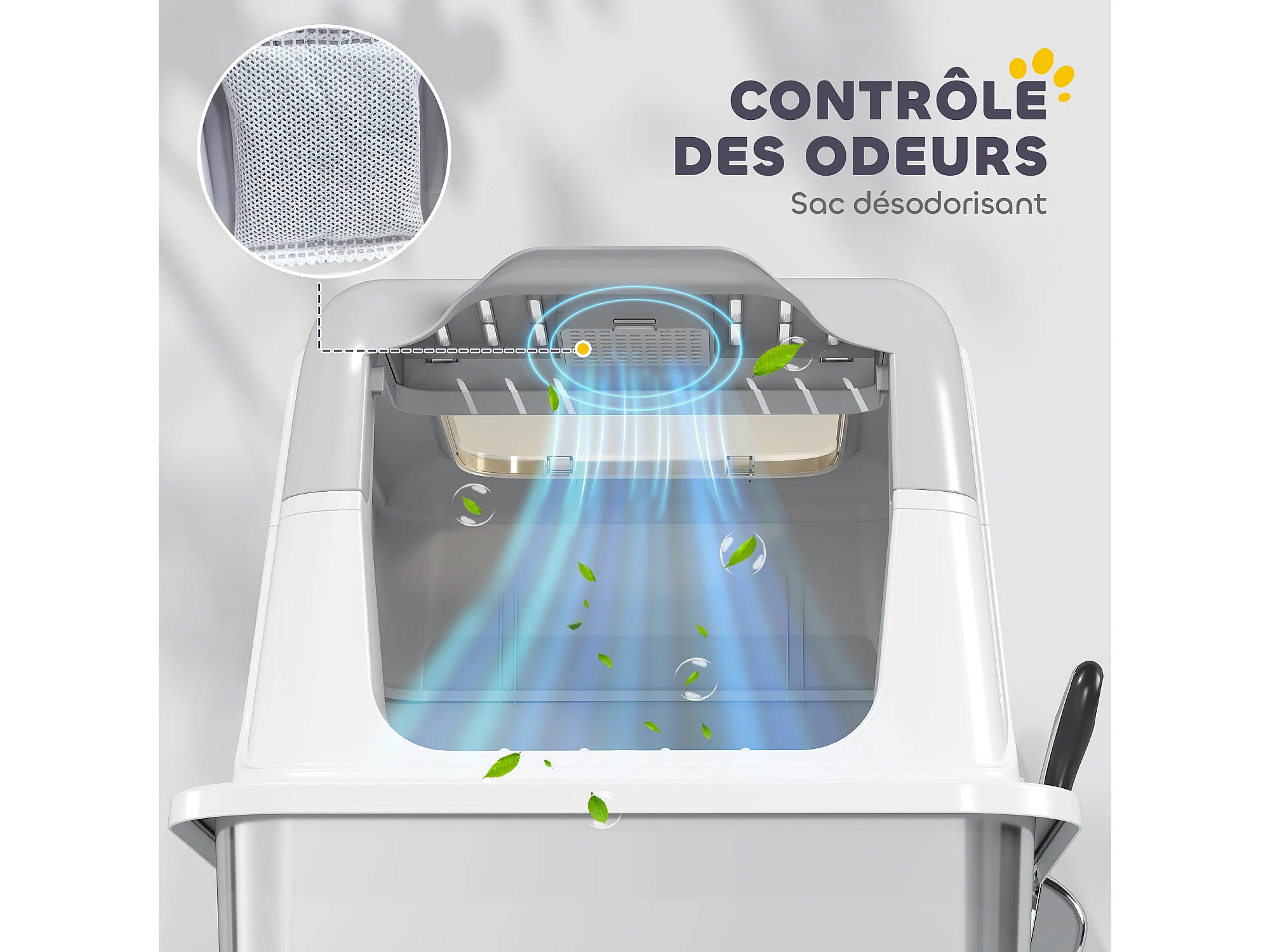 Maison de toilette chat design maisonnette - pelle, 2 désodorisants, plateau coulissant intégrés - blanc vert