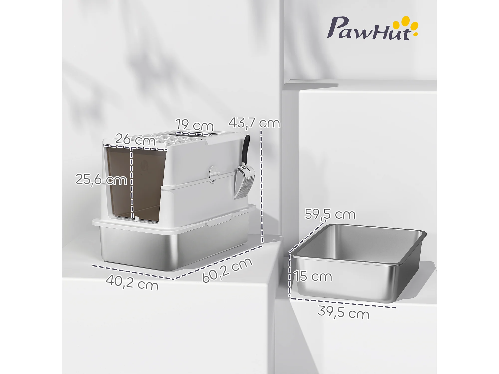 Maison de toilette litière pour chat double porte battante et supérieure - pelle incluse - blanc gris