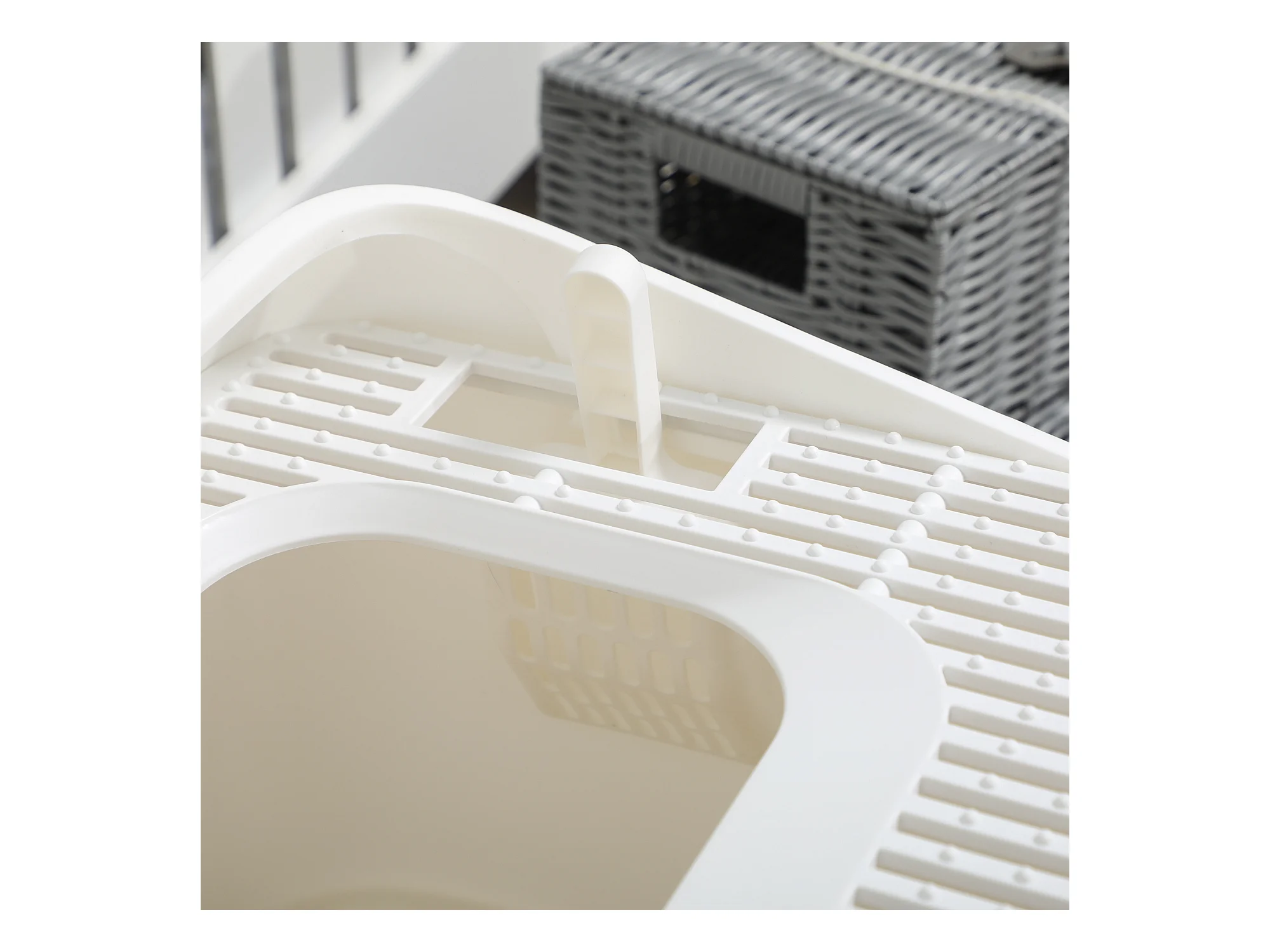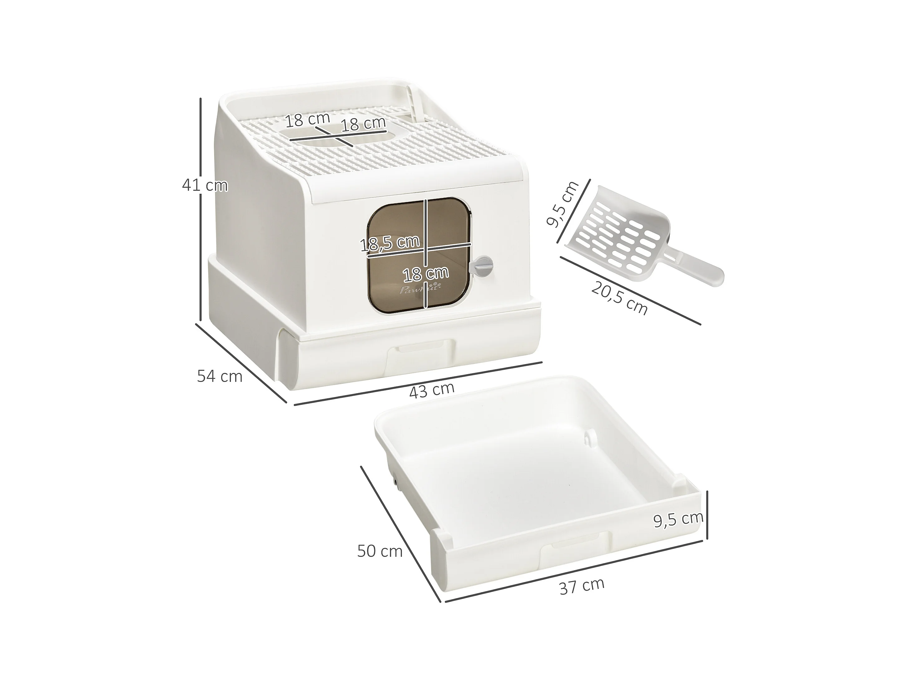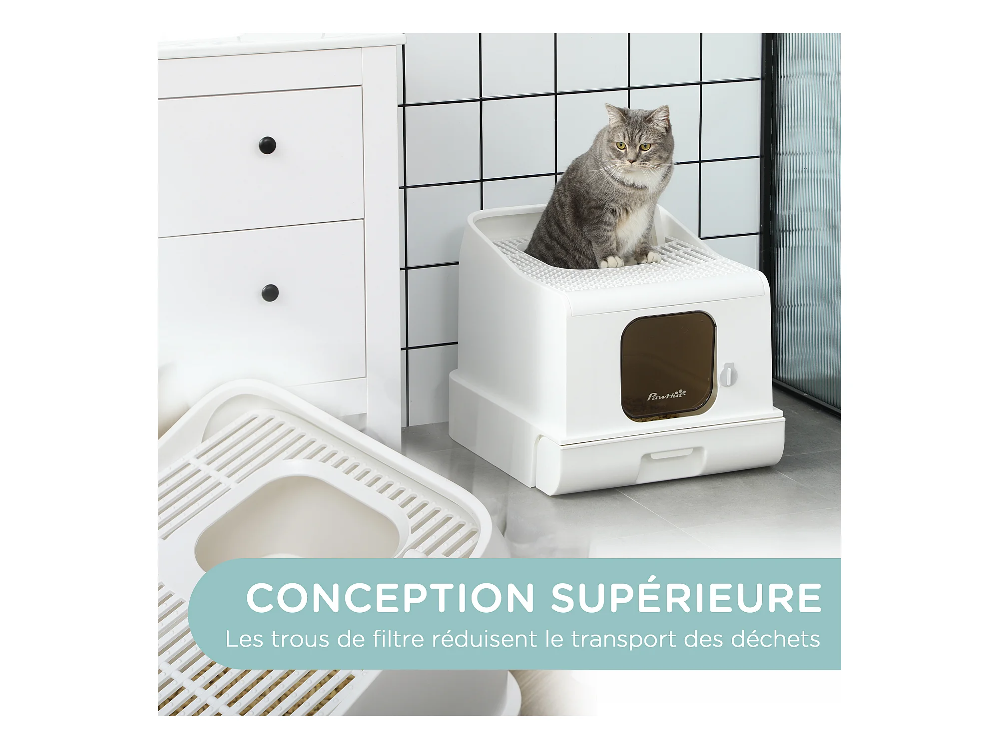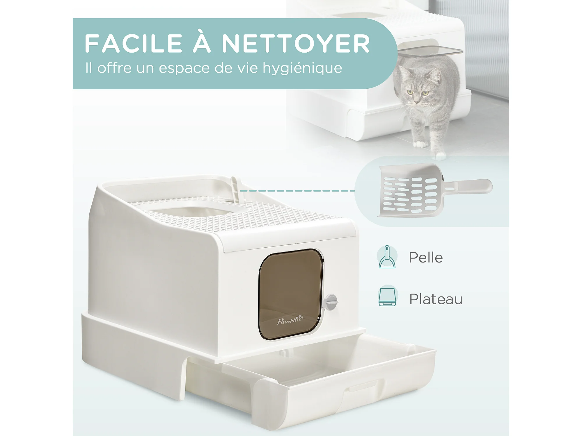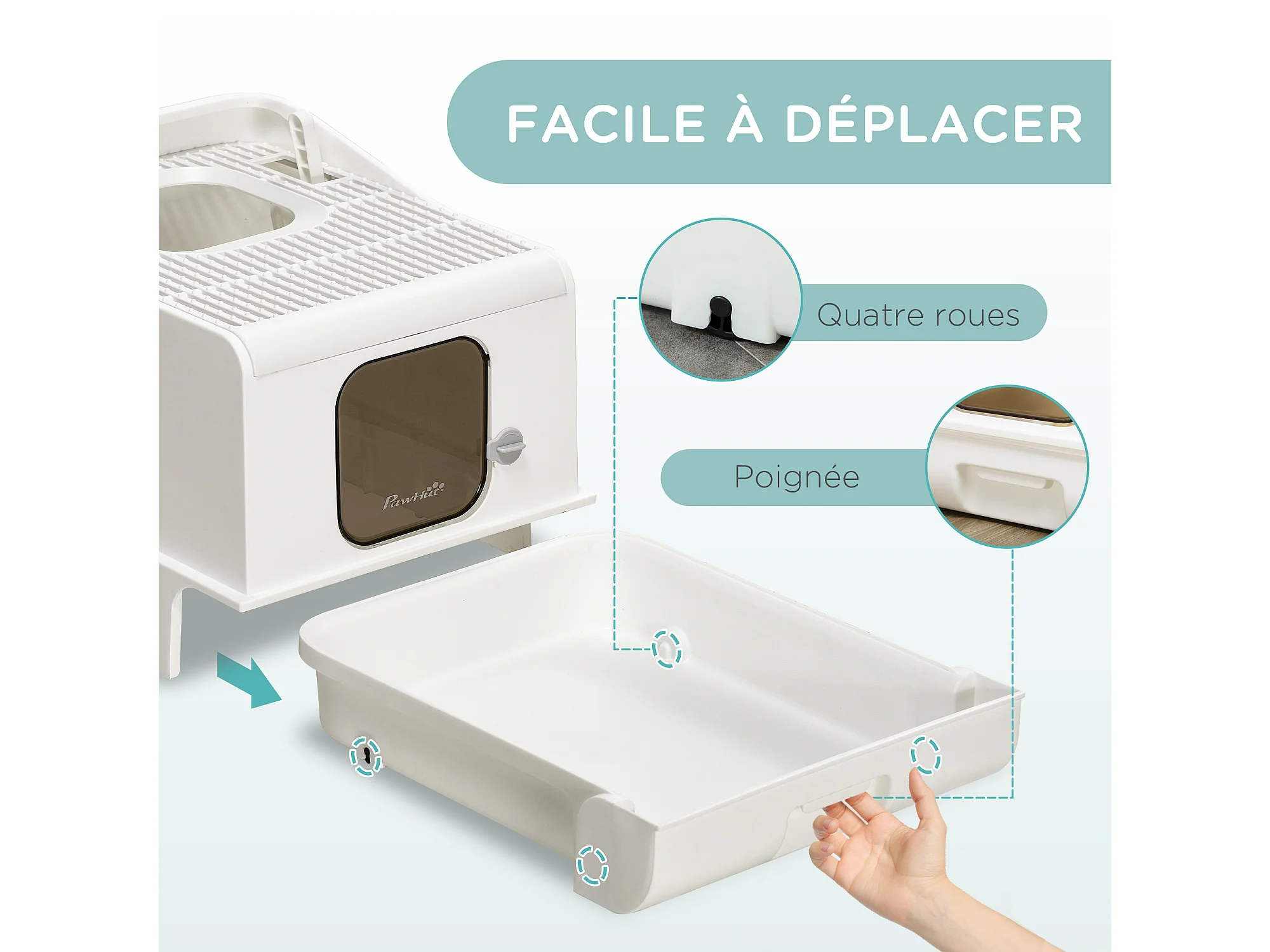 Maison de toilette chat bac à litière 2 portes - pelle, bac amovible, roulettes, poignée - PE blanc