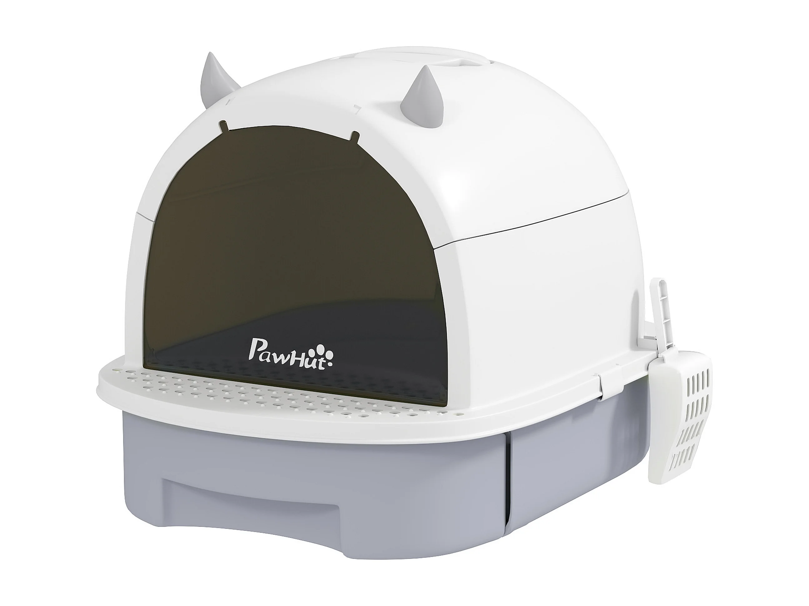 Maison de toilette chat design - porte fumée, pelle, 2 sacs désodorisation, tiroir litière coulissant, poignée - blanc gris