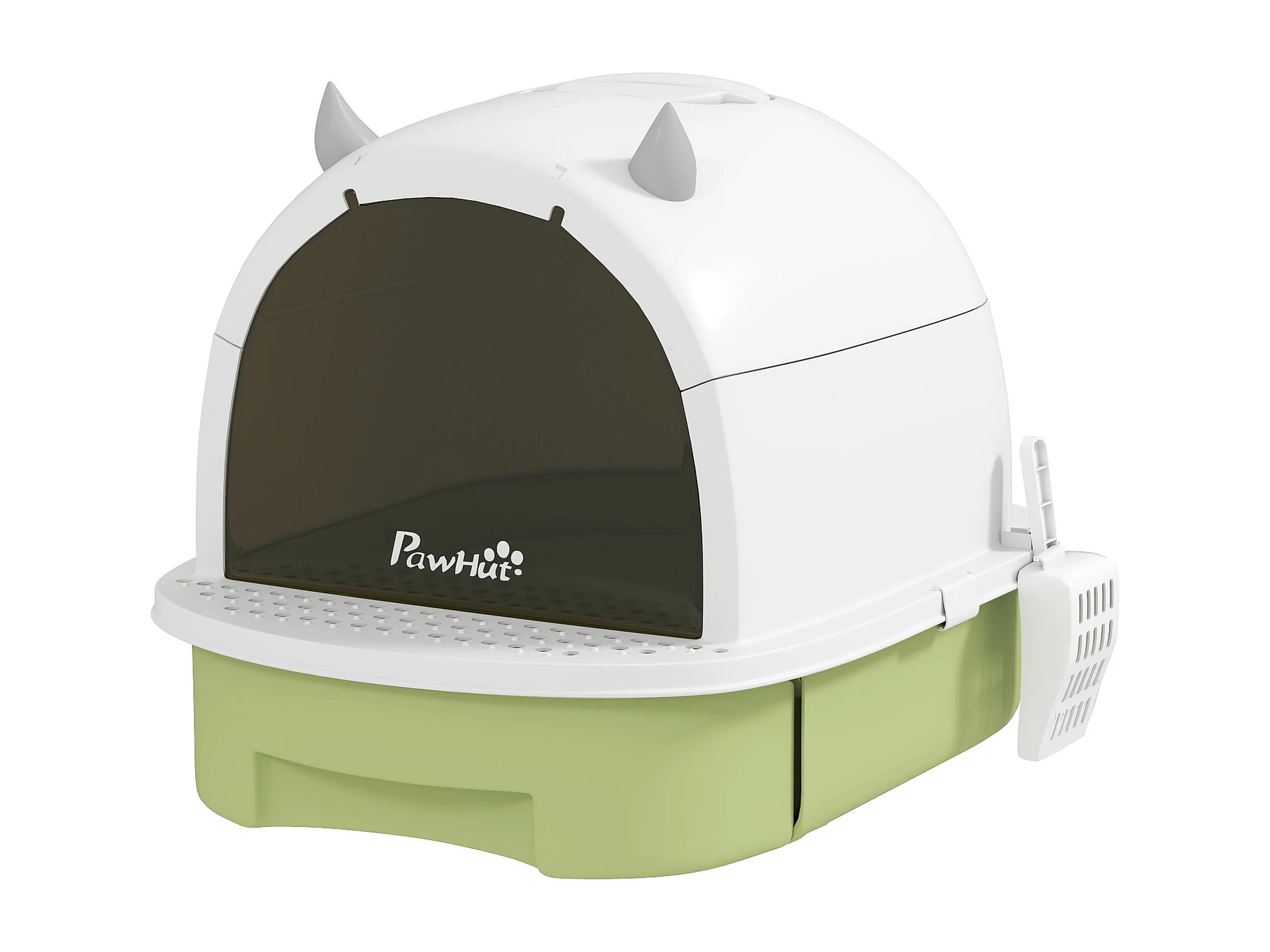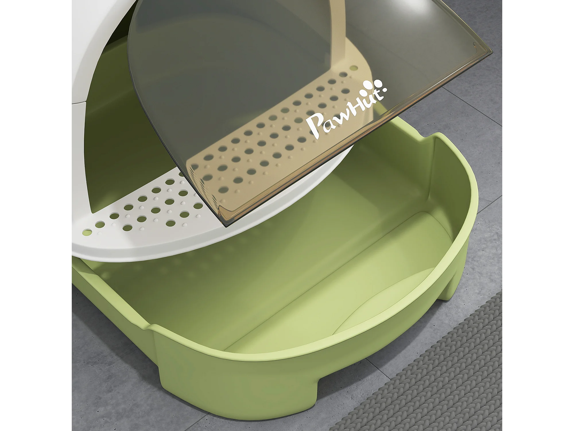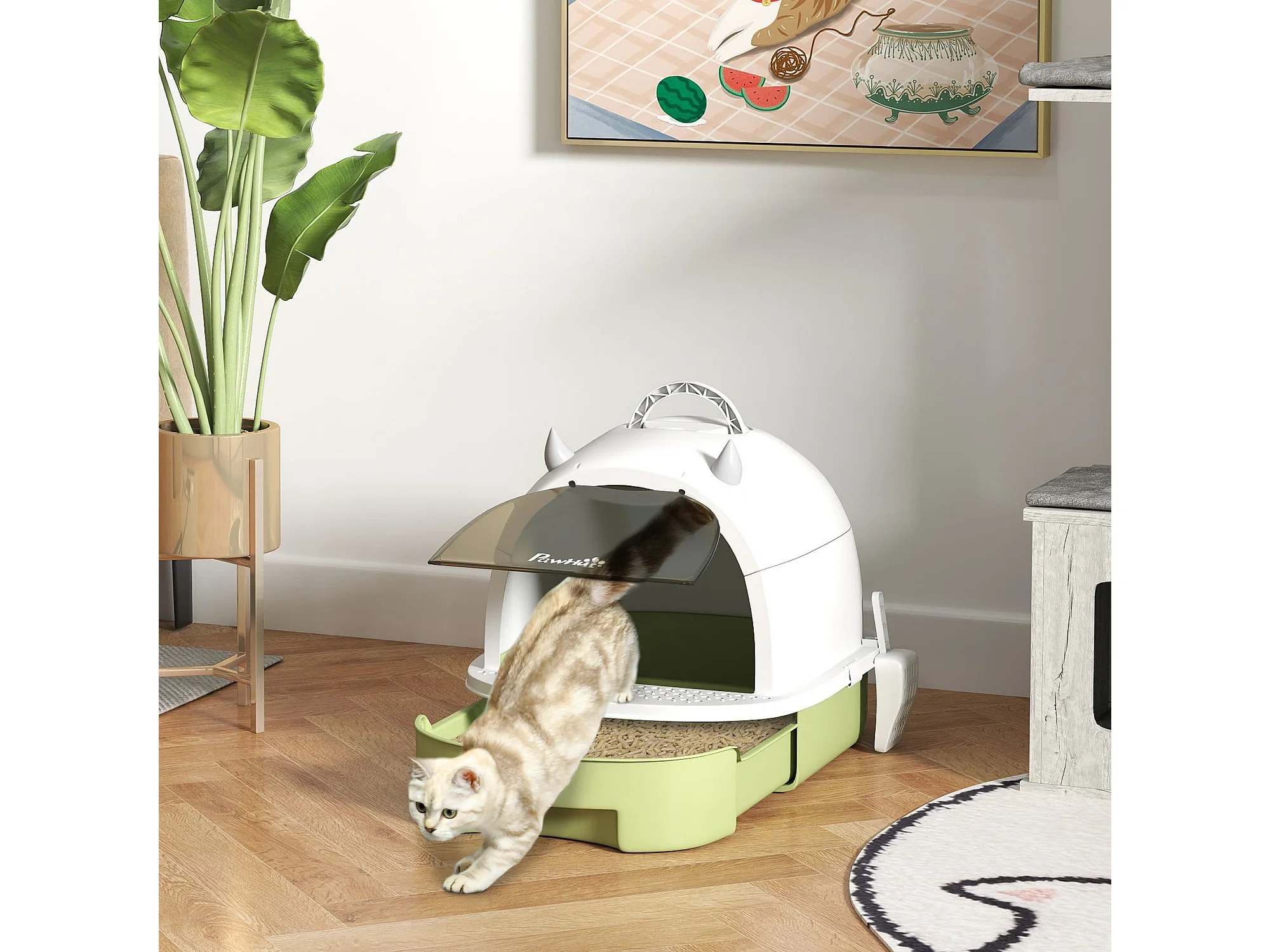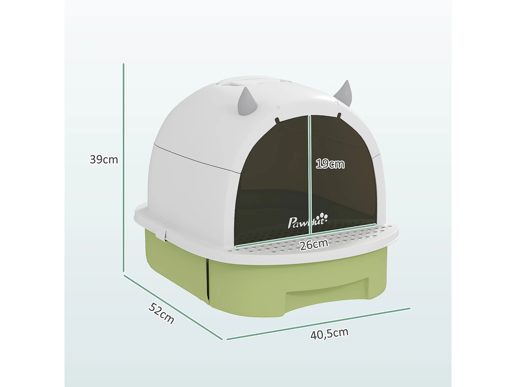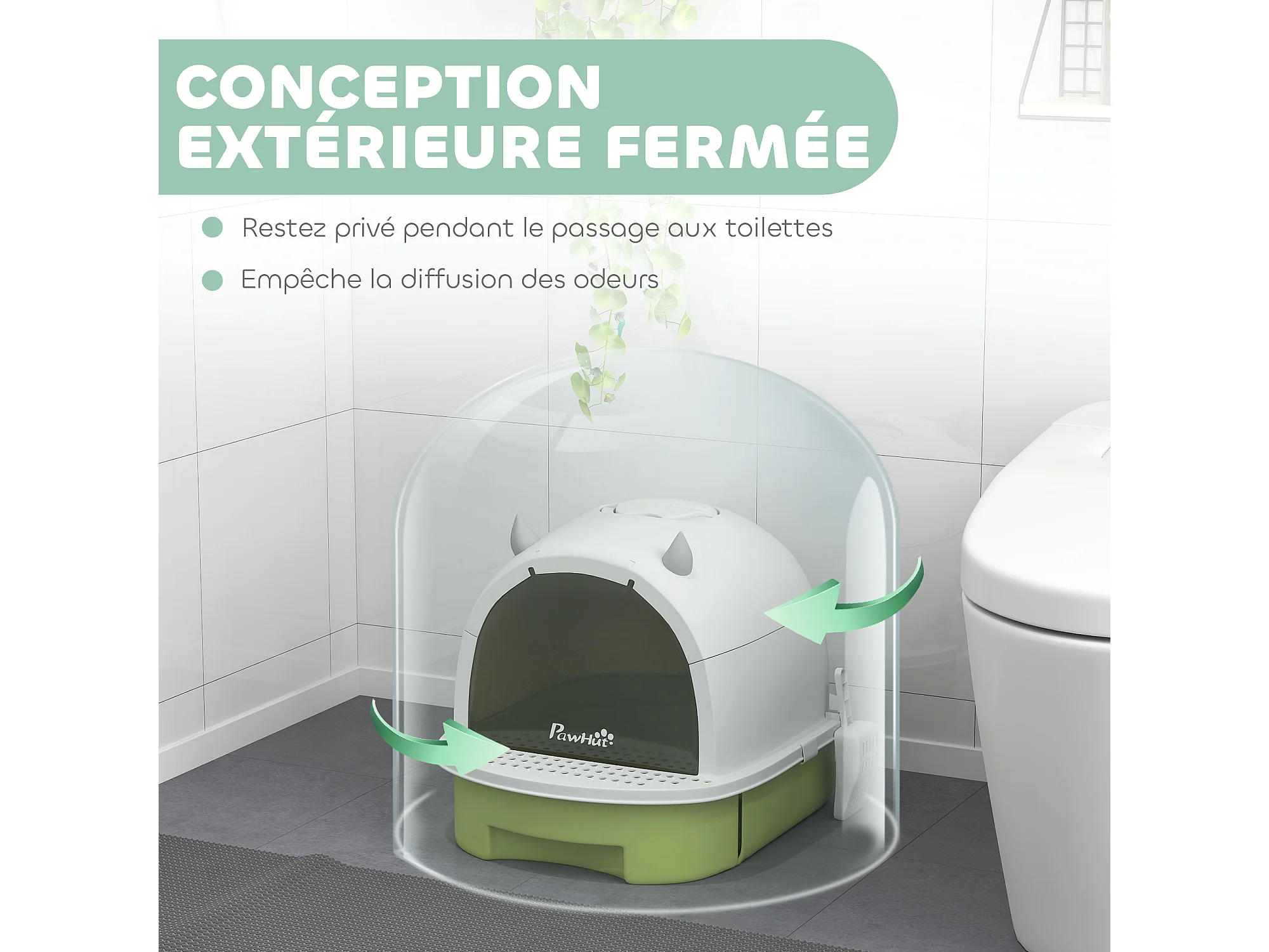 Maison de toilette chat design - porte fumée, pelle, 2 sacs désodorisation, tiroir litière coulissant, poignée - blanc vert