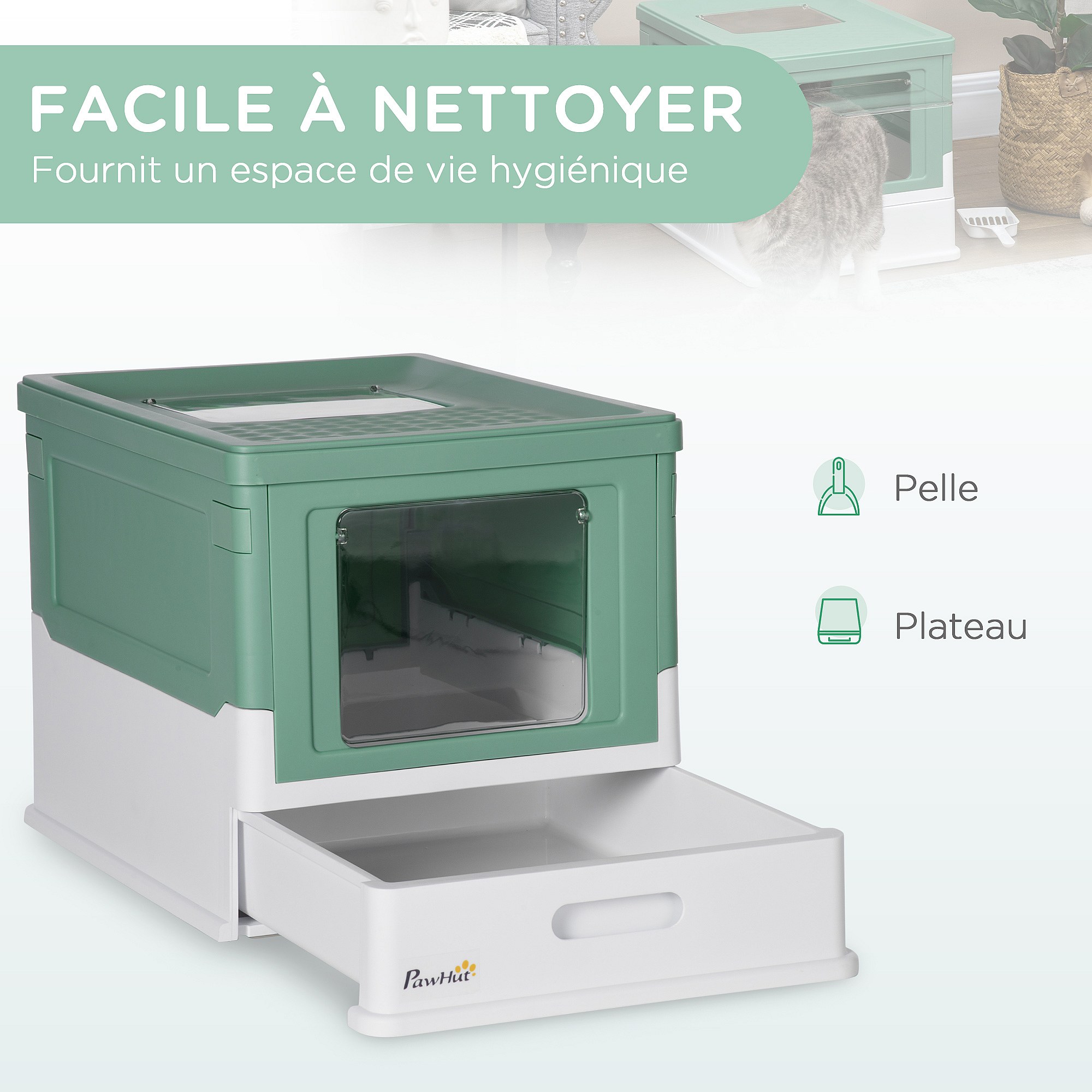 Maison de toilette pliable pour chat - tiroir à litière coulissant, porte battante et trappe transparente, pelle - blanc vert