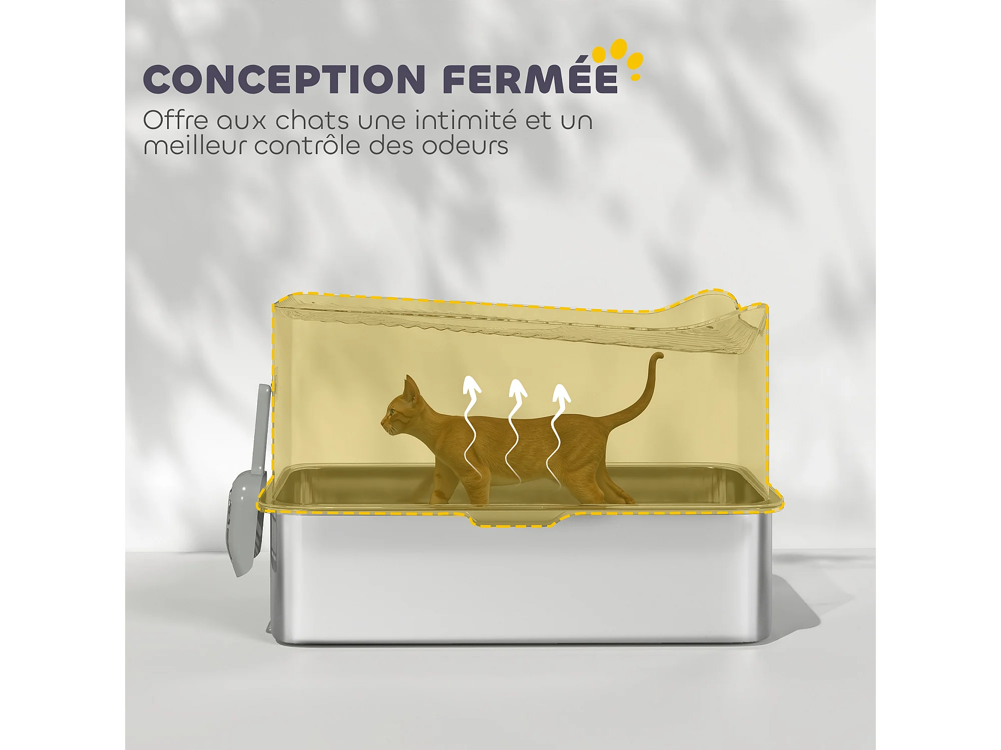 Maison de toilette bac à litière fermé acier inox - pelle, couvercle amovible, porte, anti-fuite - gris clair