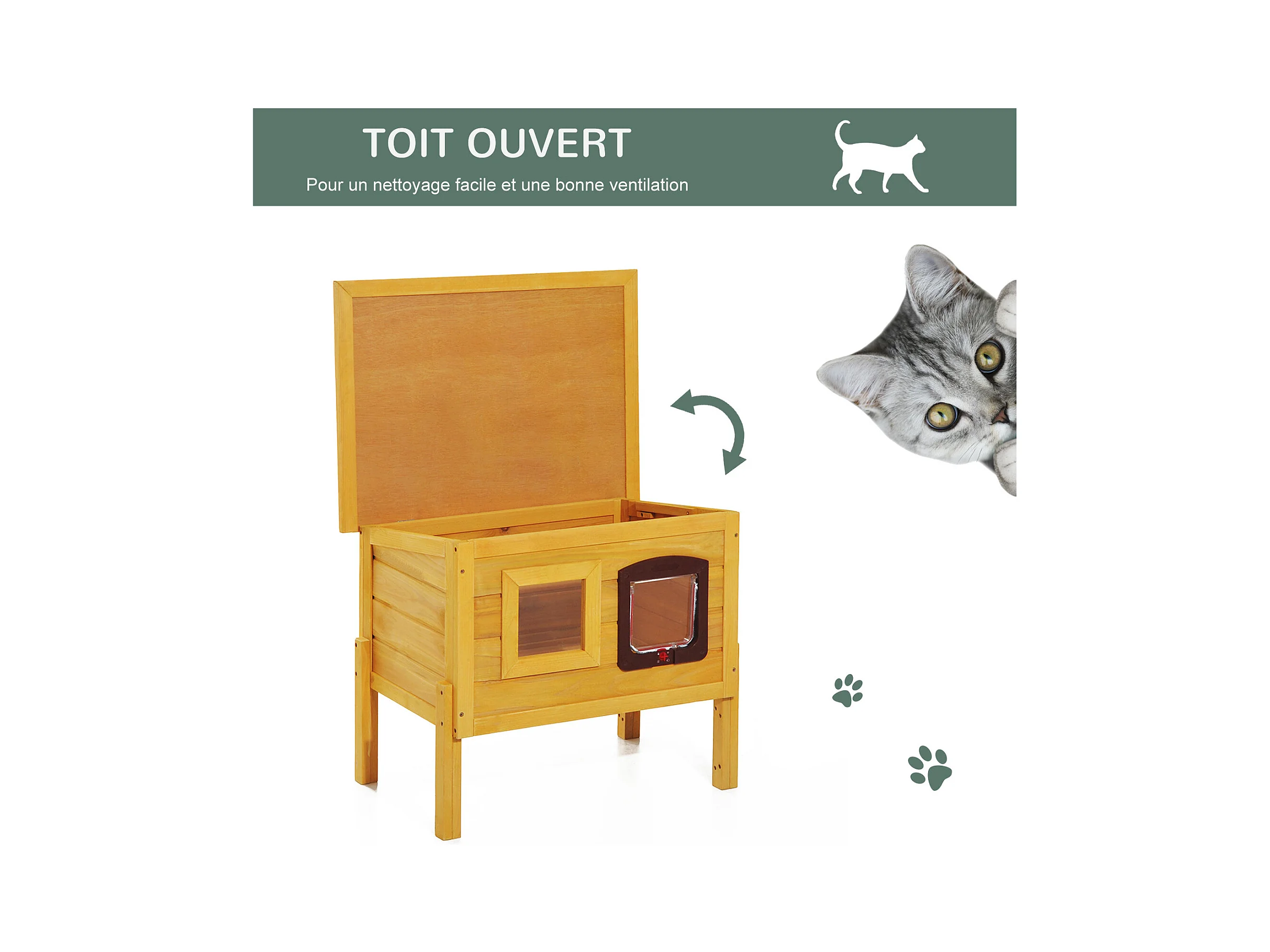 Maison niche pour chat sur pied toit bitumé ouvrant porte fenêtre bois verni