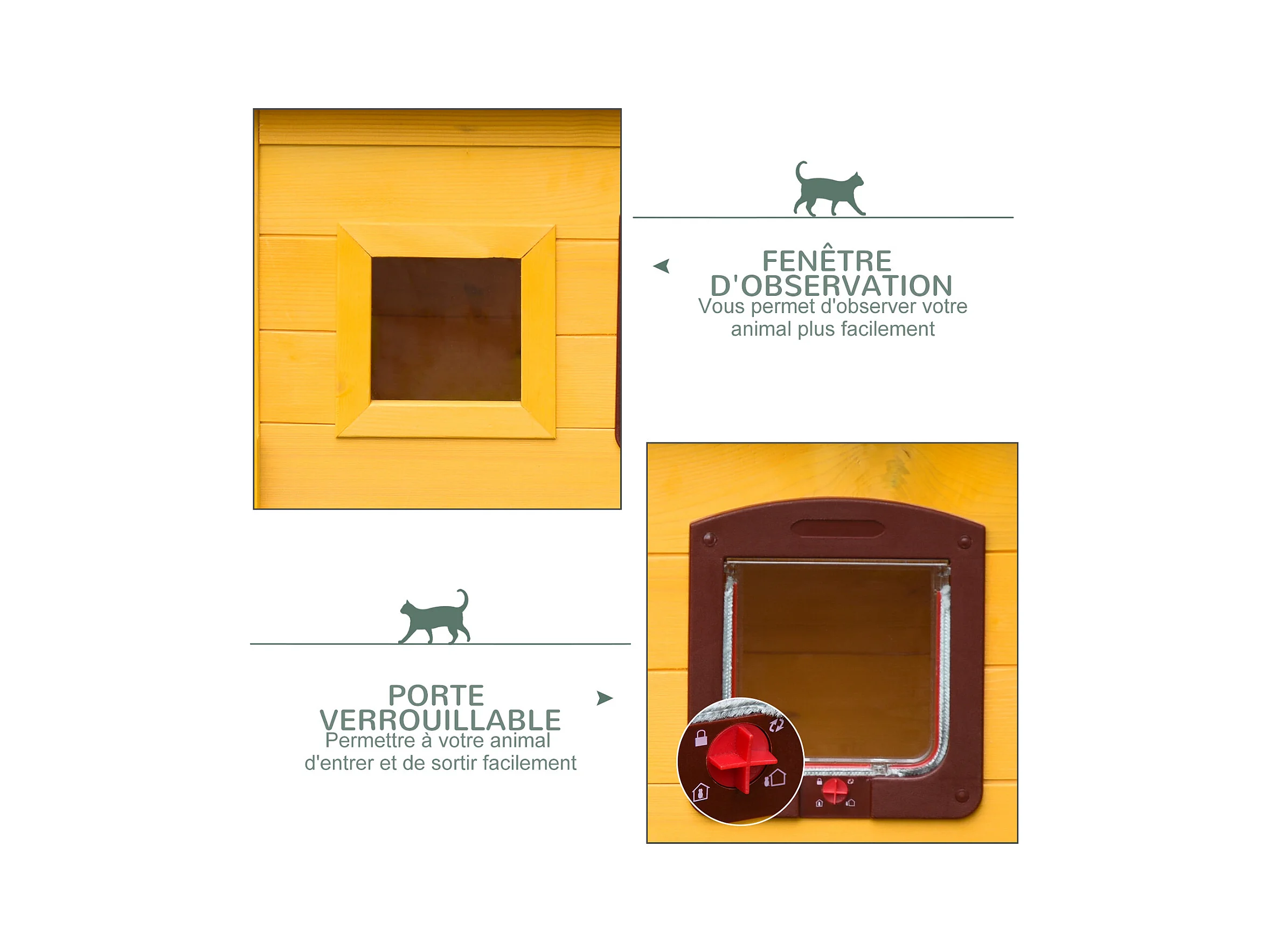 Niche maison pour chat - porte à lamelles, fenêtre plexiglas, toit bitumé ouvrant, 3 portes - bois gris