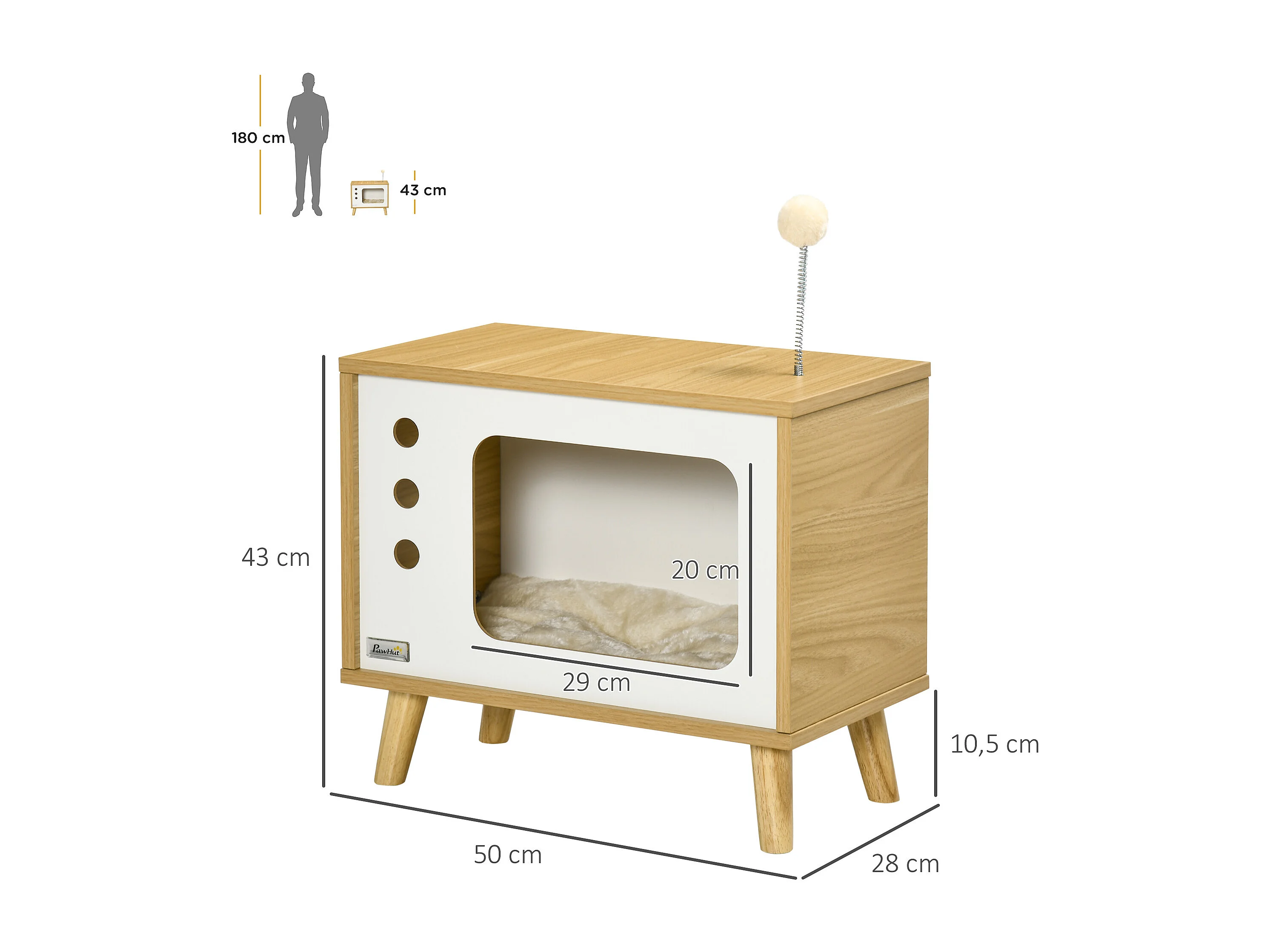 Maison pour chat design poste de télévision - niche chat panier chat - 2 coussins amovibles, boule à ressort - panneaux aspect bois clair blanc